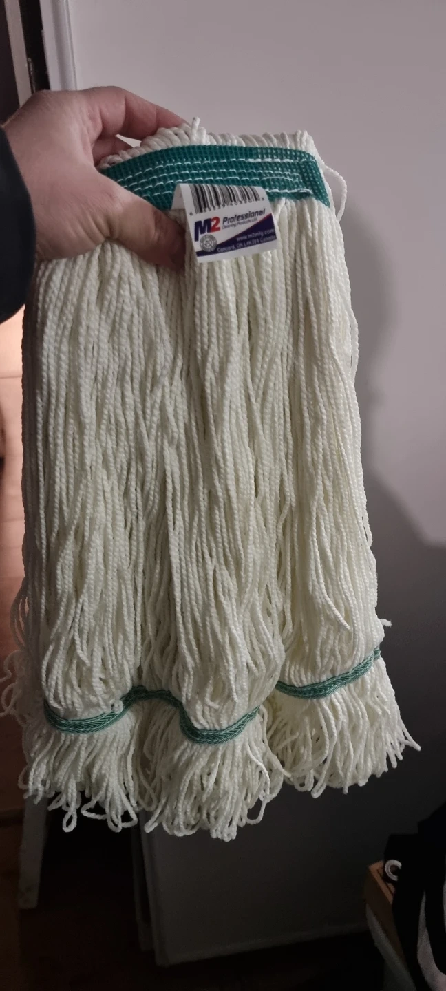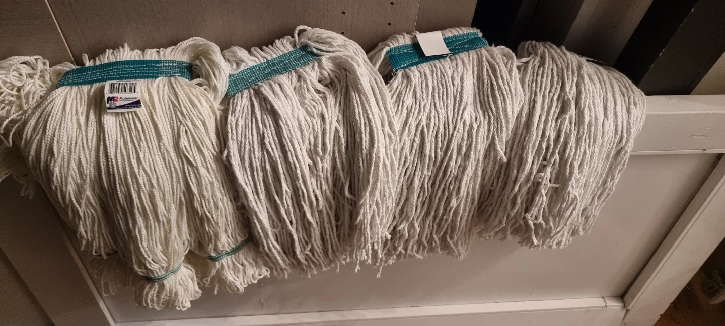 4 replacement mop heads for commercial cleaning. Made of white cotton yarn, one is synthetic.