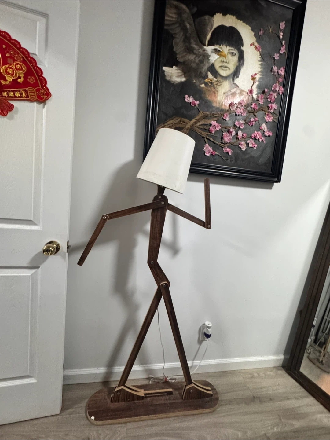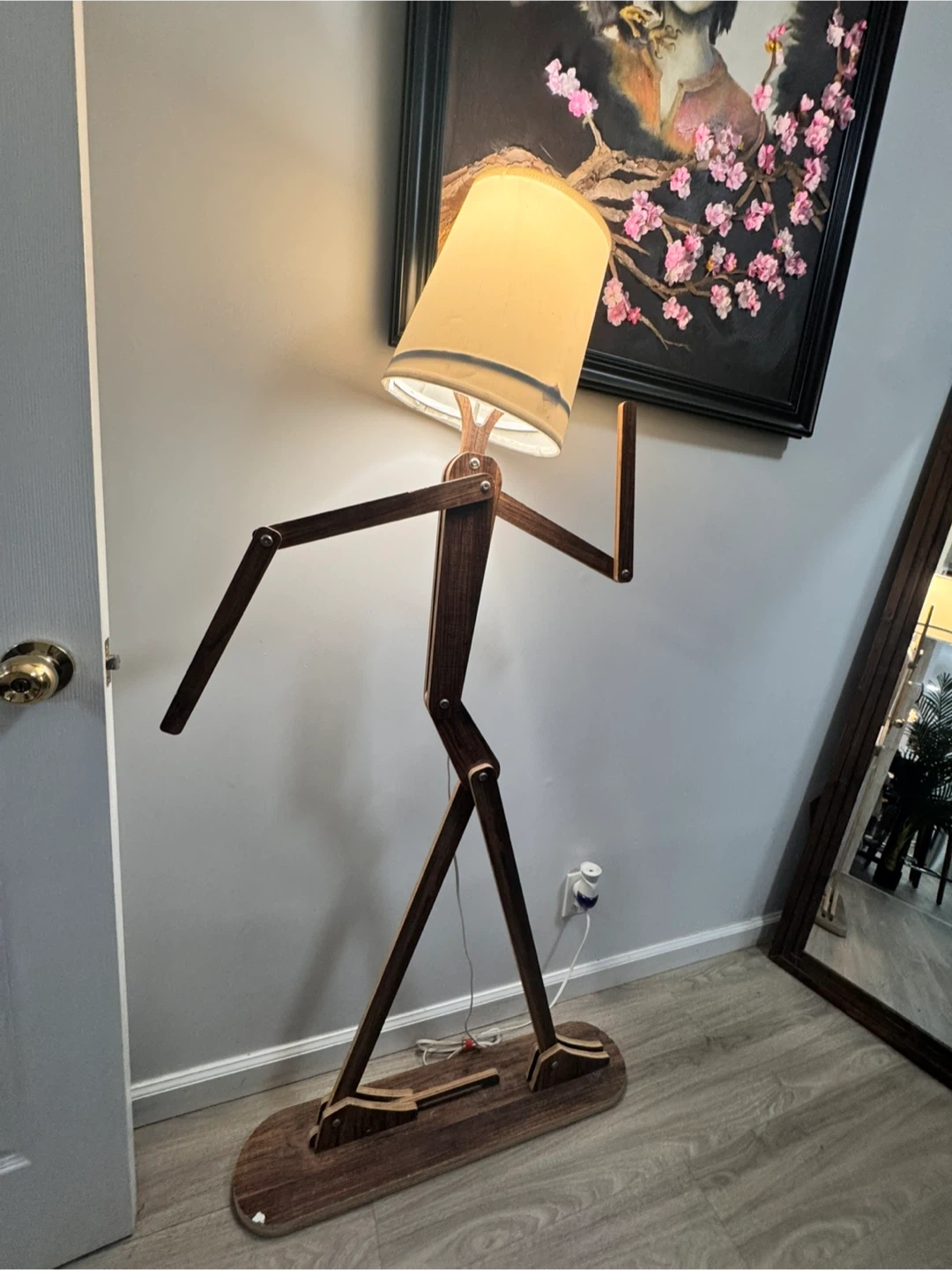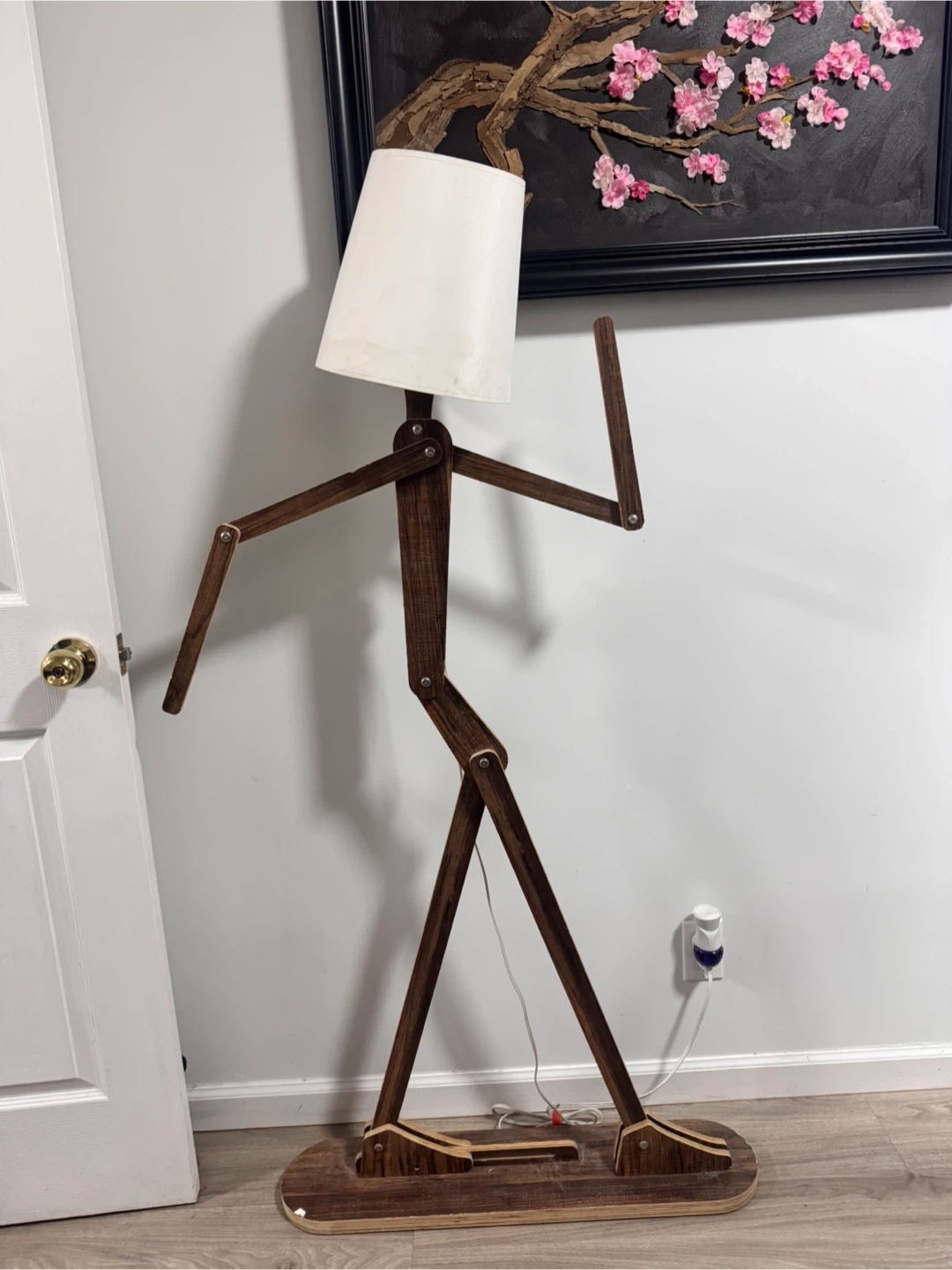 Unique articulated wooden floor lamp designed to resemble a person. It's made of dark wood with adjustable limbs. Includes a neutral lampshade. You can adjust the post however you want. Like skateboarding ๐น