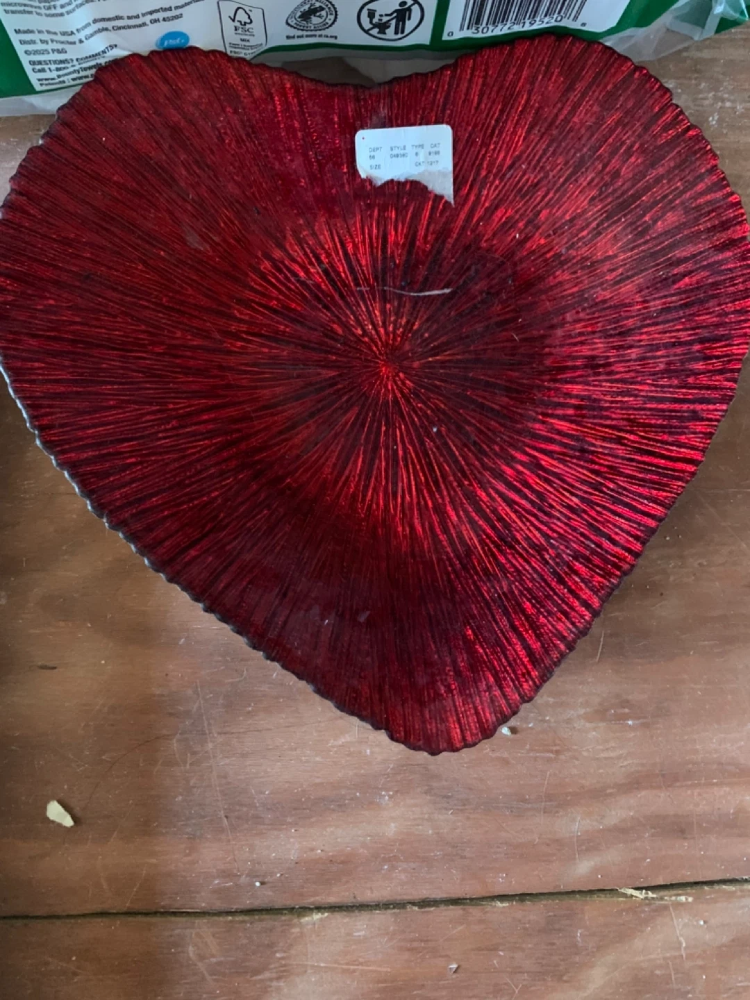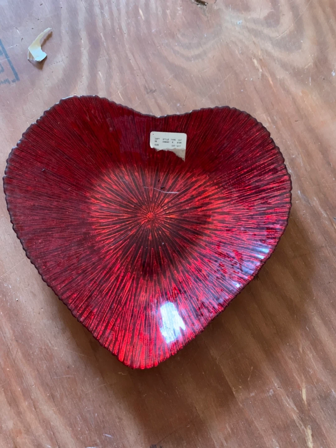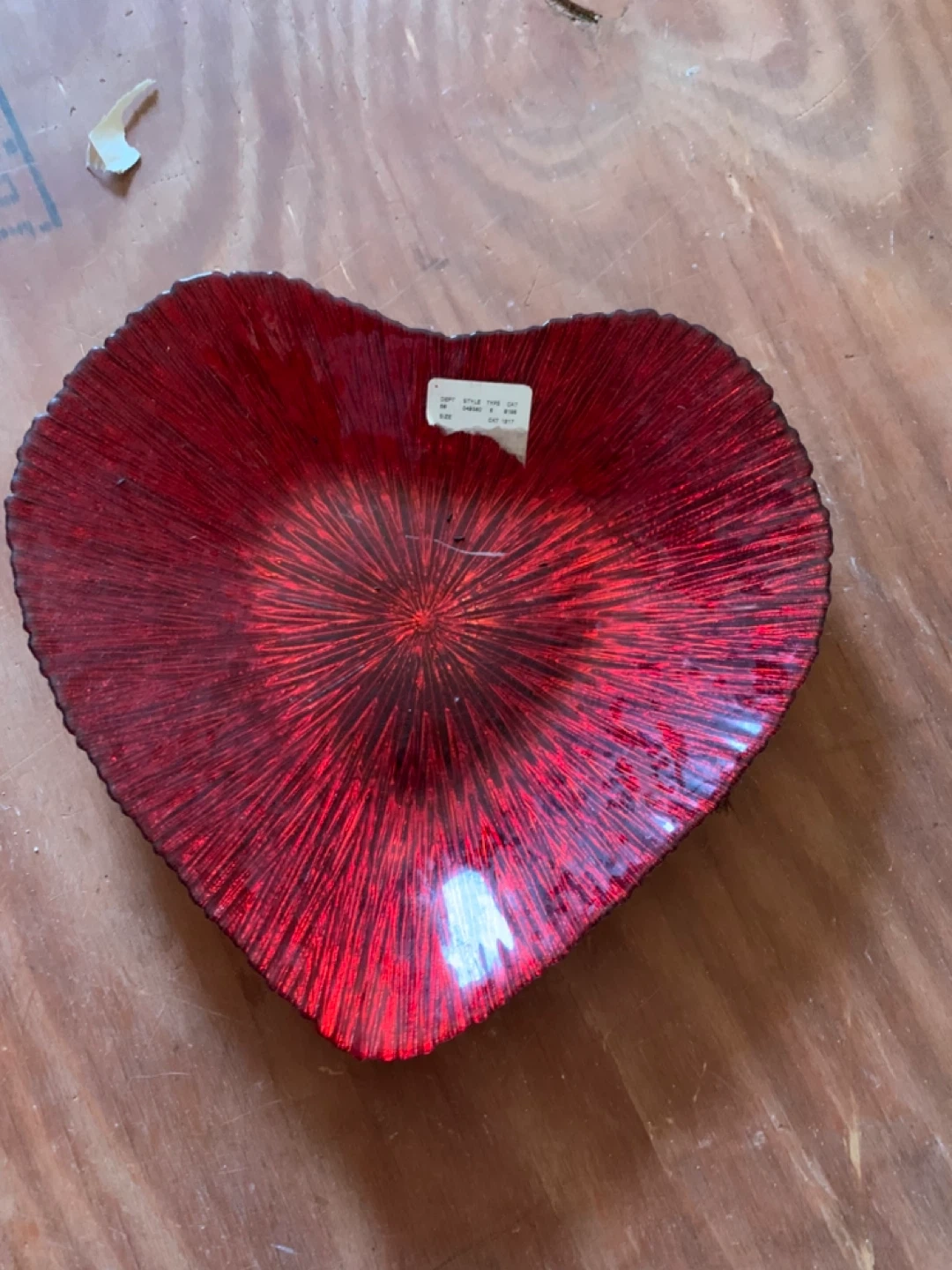 This is a decorative bowl shaped like a heart. It's a vibrant red color with a textured, radial pattern. It's made of glass and would be a nice accent piece!