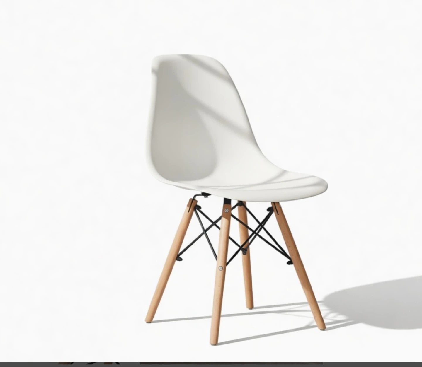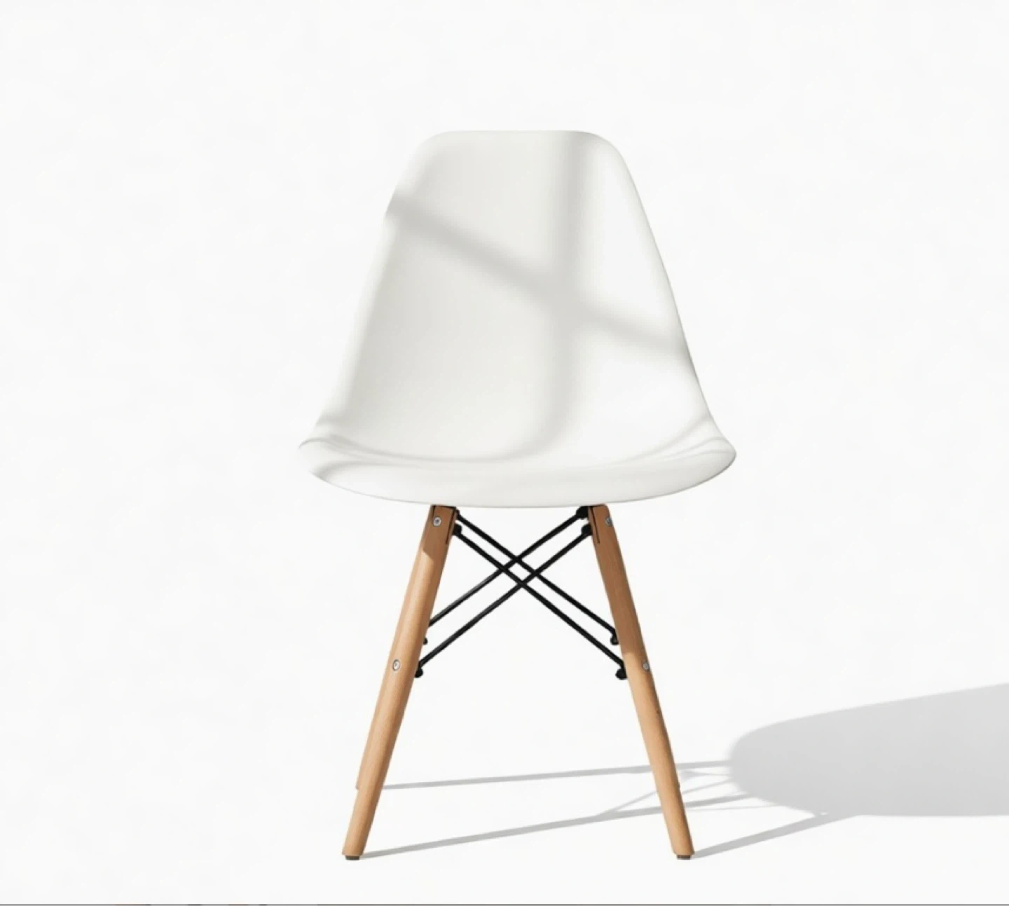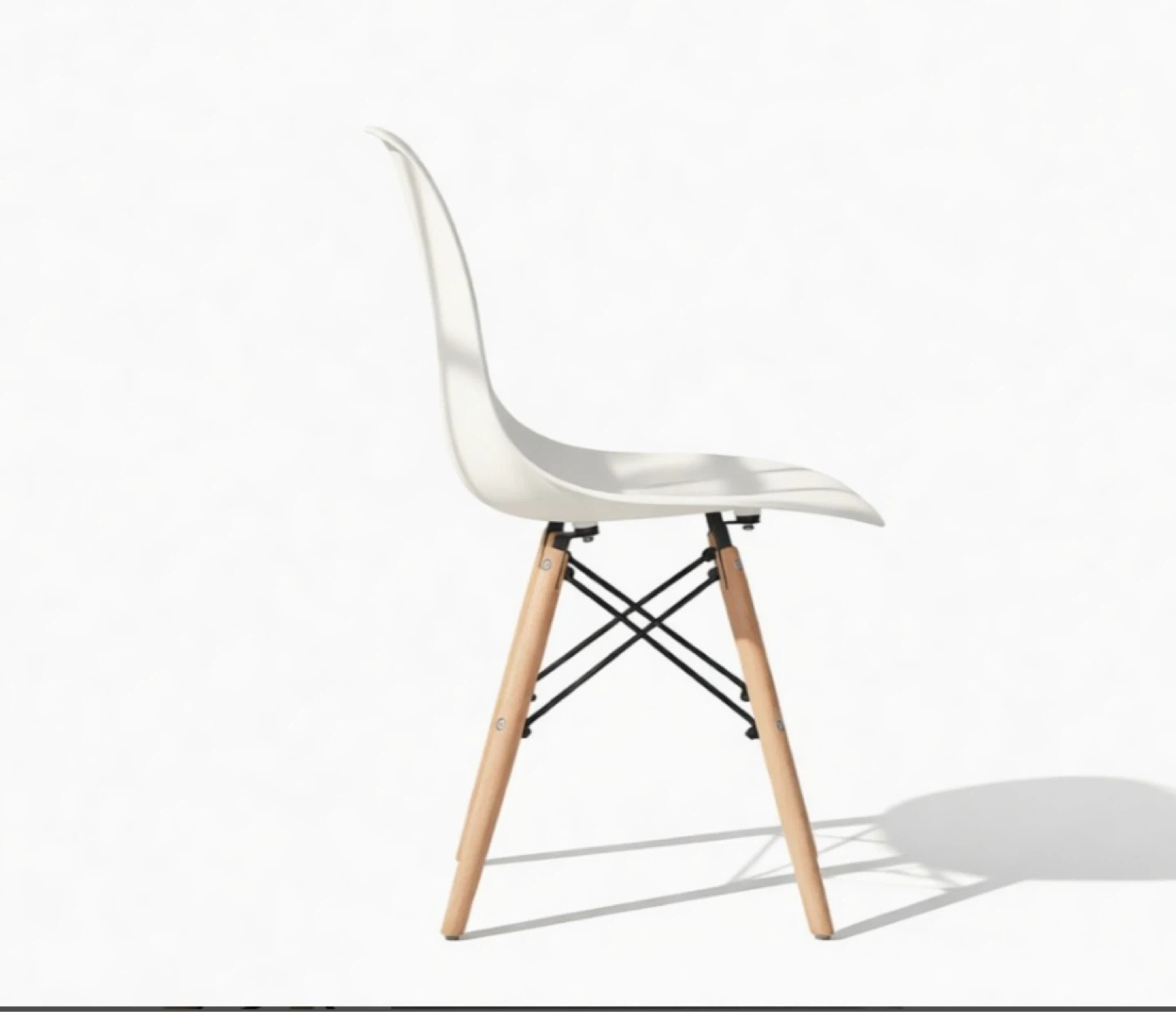 This chair has a molded seat and back with wooden dowel legs. It's made of durable plastic and wood. This chair offers a comfortable seating solution.