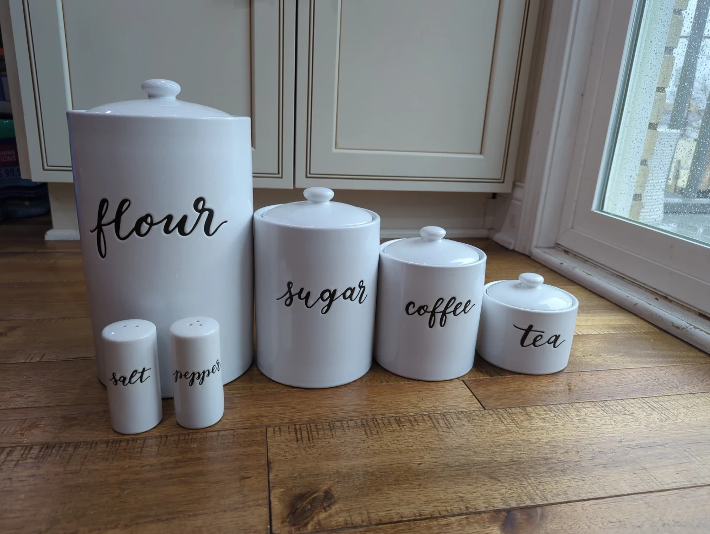 Set of white ceramic kitchen canisters. Includes containers for flour (10 inches tall), sugar (6½ inches tall), coffee (5 inches tall), and tea (3 inches tall), plus salt and pepper shakers. These containers are perfect for organizing your pantry staples and countertop items.