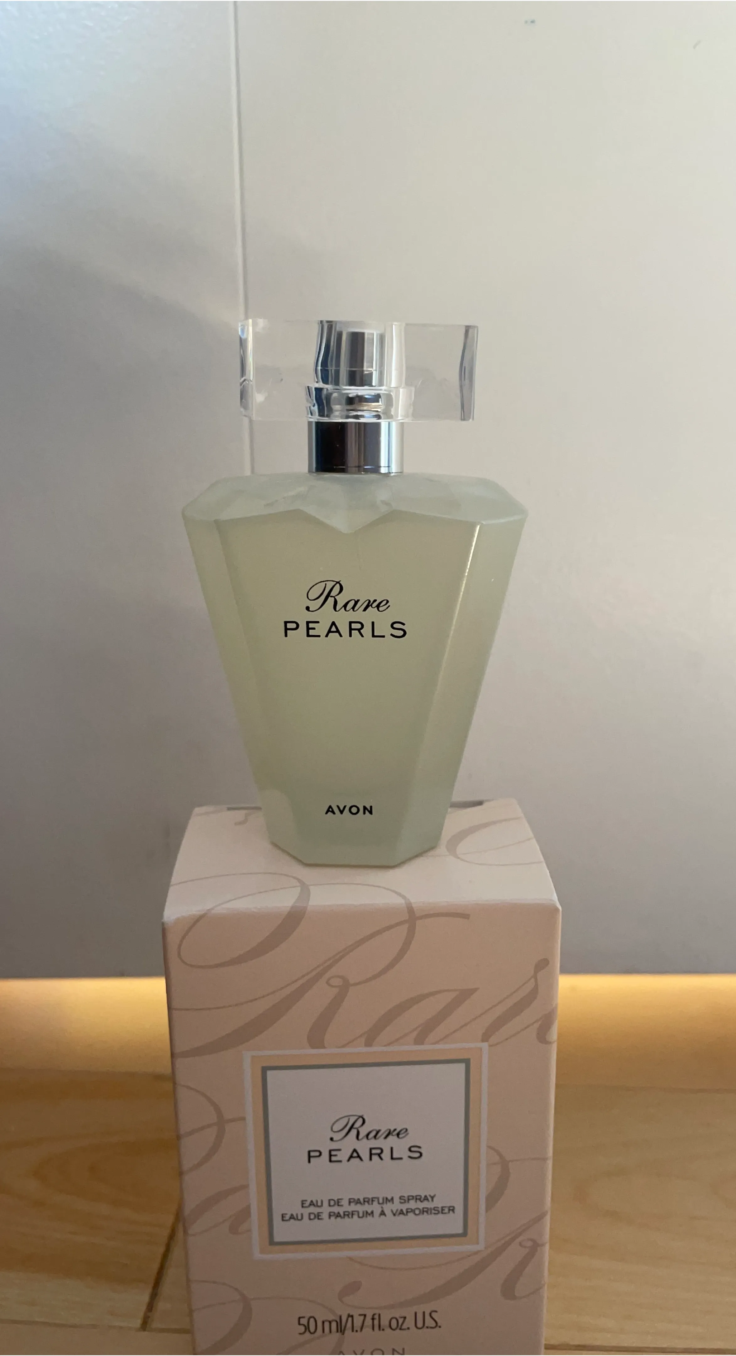 This is Avon Rare Pearls Eau de Parfum spray. It's a 50ml bottle, which is 1.7 fluid ounces. The fragrance comes in a distinctive faceted bottle.π