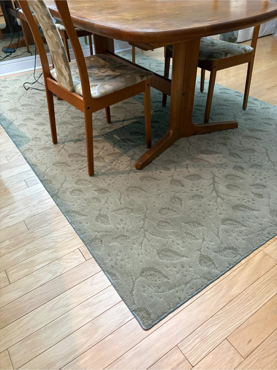 A light green area rug featuring a subtle leaf pattern throughout. It's a neutral addition to any room. Dimensions are approximately 5x7 feet.