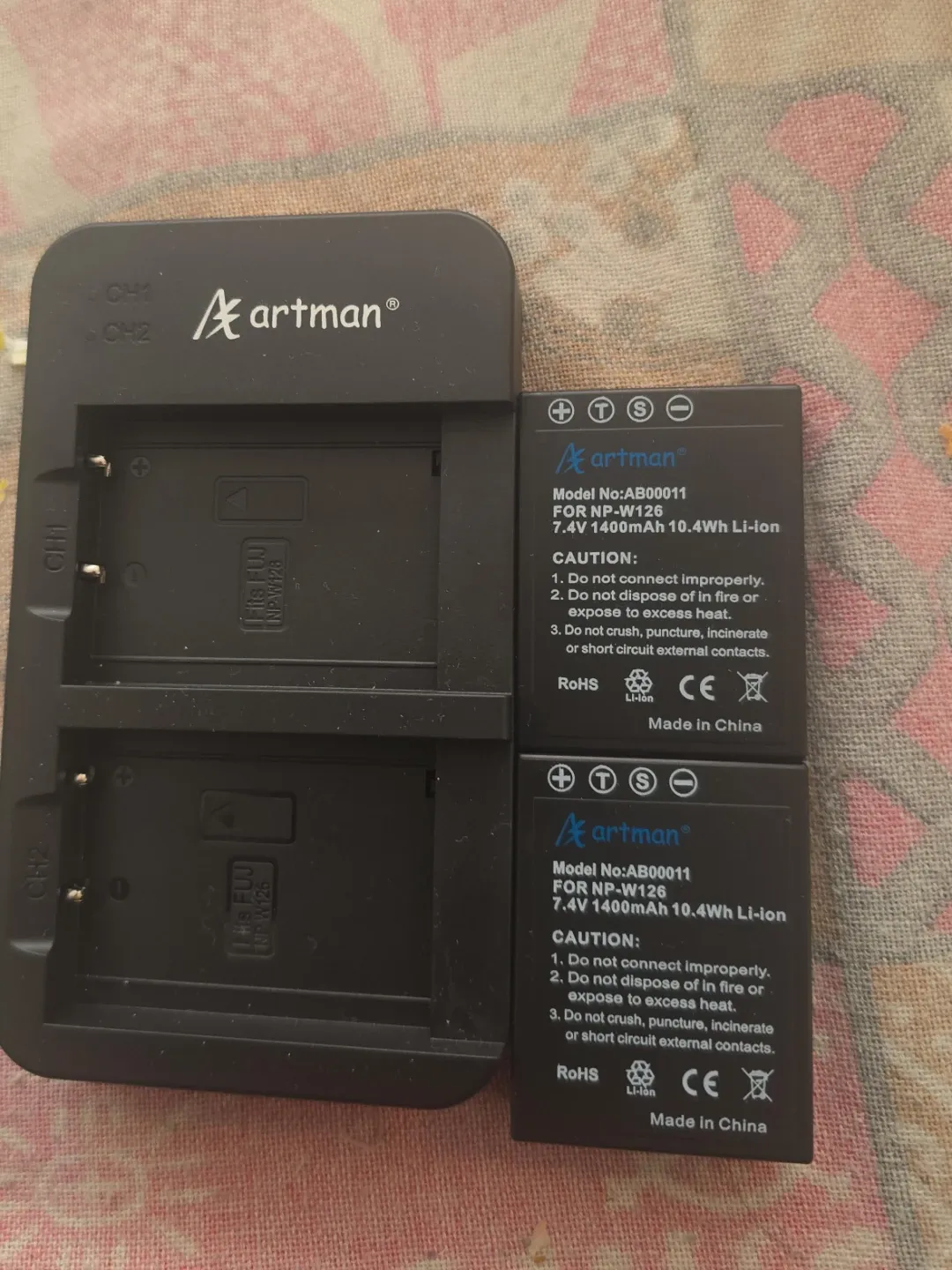 This Artman dual charger comes with two 7.4V 1400mAh batteries for NP-W126 cameras. Batteries are Li-ion.