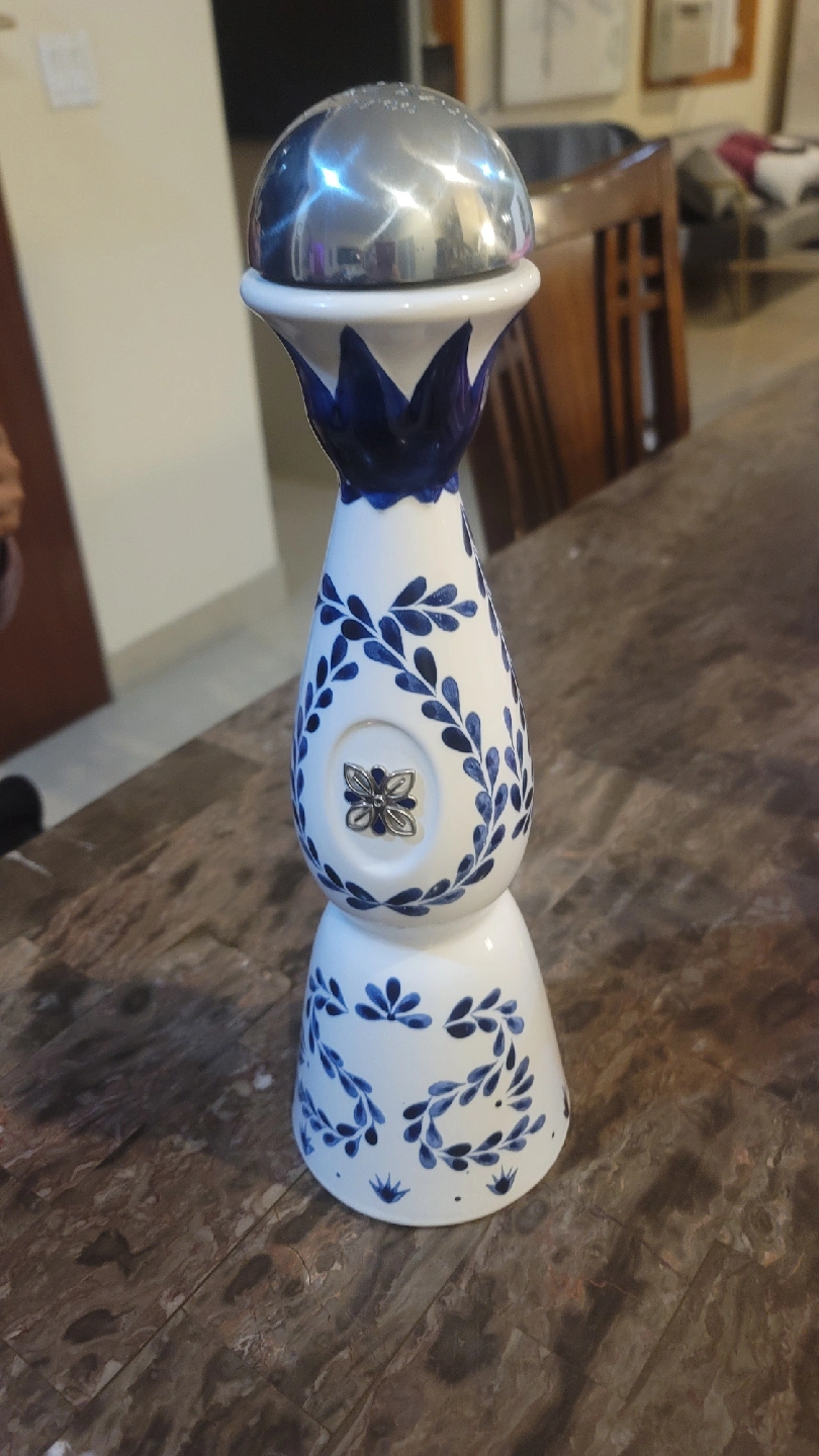 40Hermoso decantador de tequila Clase Azul con un intrincado diseño floral azul y blanco. Tiene una tapa plateada y un emblema de mariposa. ¡Perfecto para exhibir o servir tequila! (Vacio)