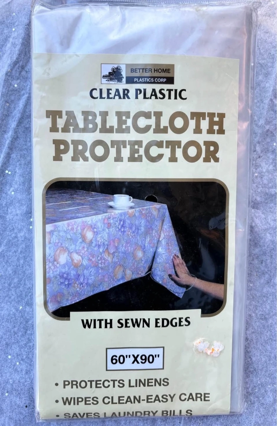 15Clear Plastic Table Protector with Sewn Edges New in package * Waterproof, Oilproof, Stain Resistant * Large Rectangle 60x90 * Protects linens, easy care, saves laundry bills.