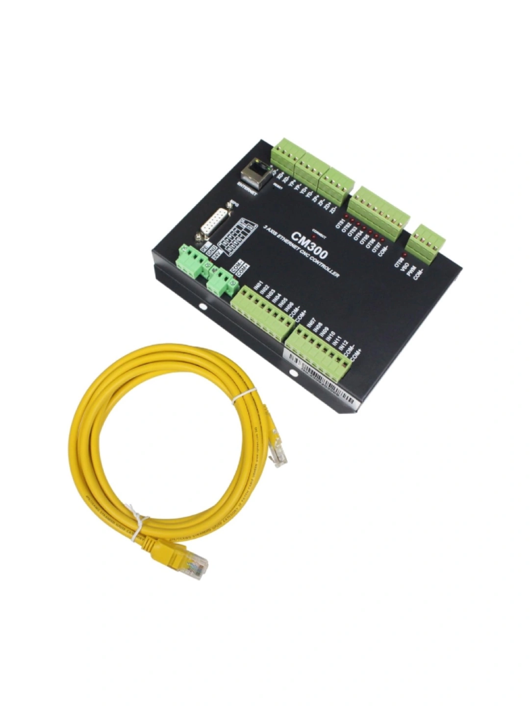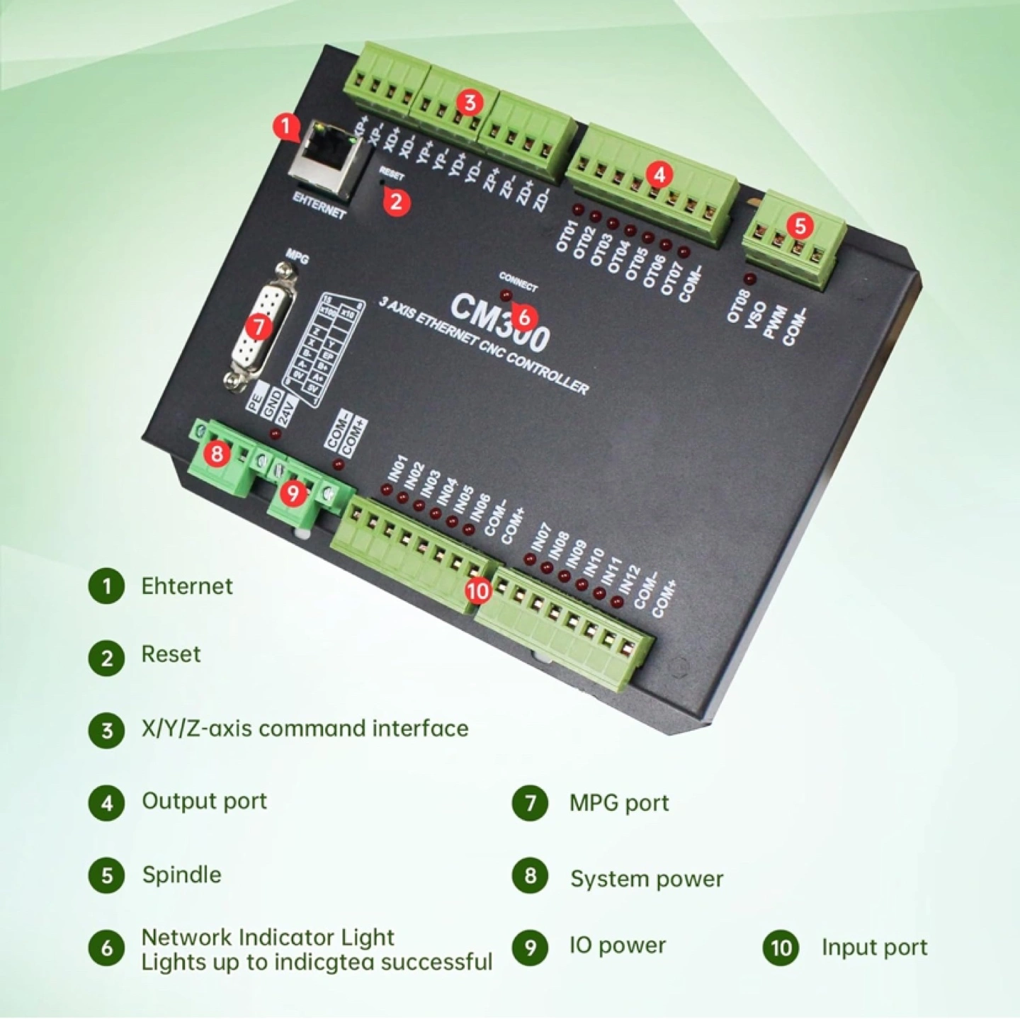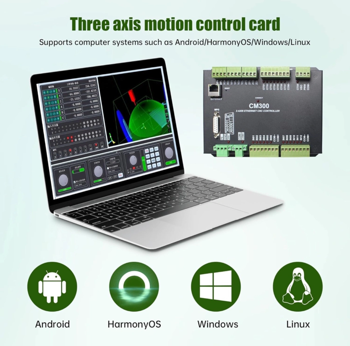 3-axis Ethernet CNC controller. Includes Ethernet cable. Supports Android, HarmonyOS, Windows, and Linux. 24V DC power supply. Multiple inputs and outputs. High-performance processor + FPGA architecture.