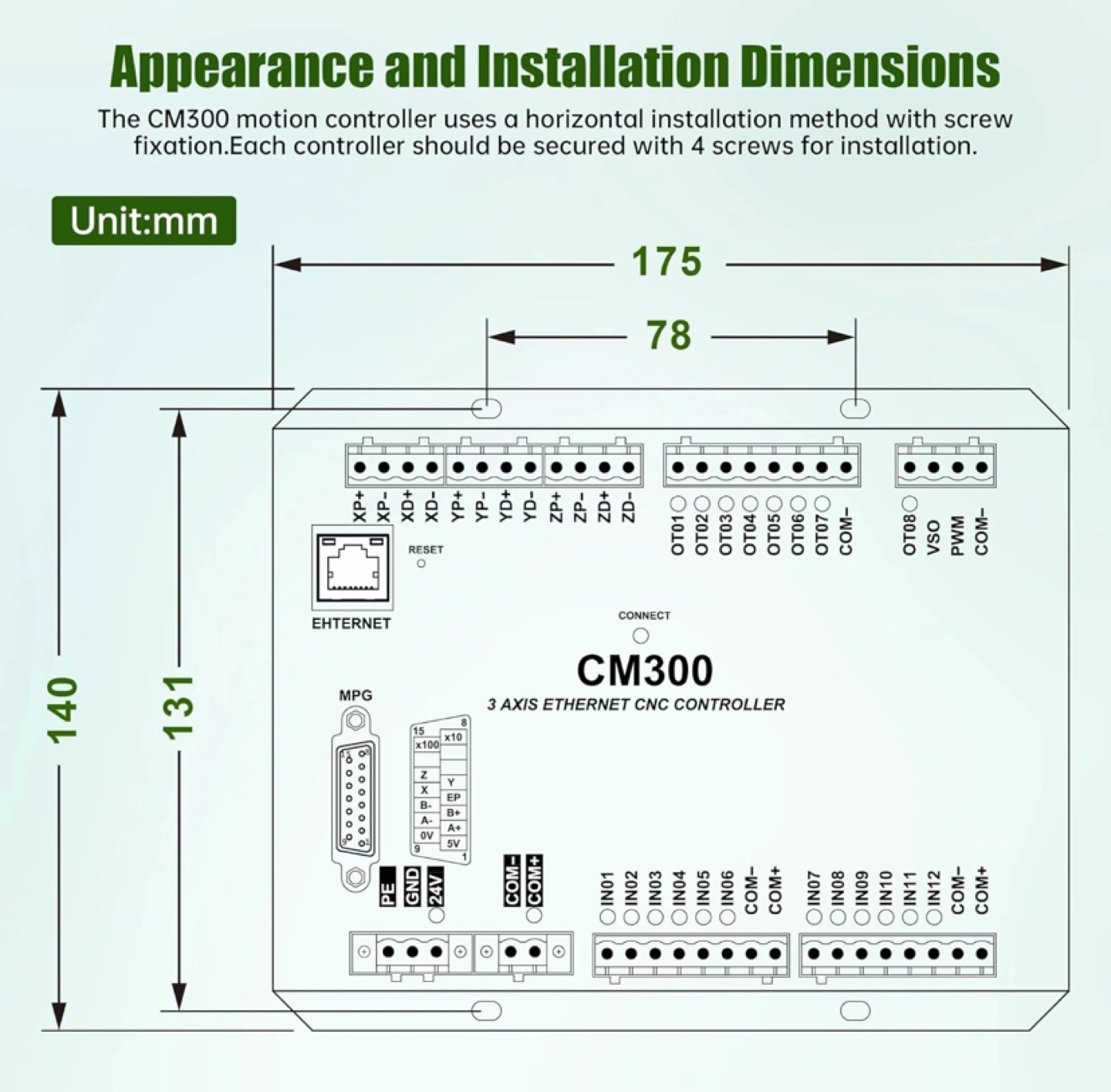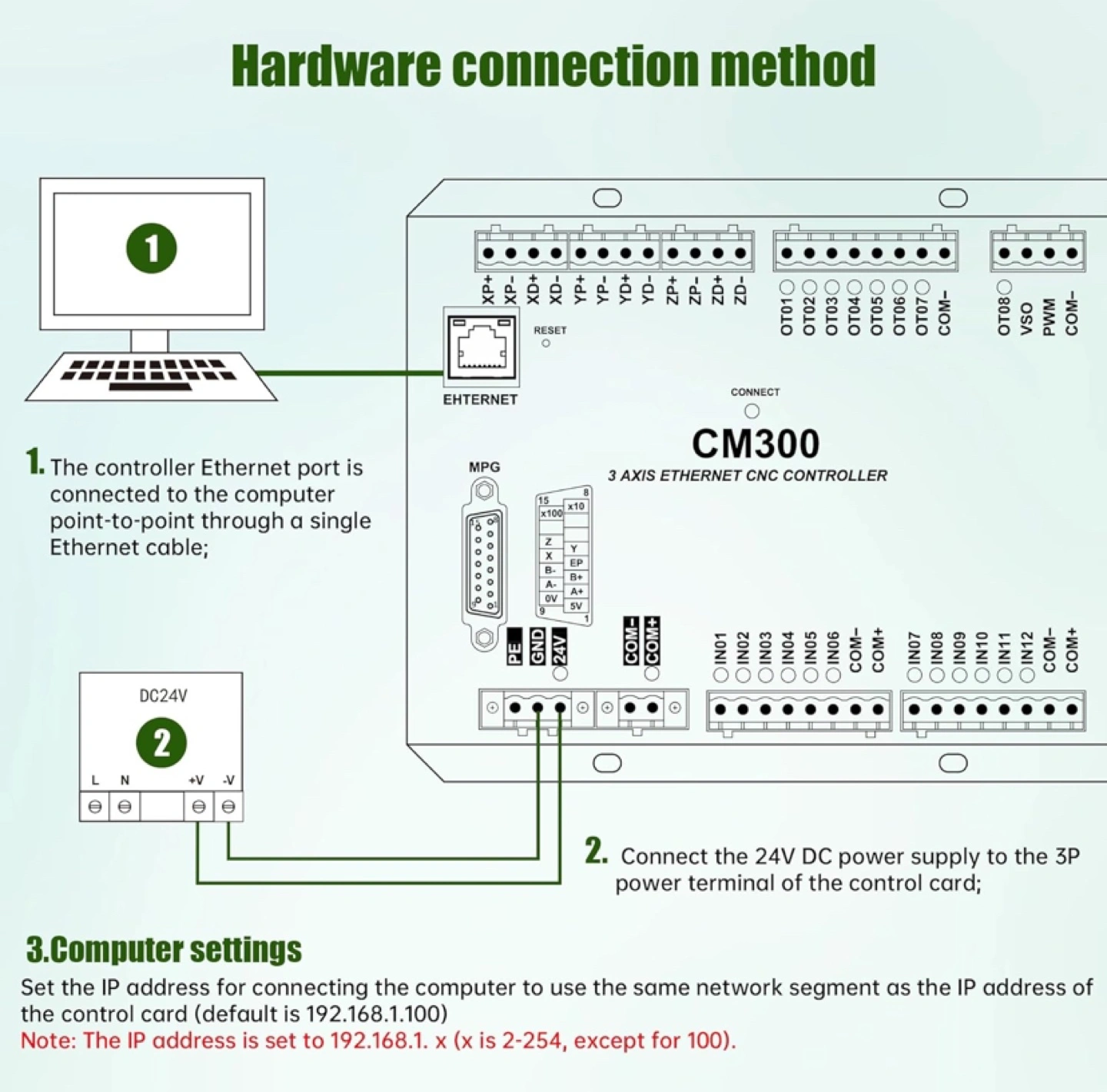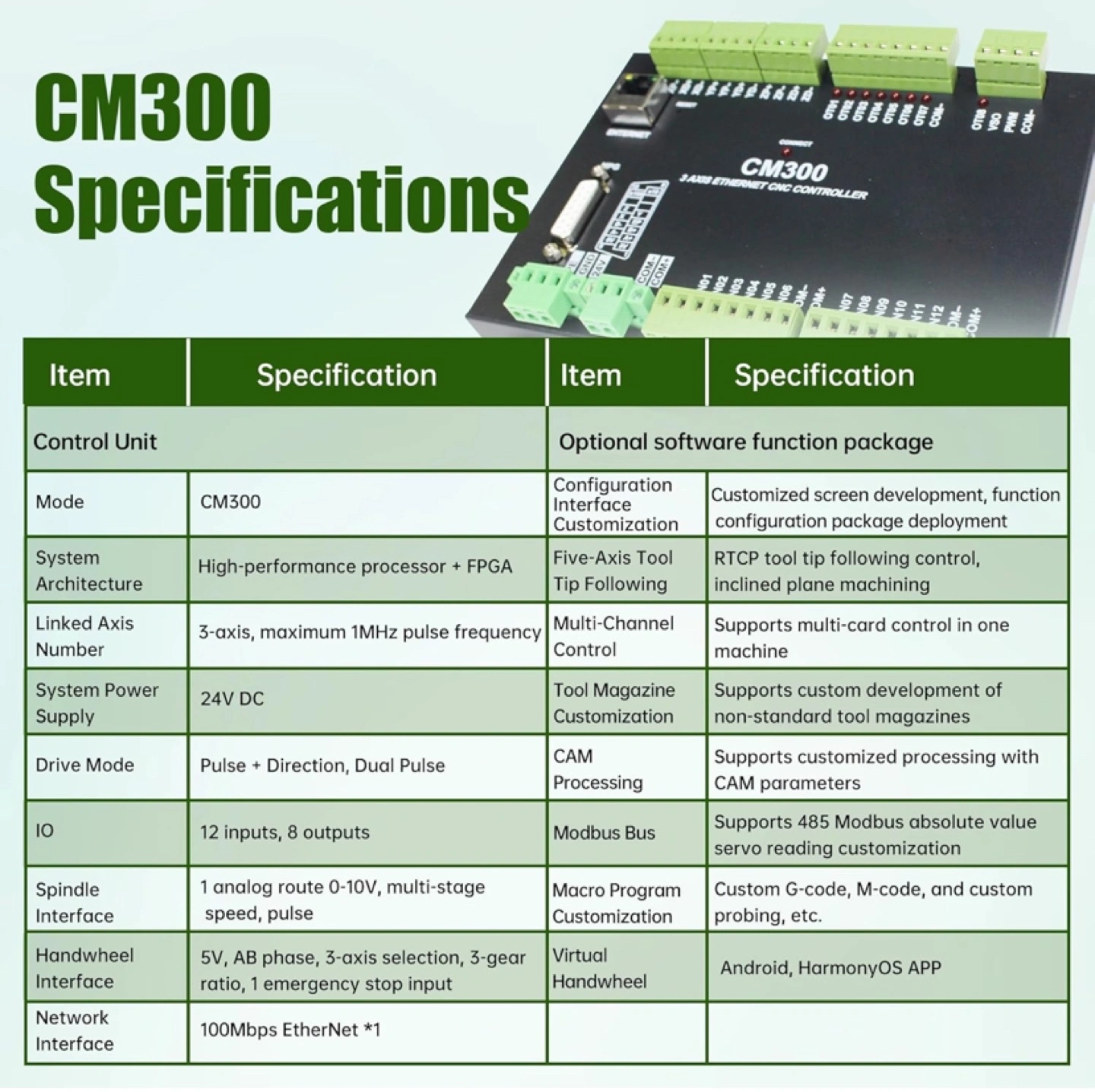 3-axis Ethernet CNC controller. Includes Ethernet cable. Supports Android, HarmonyOS, Windows, and Linux. 24V DC power supply. Multiple inputs and outputs. High-performance processor + FPGA architecture.