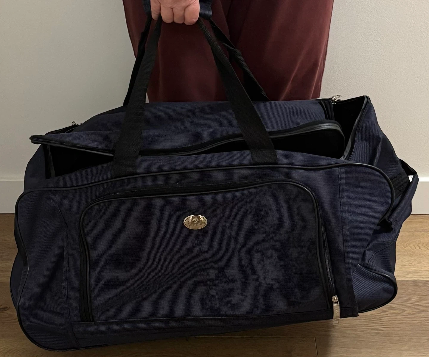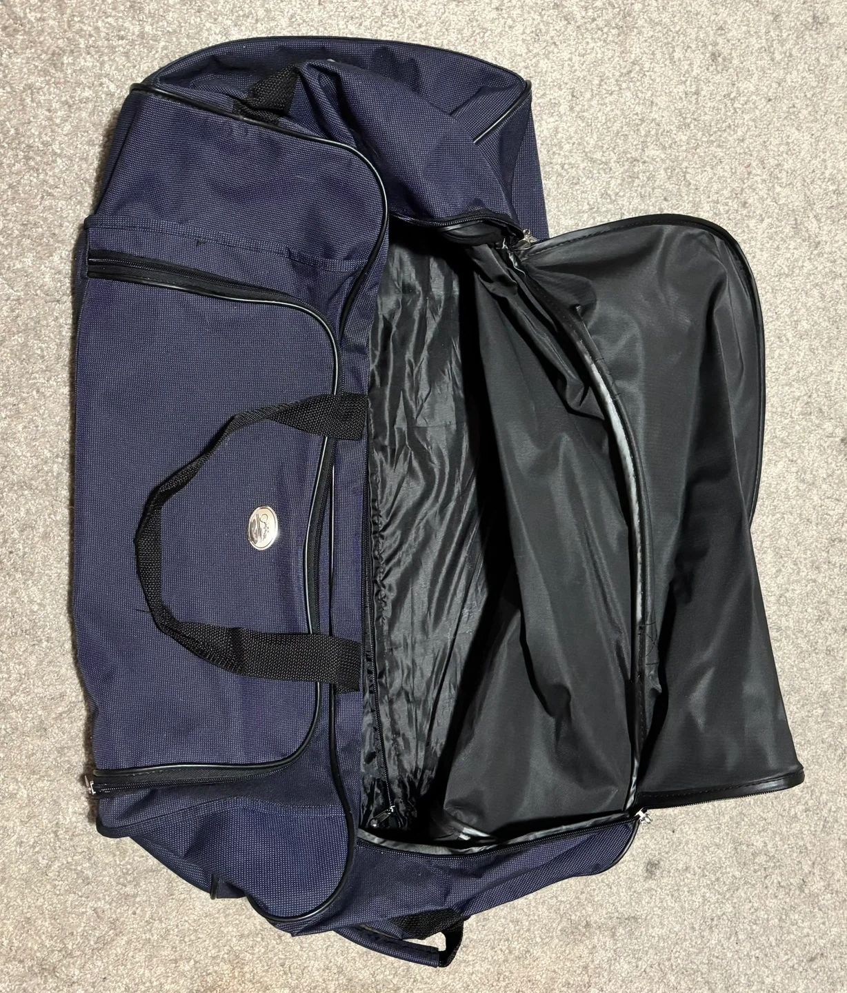 Spacious navy blue duffle bag with wheels. It has a large main compartment and a front pocket for easy access. The bag is made of durable fabric and features sturdy handles and a telescoping pull handle. Great for travel or sports gear! Very gently used.