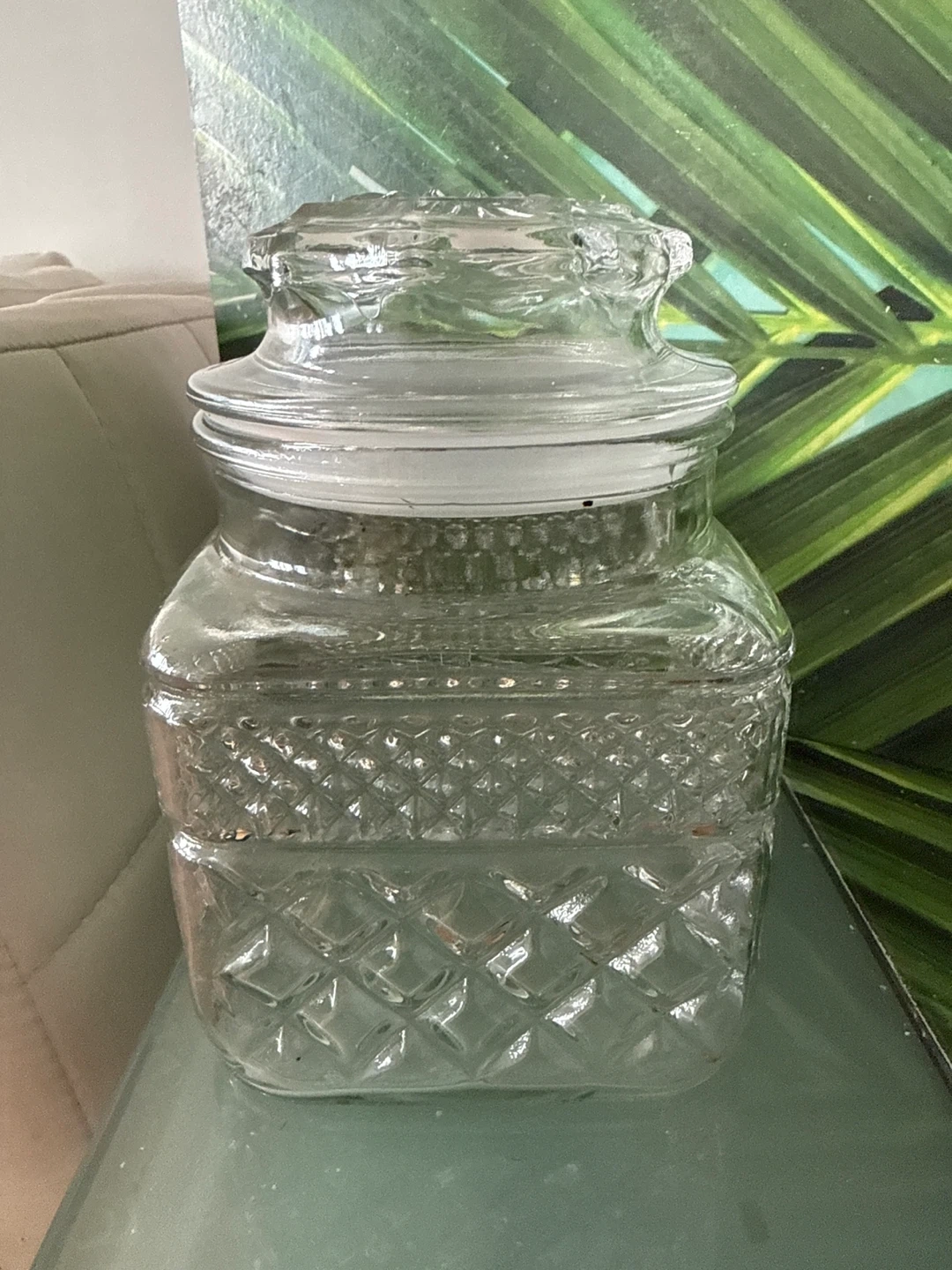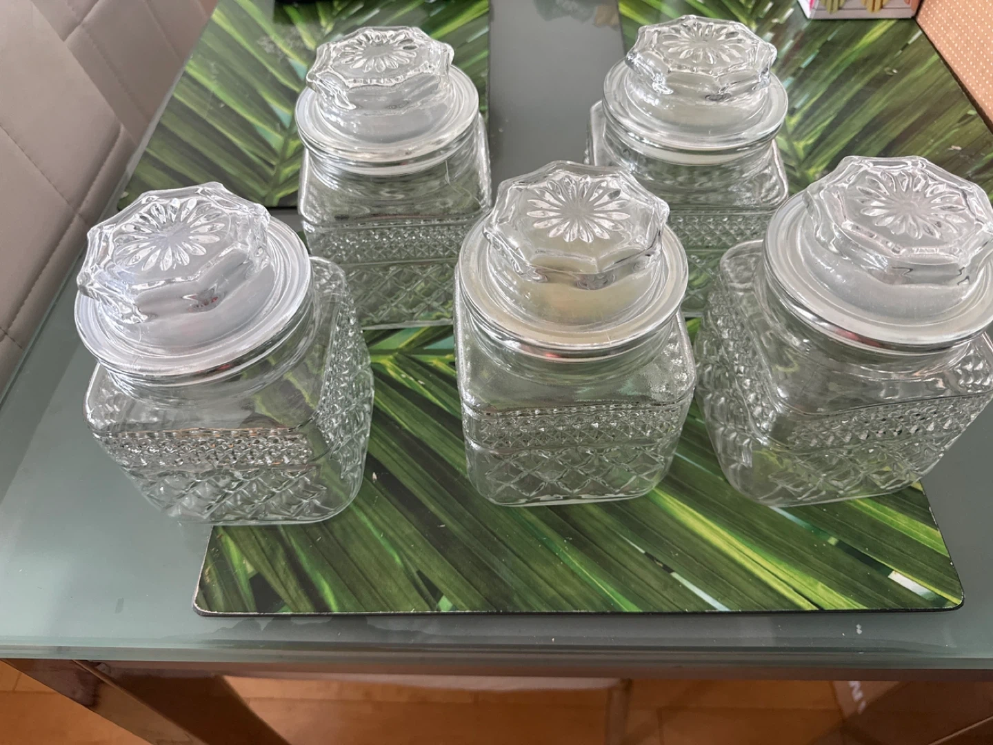 Five clear glass storage jars with decorative embossed patterns. These jars are perfect for storing dry goods in the kitchen or for organizing small items. Lids create a snug fit.
