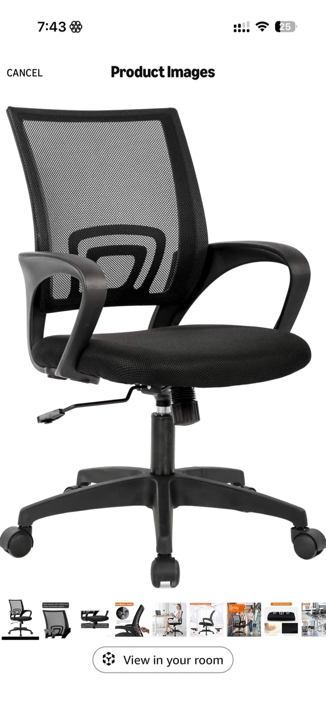 This office chair features a breathable mesh back with lumbar support. It has adjustable height and a padded seat for comfort. It's designed for everyday use and has a smooth-rolling caster base.