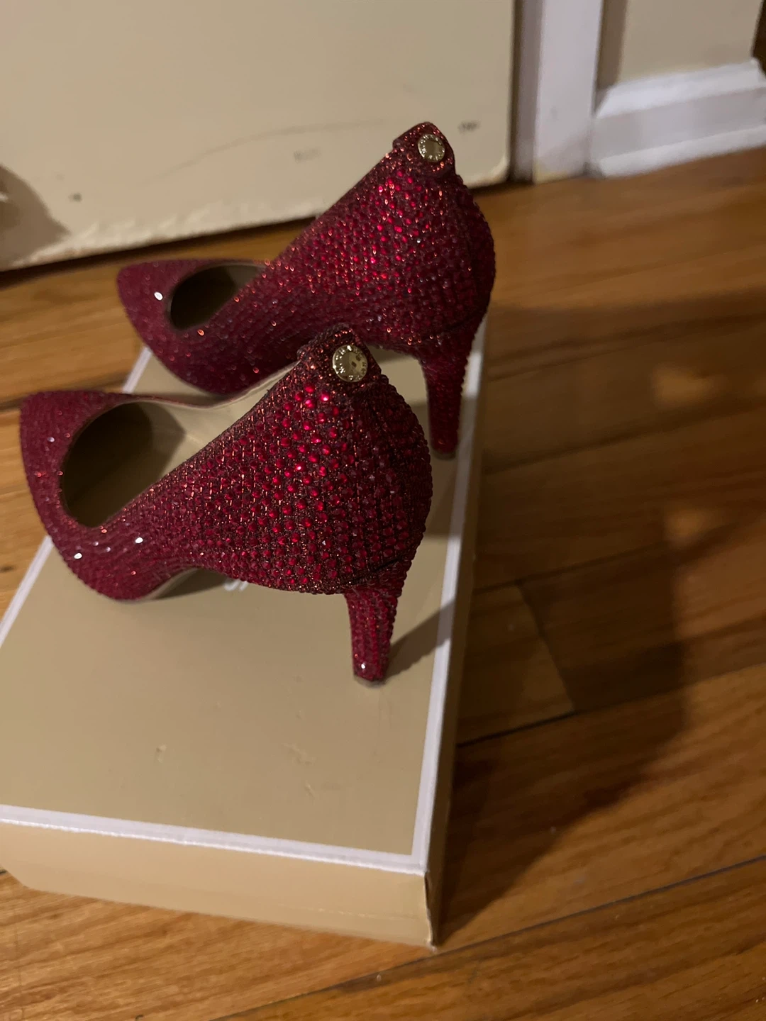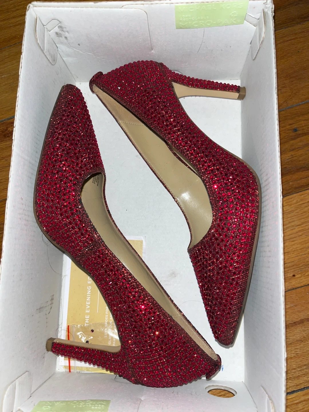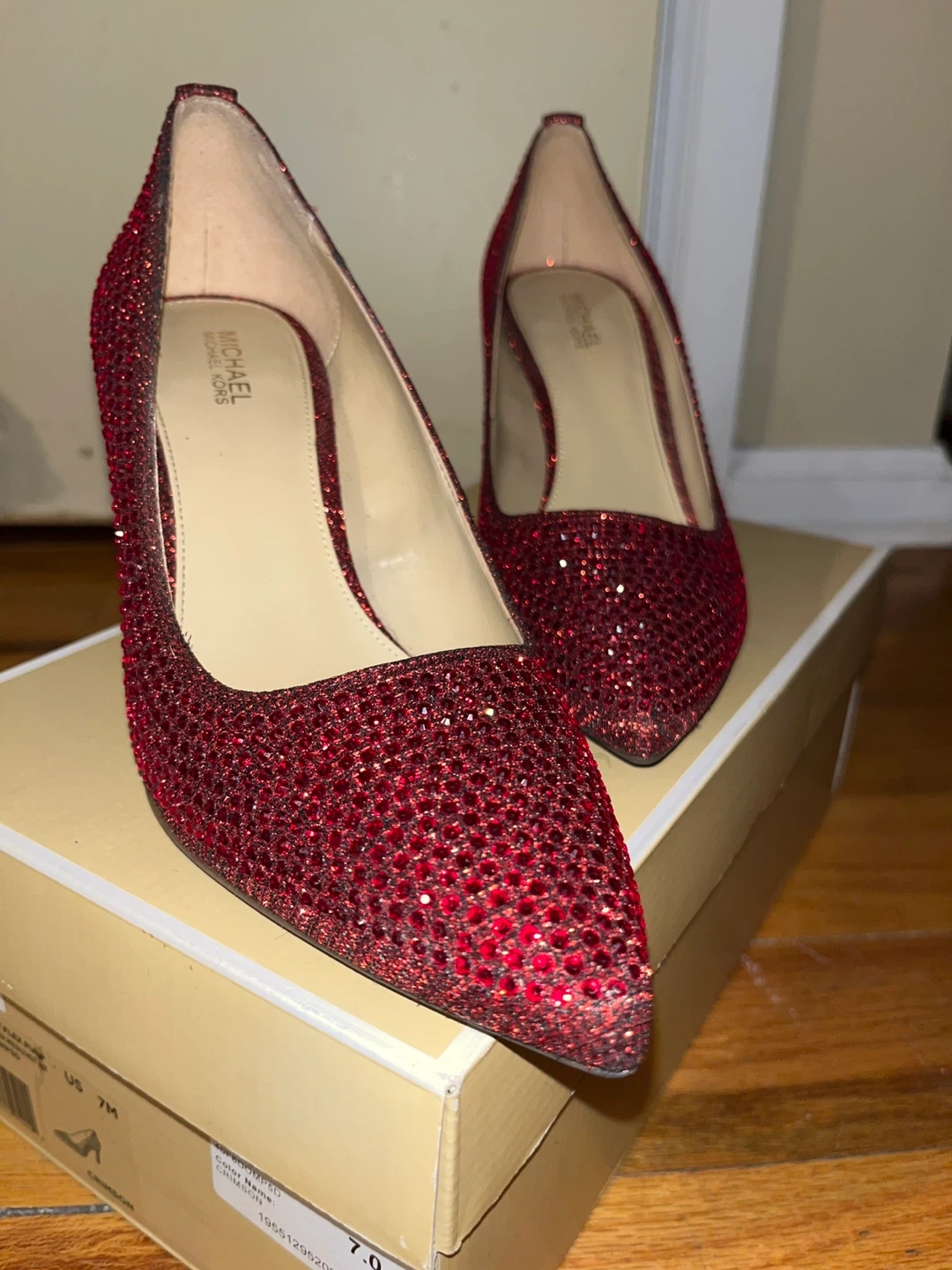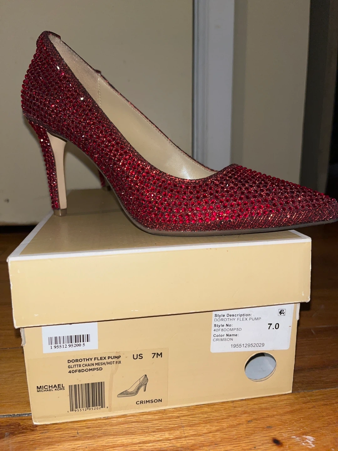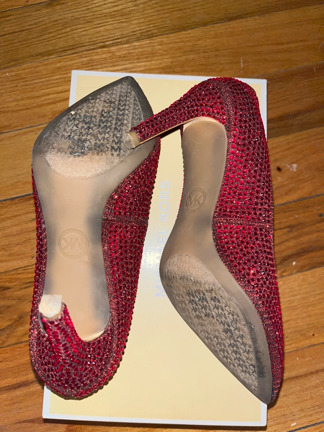 These dazzling Michael Kors Dorothy Flex pumps are covered in shimmering red rhinestones. They feature a pointed toe and a stiletto heel. Includes original box. Perfect for adding sparkle to any outfit!