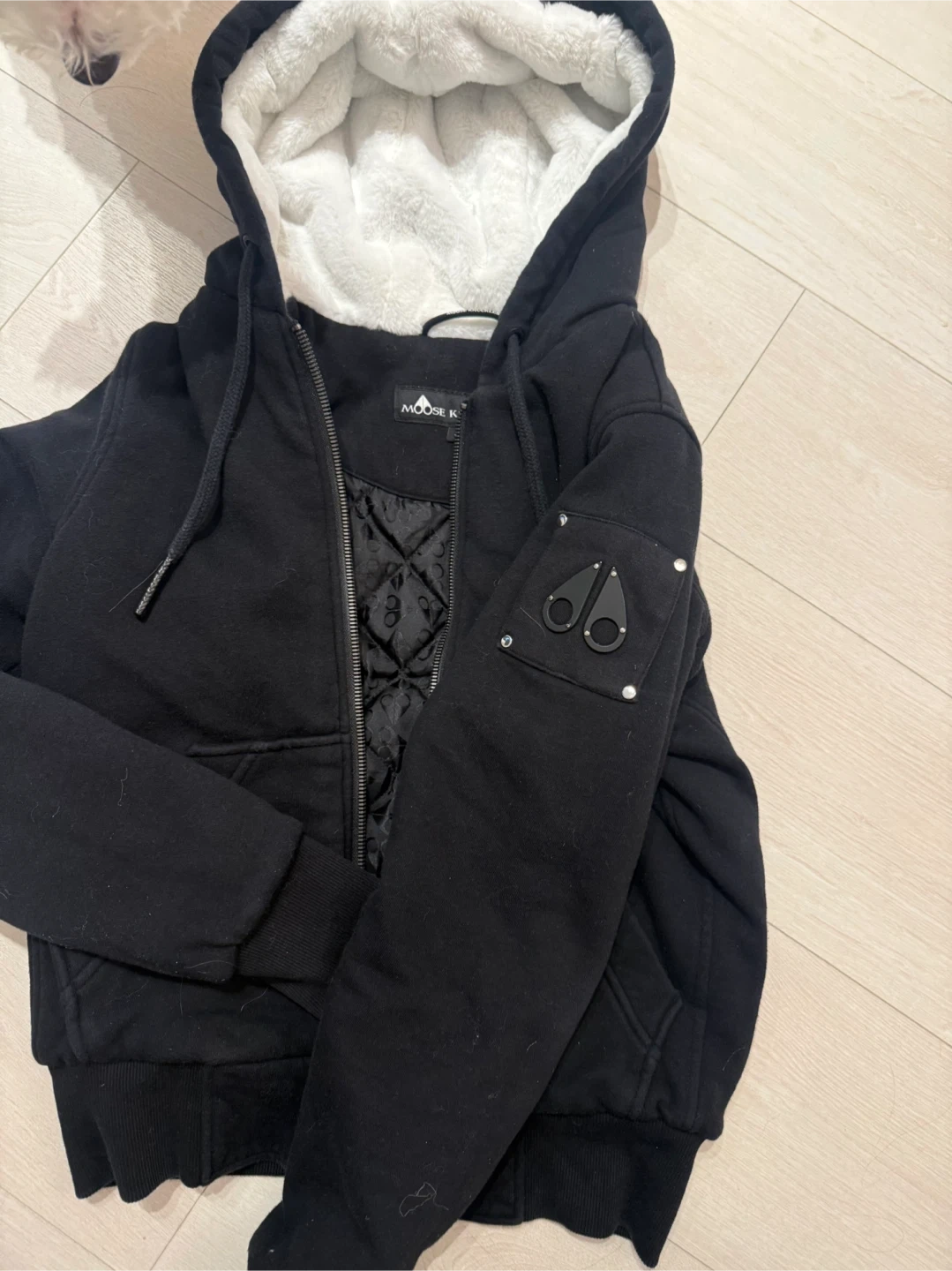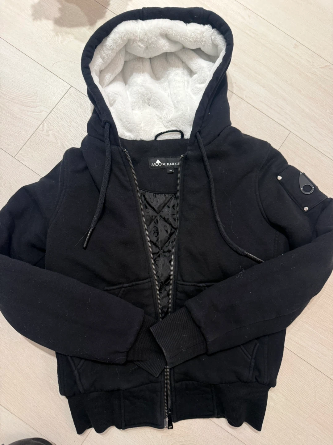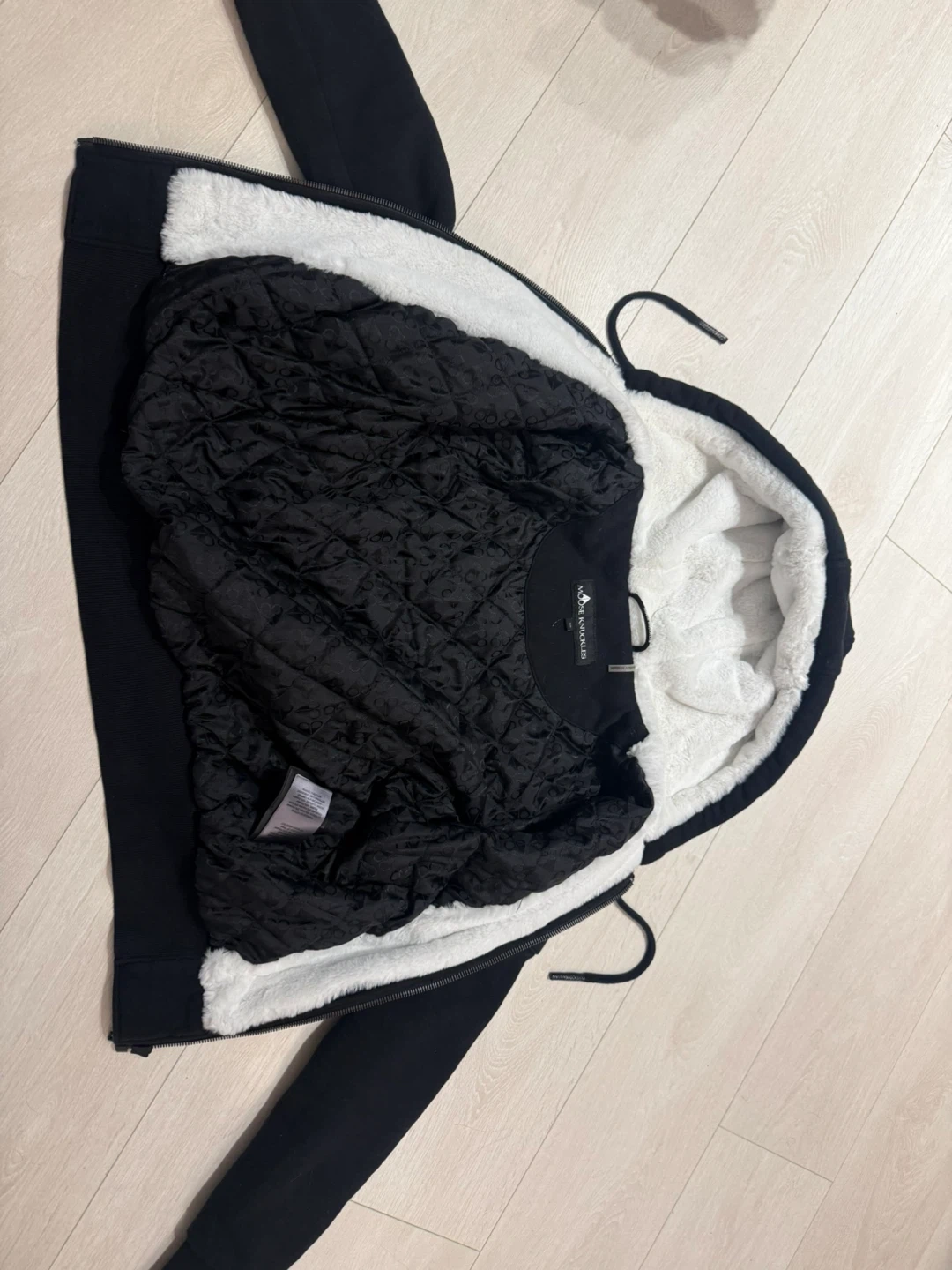 This Moose Knuckles hoodie is black with a cozy sherpa lining. It features a full zip closure and has the signature Moose Knuckles emblem on the sleeve. The interior is quilted for added warmth. Great for staying warm on cooler days!