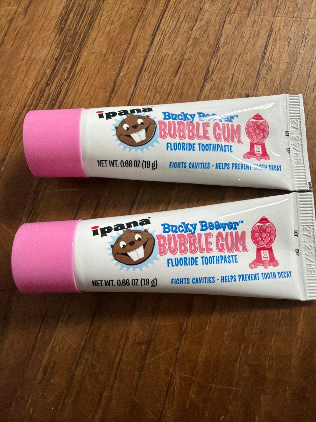 Two tubes of Ipana Bucky Beaver Bubble Gum fluoride toothpaste. Each tube is 0.66 oz (19 g) and fights cavities. EXP 29/MR.