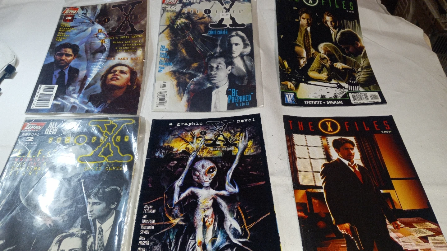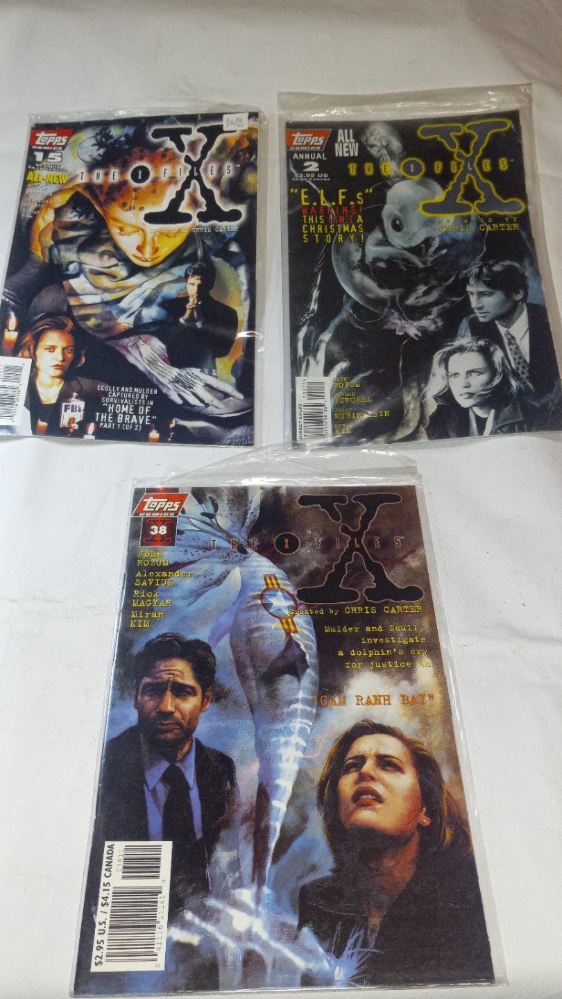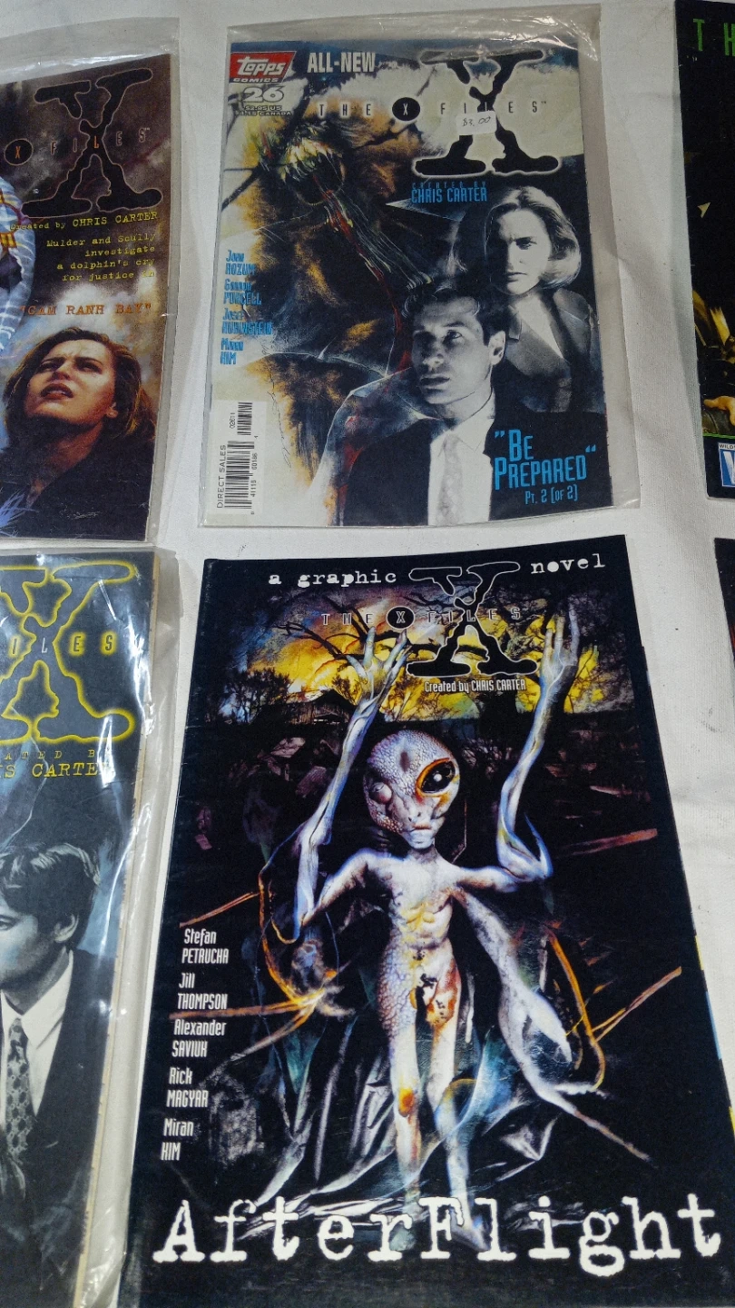 This lot includes several comic books, including "The Fall of Torbel" from CrossGen Comics, issues of "The X-Files" from Topps Comics, and "Skull & Bones 1" from DC Comics. The "X-Files" issues appear to be from the mid-90s. This collection is perfect for fans of sci-fi and fantasy comics!