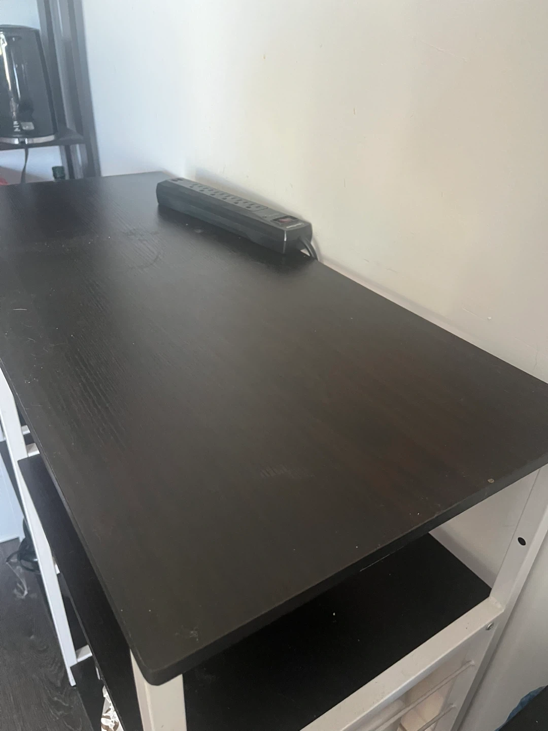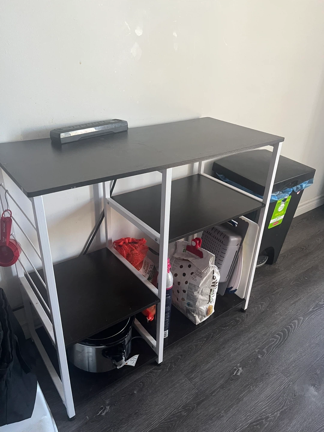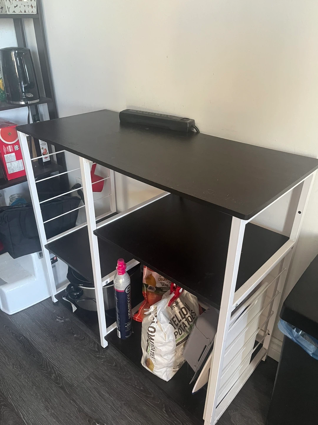 Selling a kitchen baker's rack with a black top and shelves, and white metal frame. It's in great shape and ready to help organize your kitchen or pantry! Perfect for storing pots, pans, or even small appliances