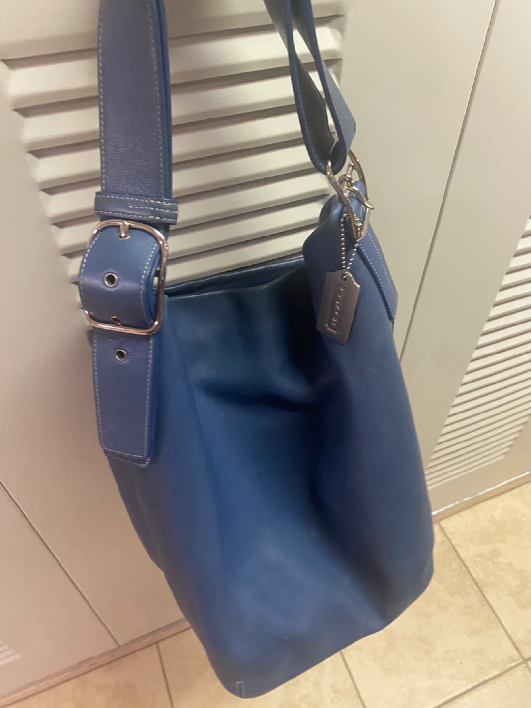 Selling a gently used Coach shoulder bag in blue leather. The bag is crafted from natural cowhide leather. It's a stylish and functional accessory!
