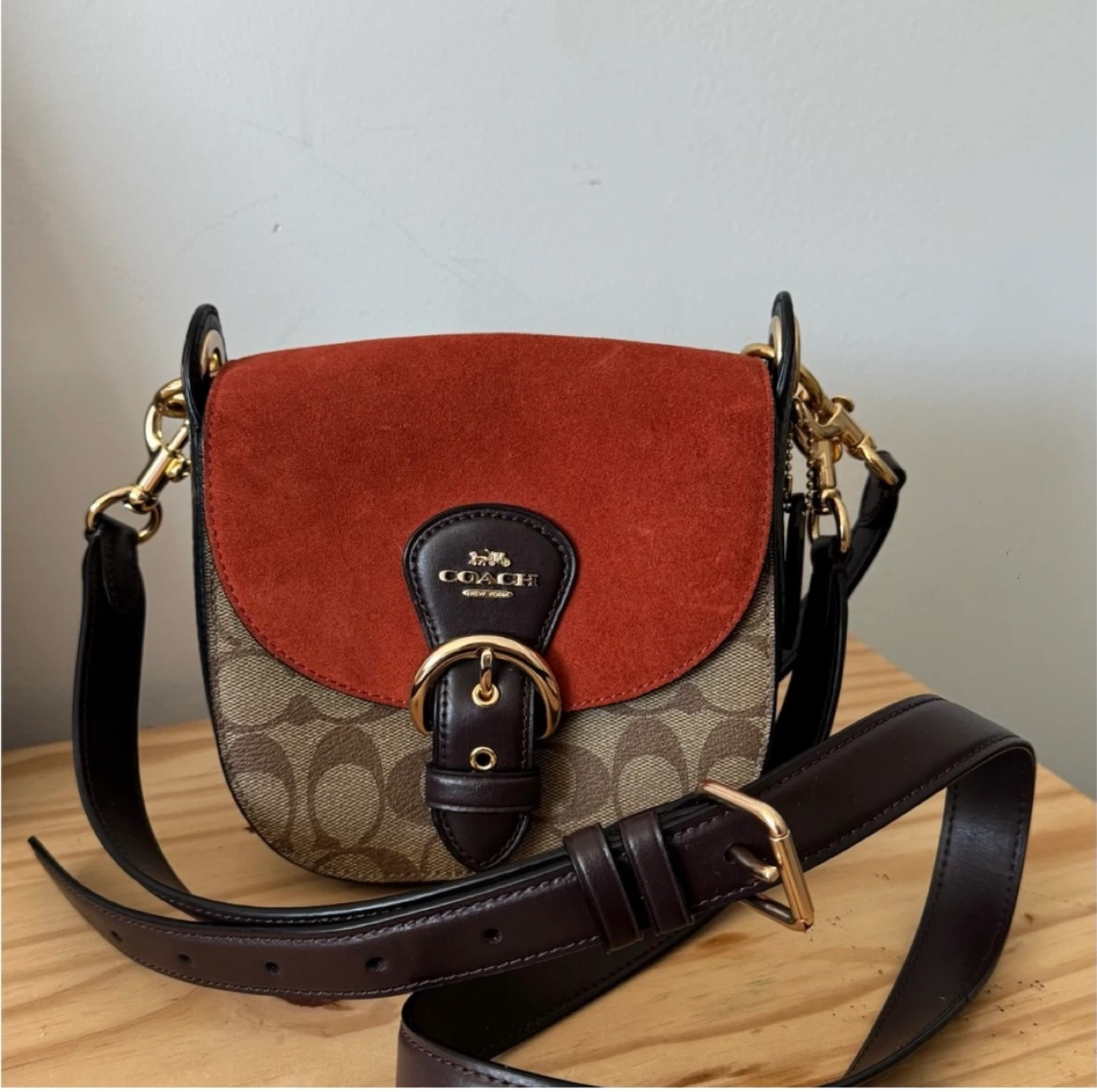 Selling New Coach crossbody bag in brown and red with a suede flap! Never worn. The original price was $450.