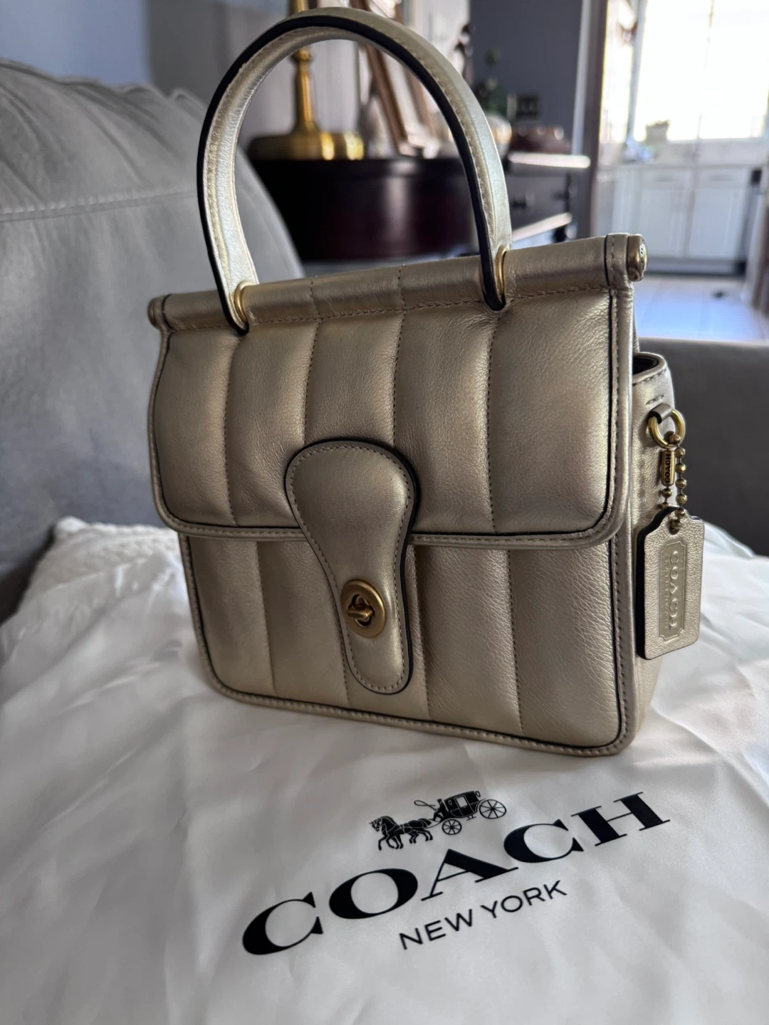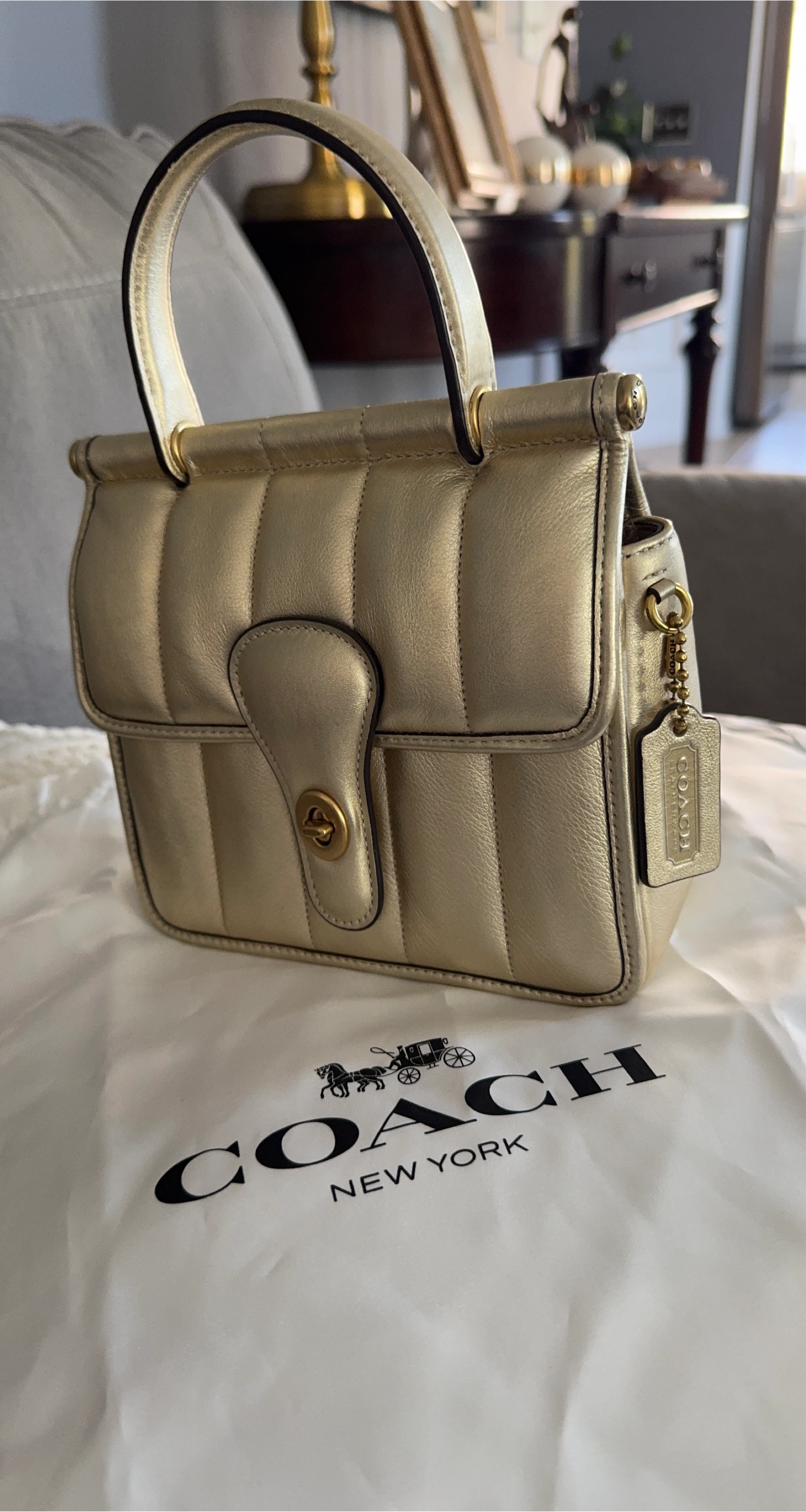 10Selling a beautiful gold leather Coach mini handbag! It's in great condition and ready for a new home. This stylish bag is perfect for adding a touch of elegance to any outfit. The color is a stunning gold, and the leather is soft and supple. This is a must-have accessory for any fashion lover!