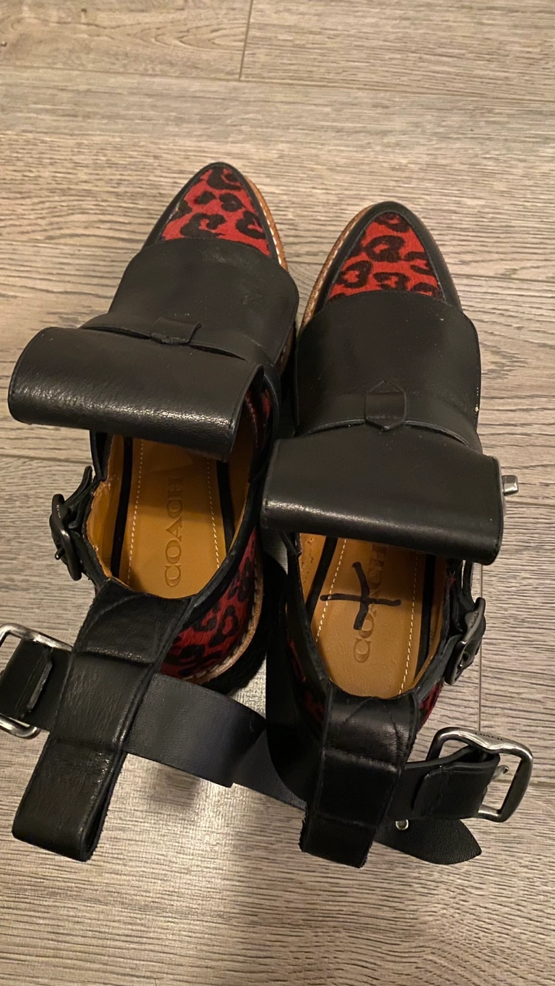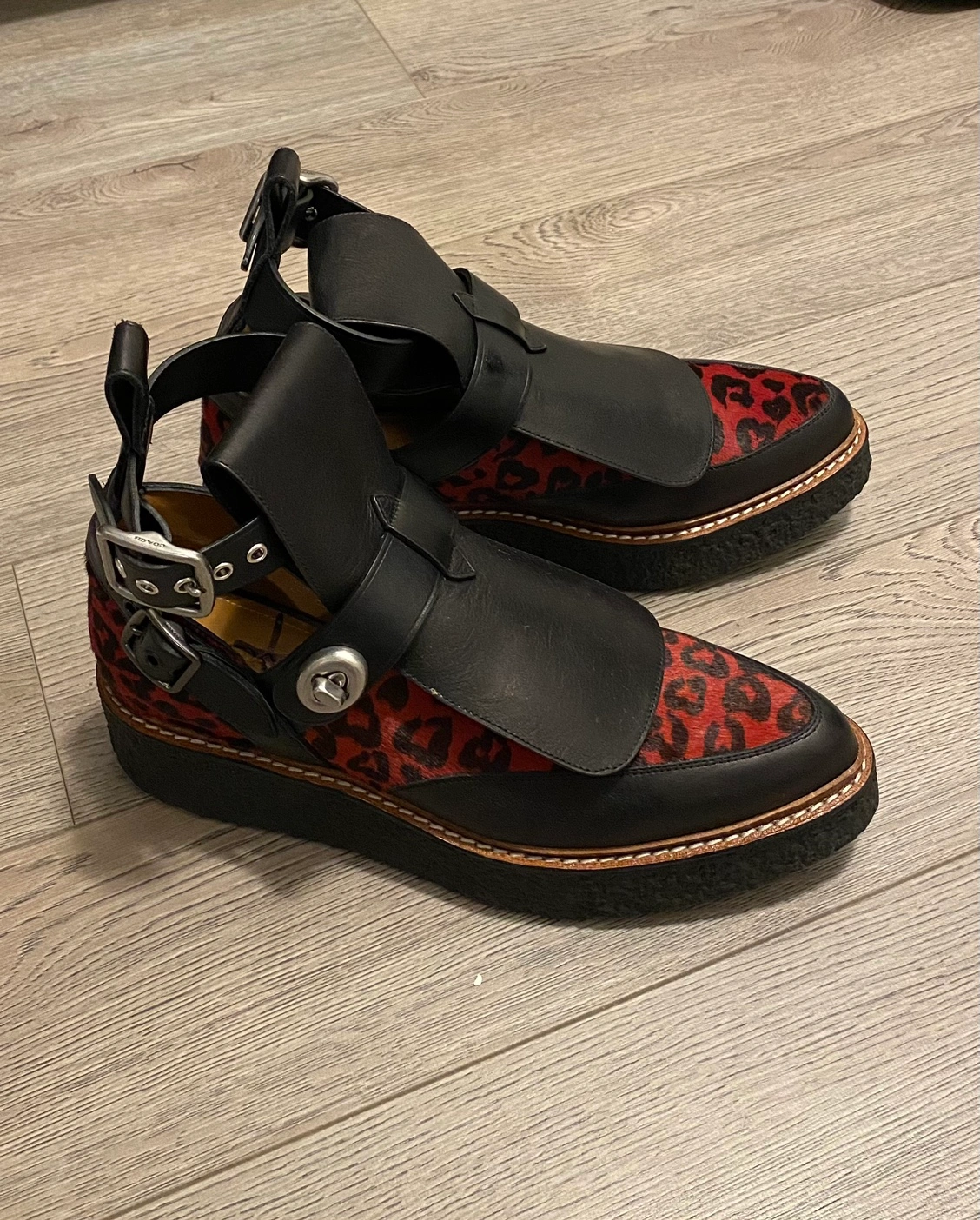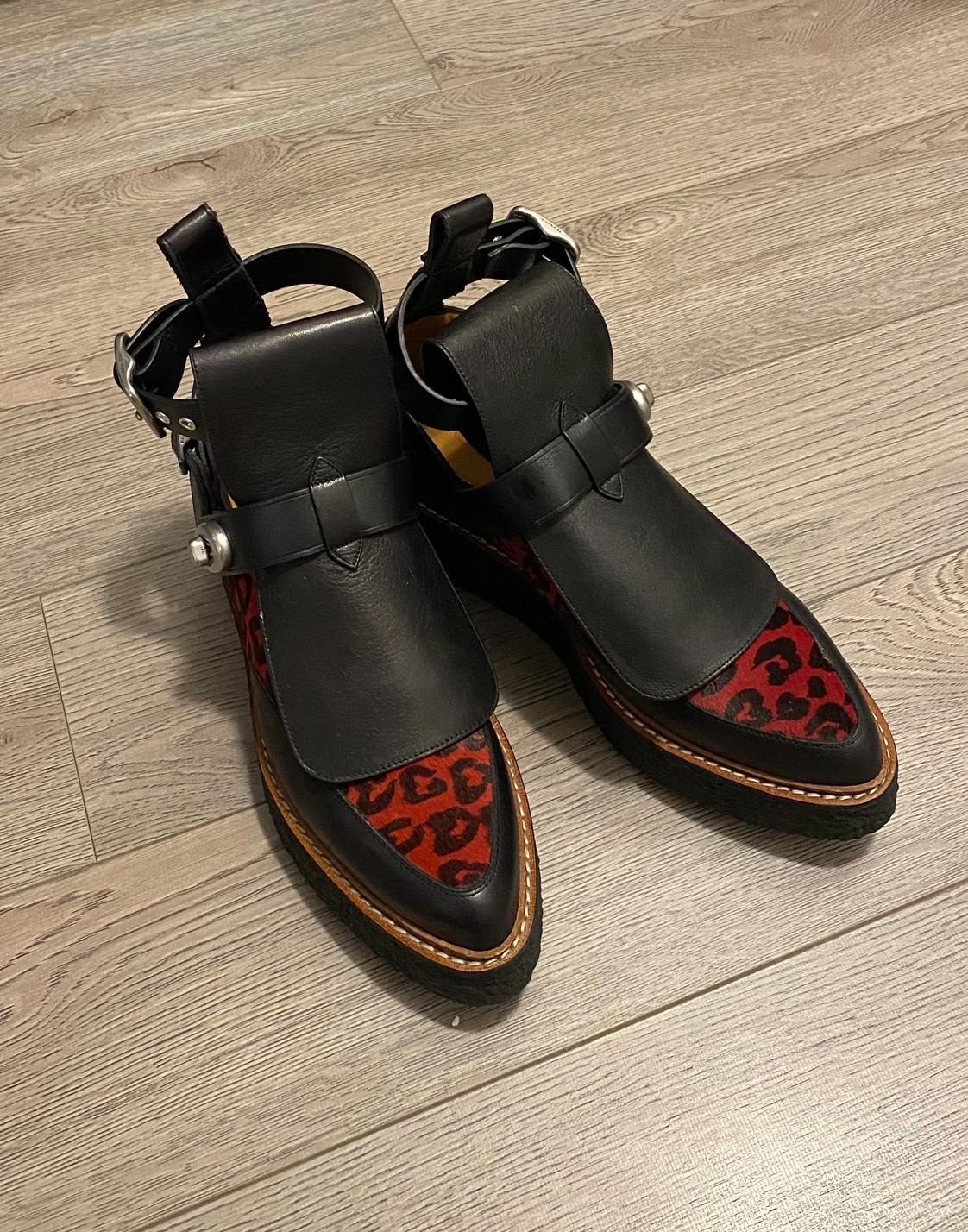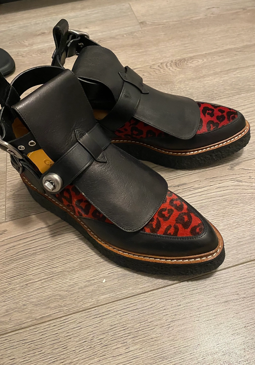 Brand New Black platform boots with red leopard print detail and hardware. Buckle closures at the ankle. Platform soles. Size 8.