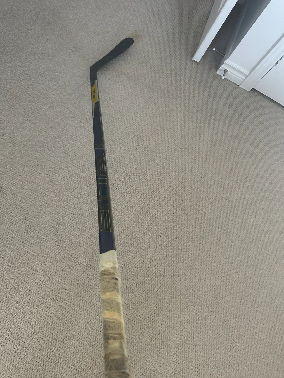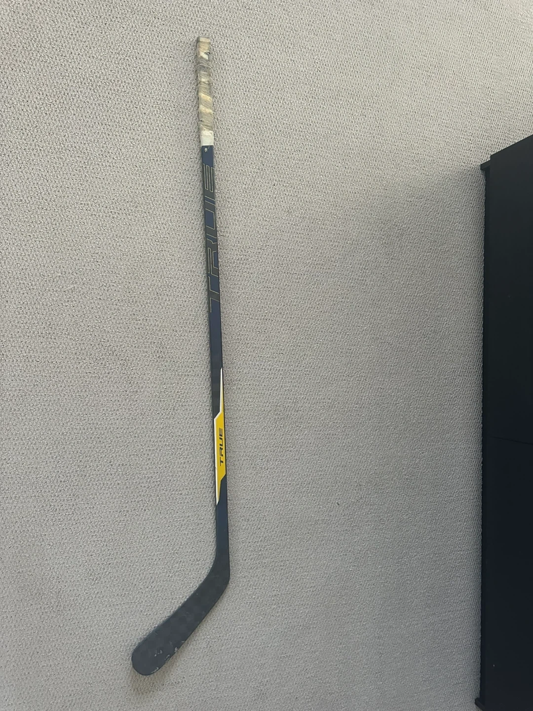 This is a Pro stock True project x hockey stick with a blue and yellow blade with good grip barely used and has a custom thicker and longer blade p92