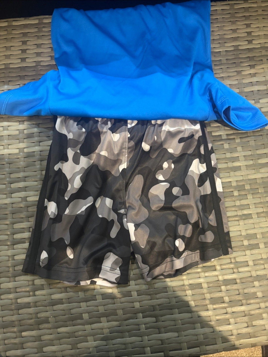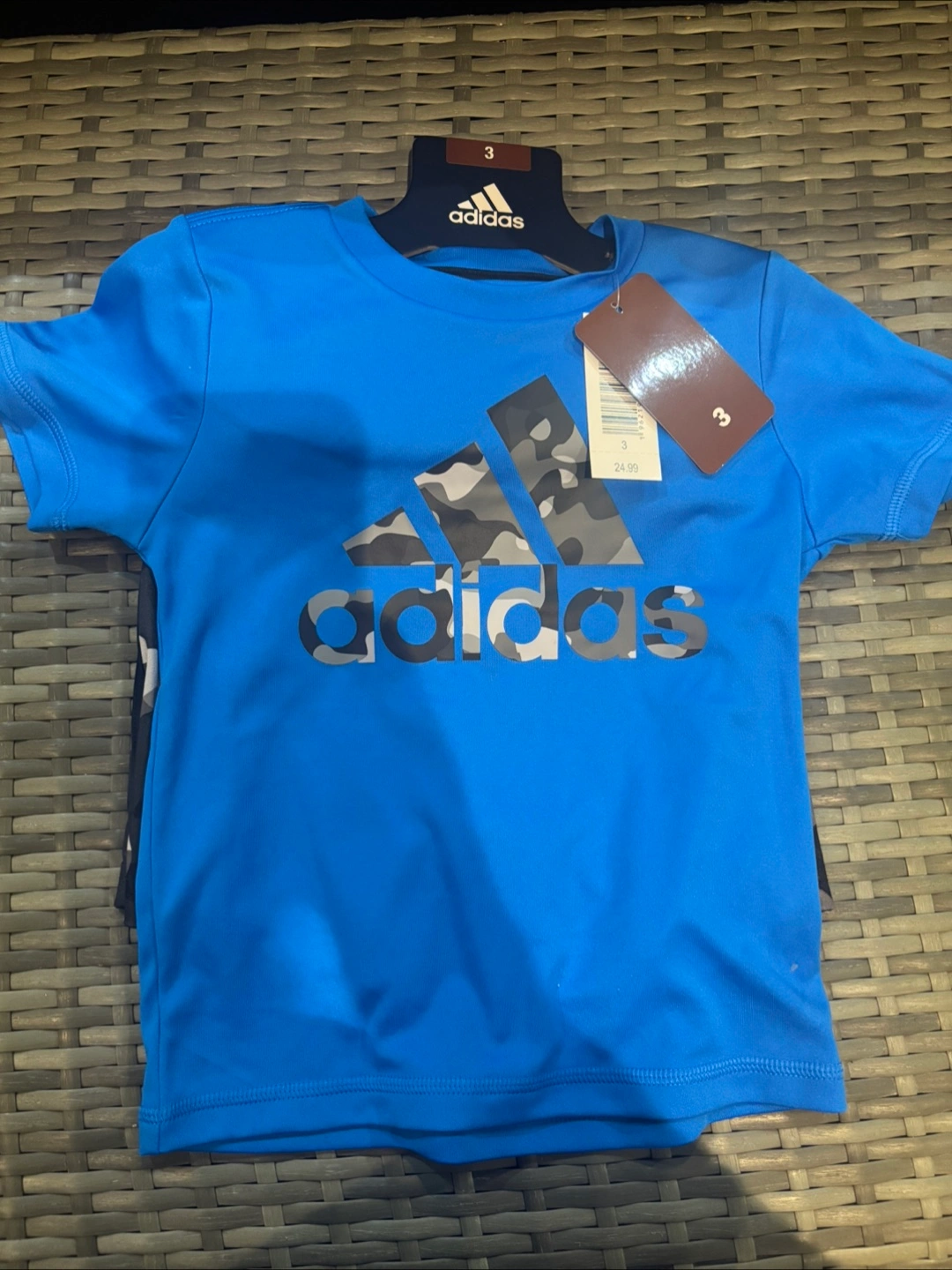 Blue Adidas t-shirt with large logo and camouflage print details. Matching camouflage print shorts with black stripes on the sides. Size 3.