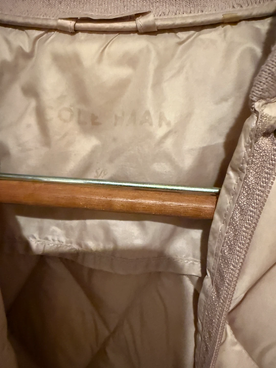 Selling a Cole Haan women's puffer jacket in size small. It's a light pink color with a diamond quilted pattern. Great for layering or wearing on its own during milder weather