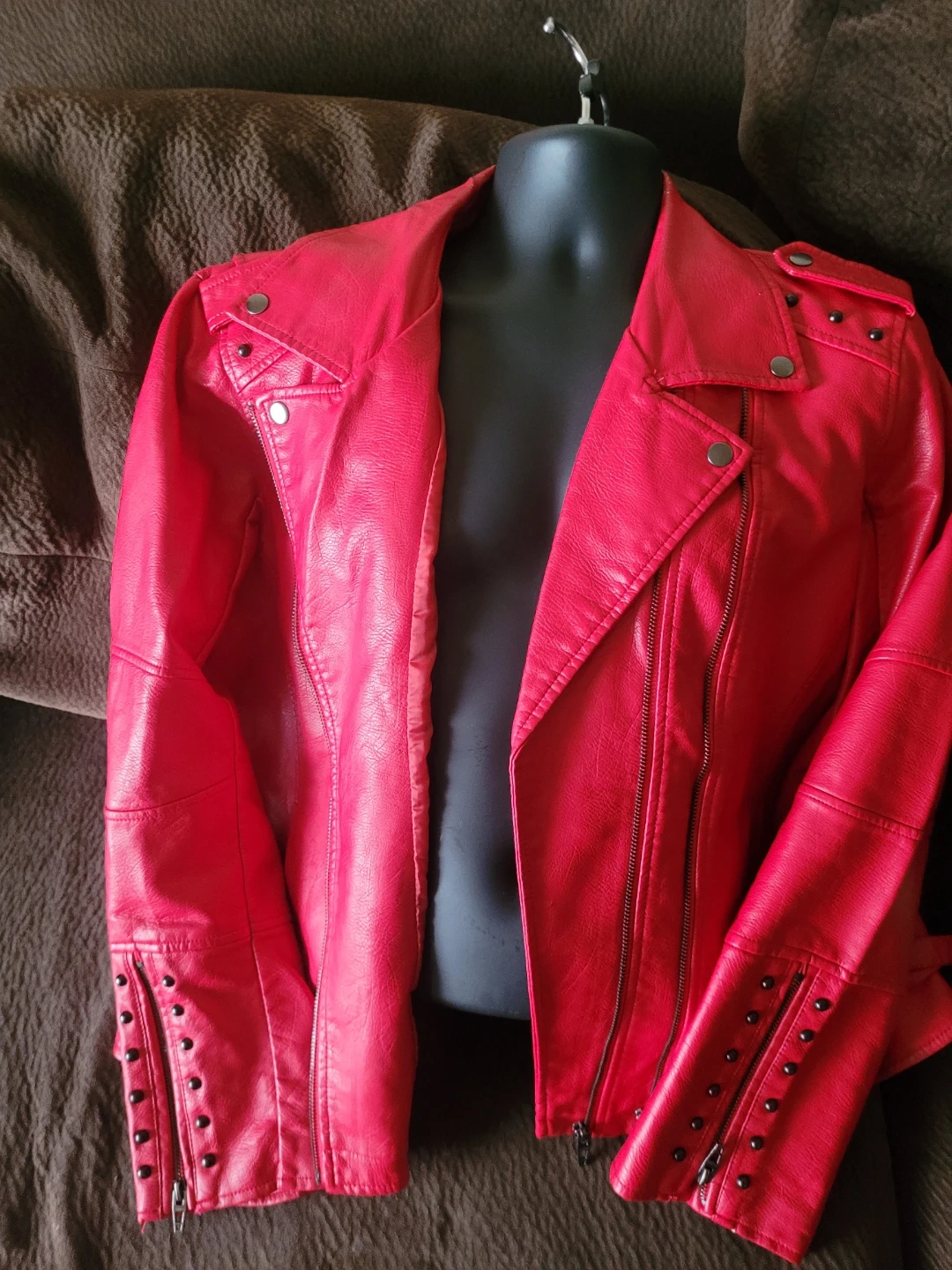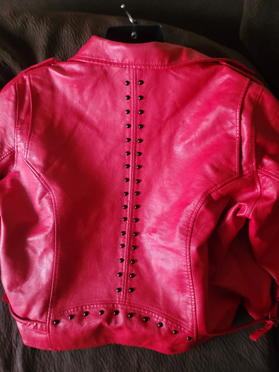 60Selling a vibrant red faux leather jacket from Colleen Lopez! This jacket is a size 2X and features a stylish design with studded accents. Perfect for adding a pop of color to your wardrobe
