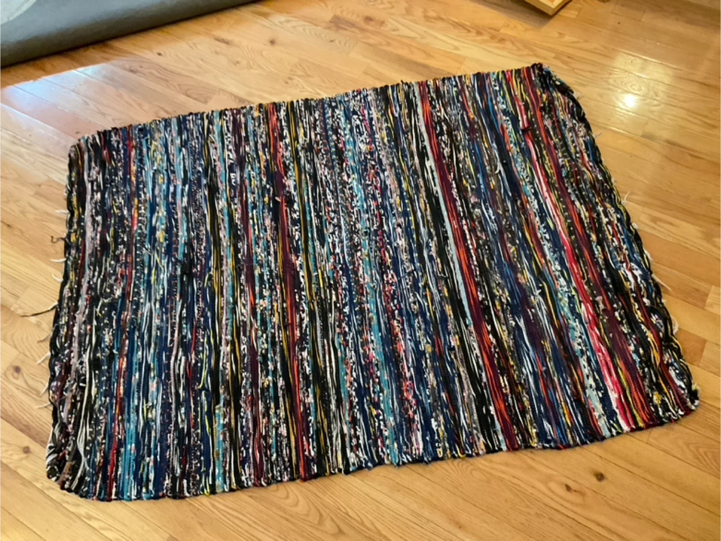 Colorful Hand Woven Egyptian Striped Rag Rug that would add a nice touch to any room! It features a variety of colors in a striped pattern, making it a unique and eye-catching piece
