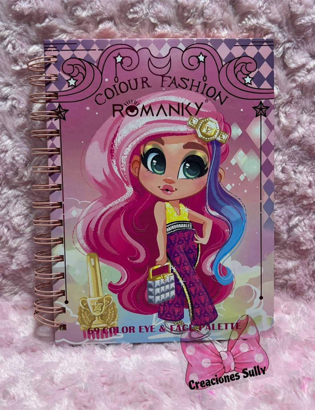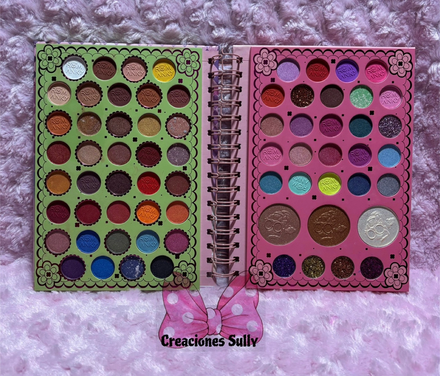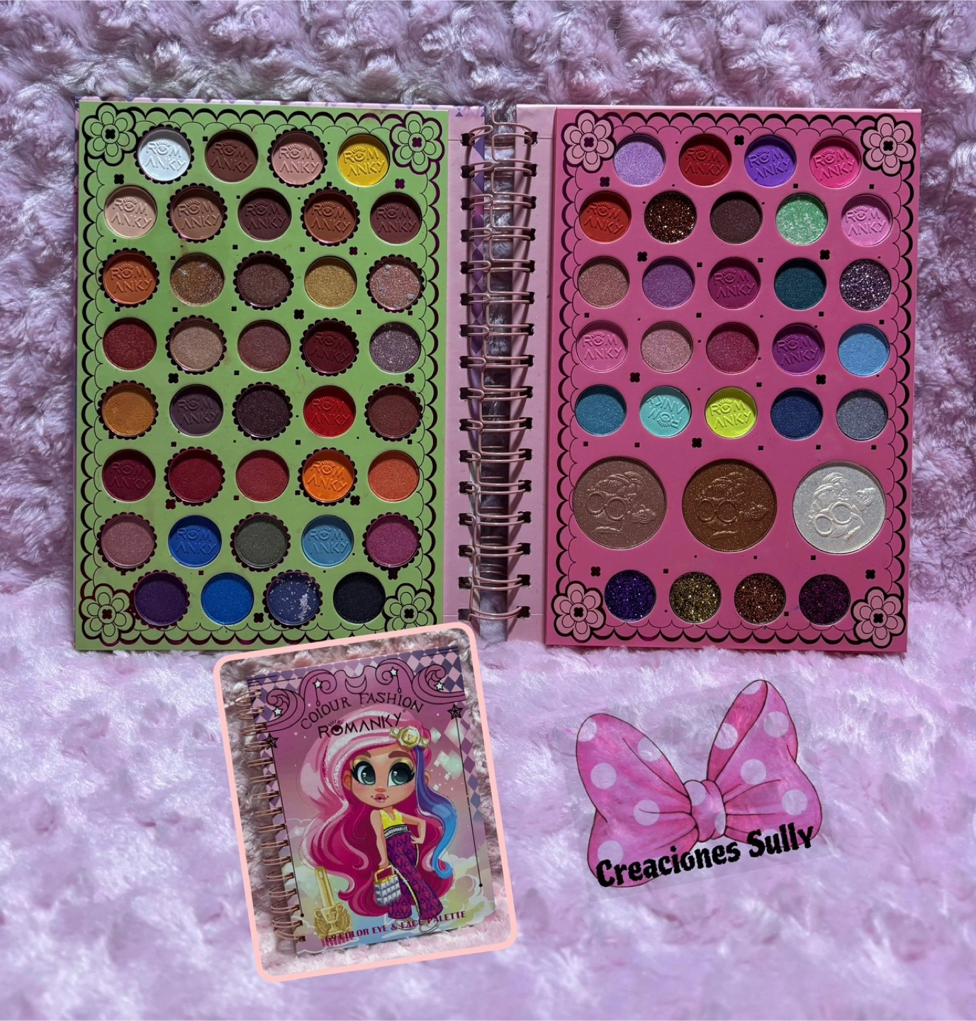 A large, colorful makeup palette with several eyeshadows and some face products. Features a spiral binding. It opens up to reveal many different shades. Use it to create some fun looks on a rainy day.