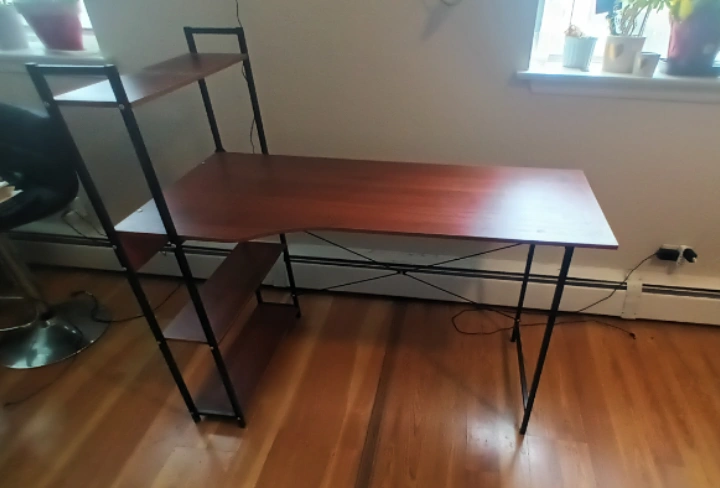 Computer desk with bookshelf. Brown wood top and black metal frame. Three- four shelves for storage. Great for home office or dorm room.
