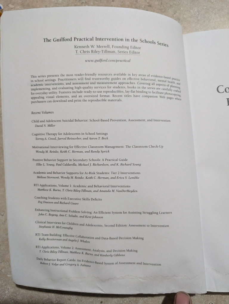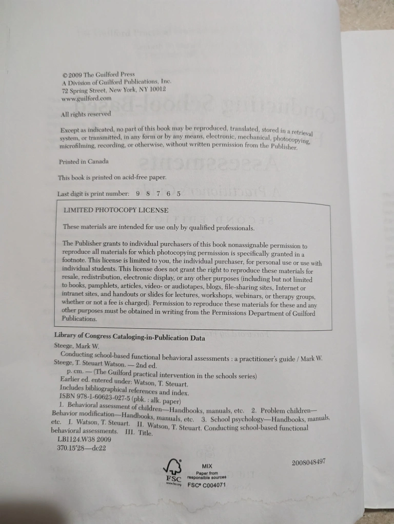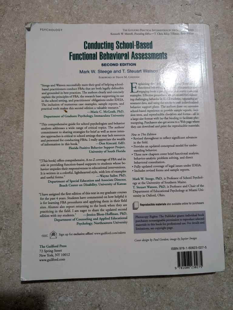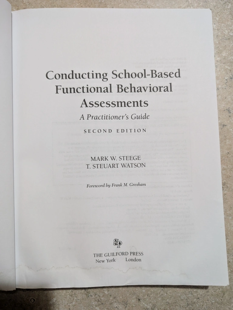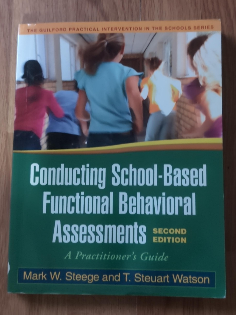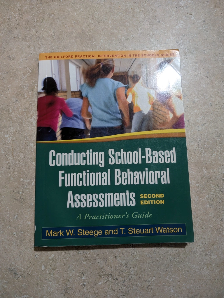 10I'm selling the book "Conducting School-Based Functional Behavioral Assessments" by Mark W. Steege and T. Steuart Watson. It's the second edition and a practitioner's guide. The series title is "The Guilford Practical Intervention in the Schools Series".