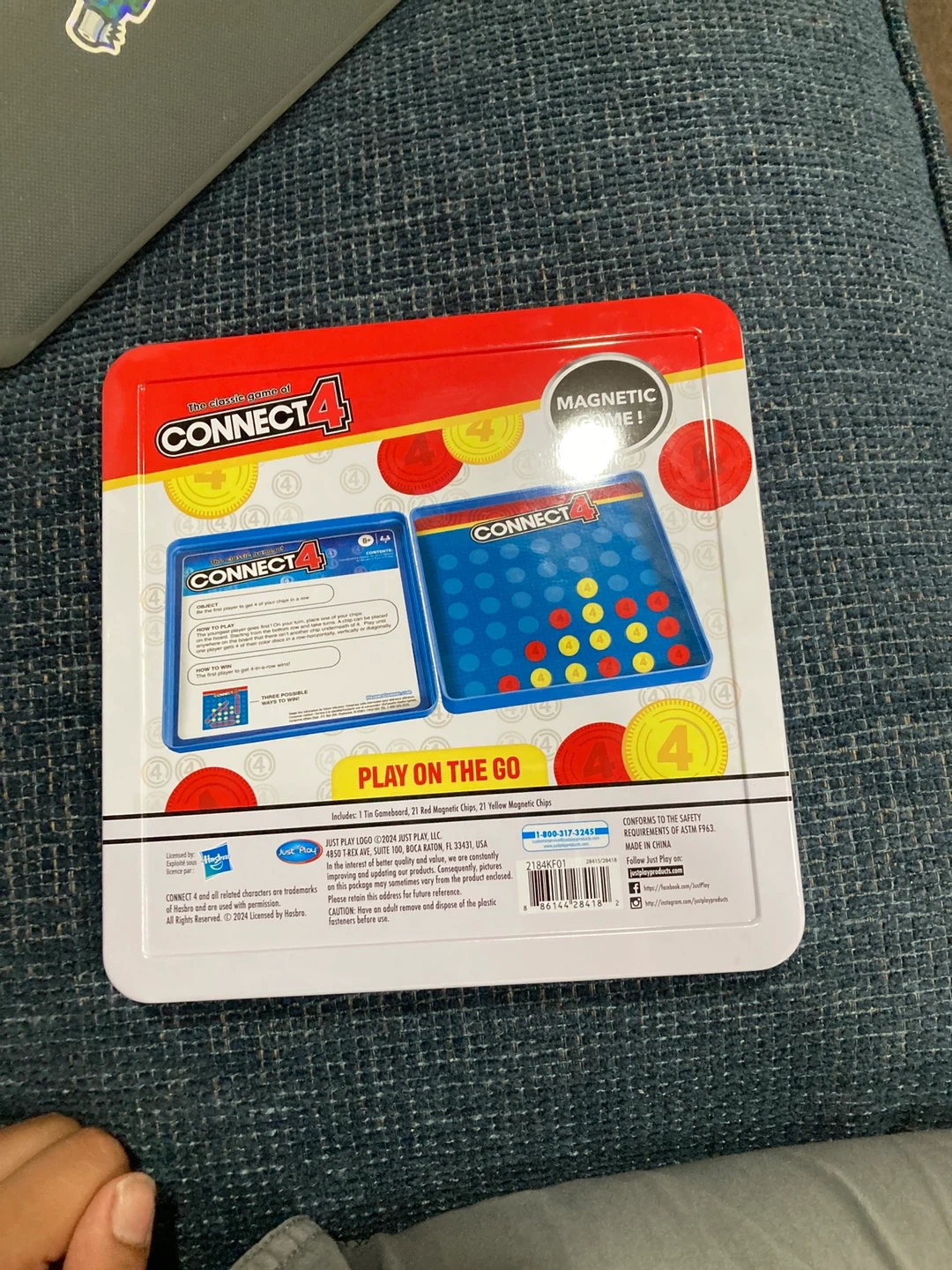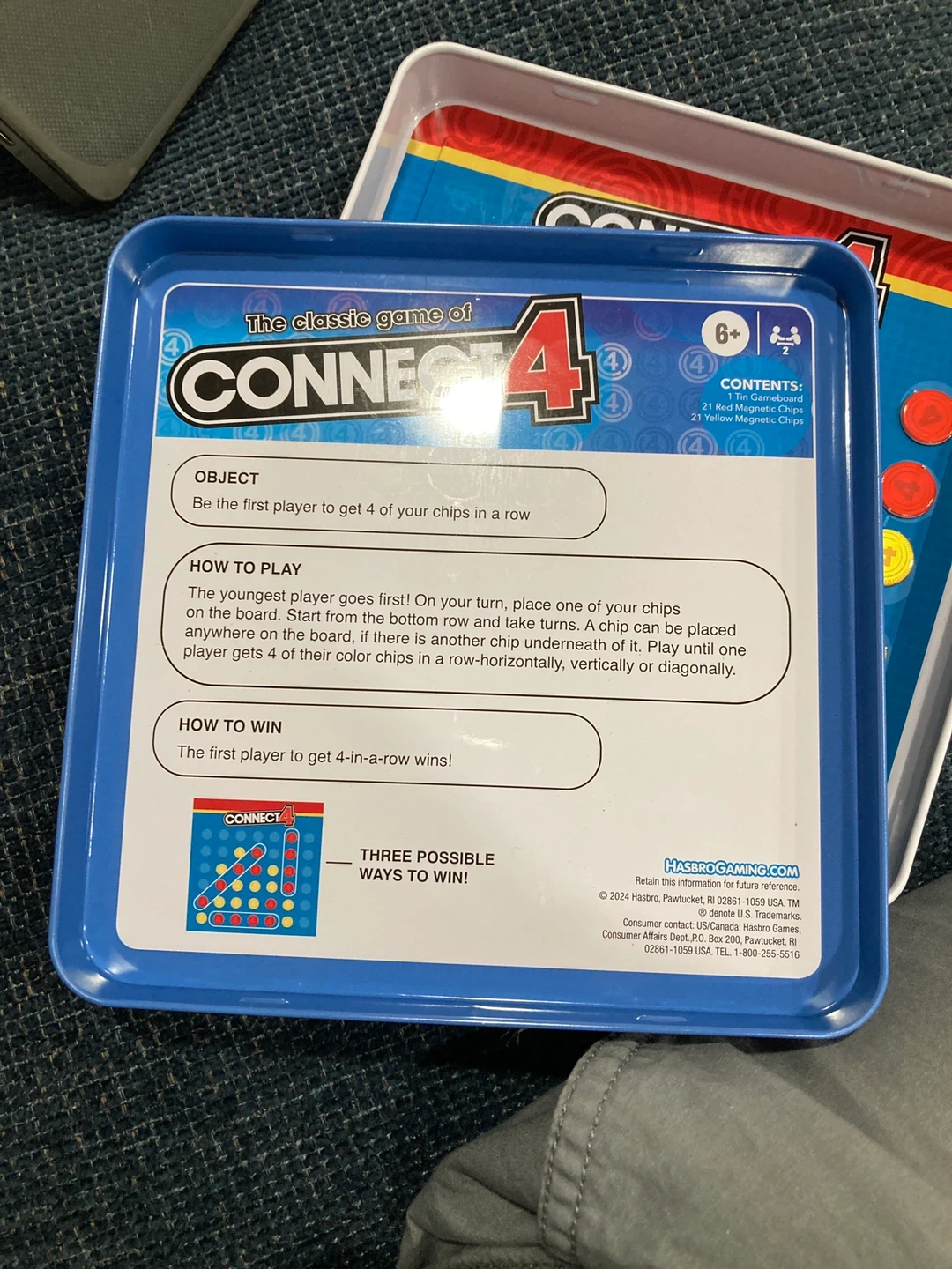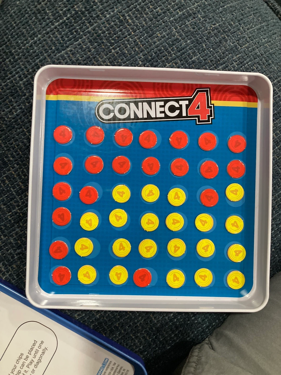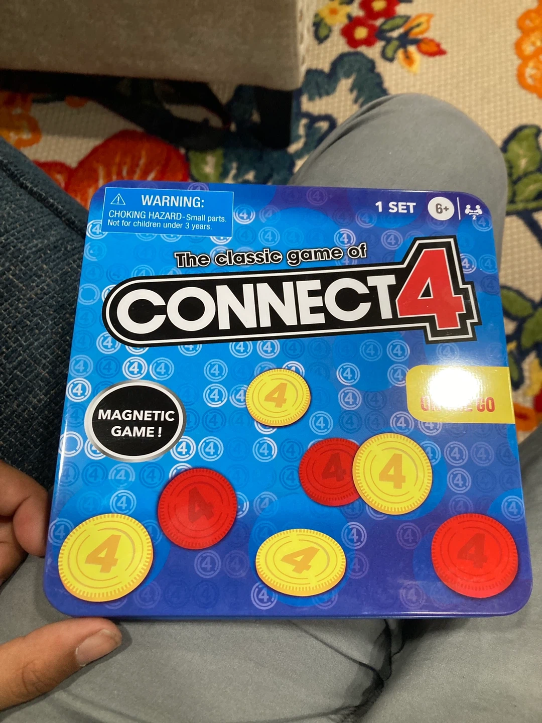 Selling a classic Connect 4 game! It's the magnetic travel version that's perfect for playing on the go. Includes 1 tin gameboard, 21 red magnetic chips, and 21 yellow magnetic chips. For ages 6+
