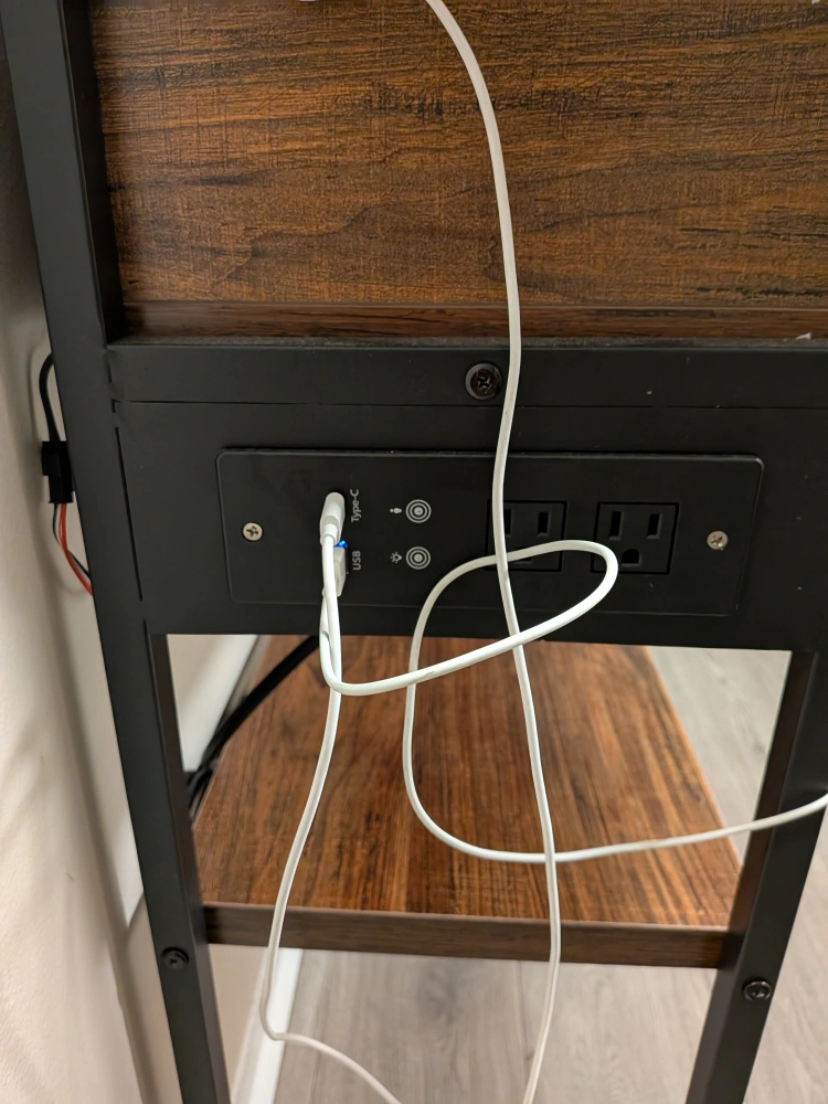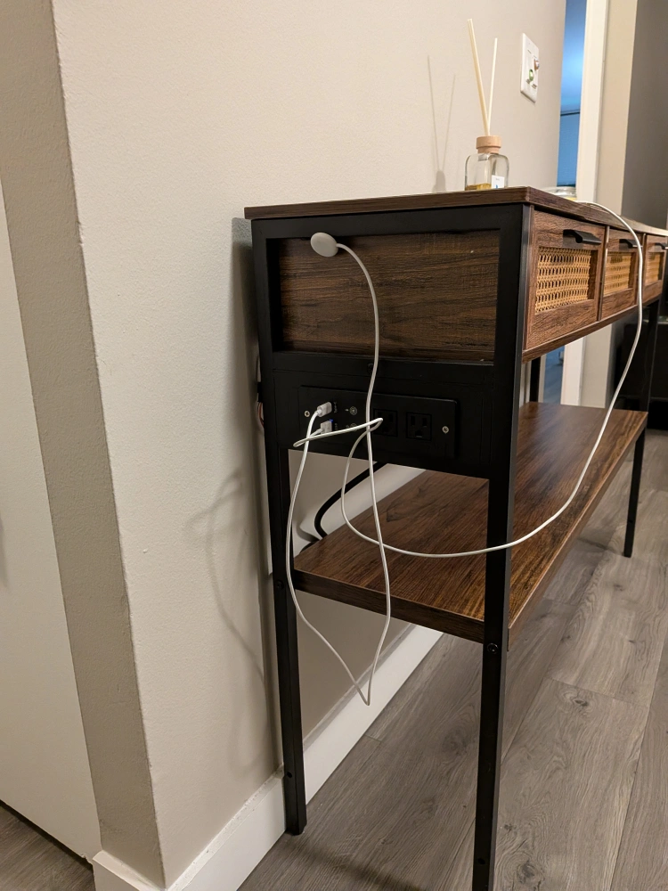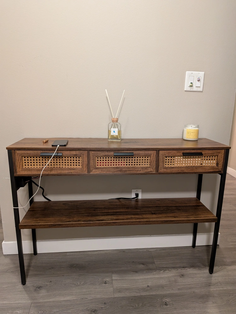 This is a console table with a built-in charging station. It has a wooden finish with black metal frame. The console table features drawers with a woven design and a lower shelf for extra storage. It's perfect for an entryway or living room