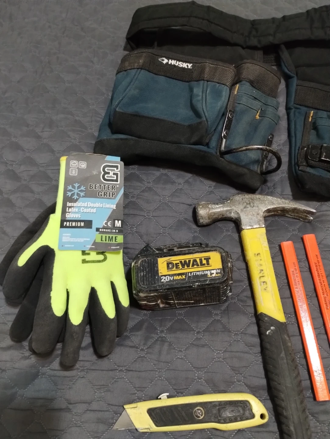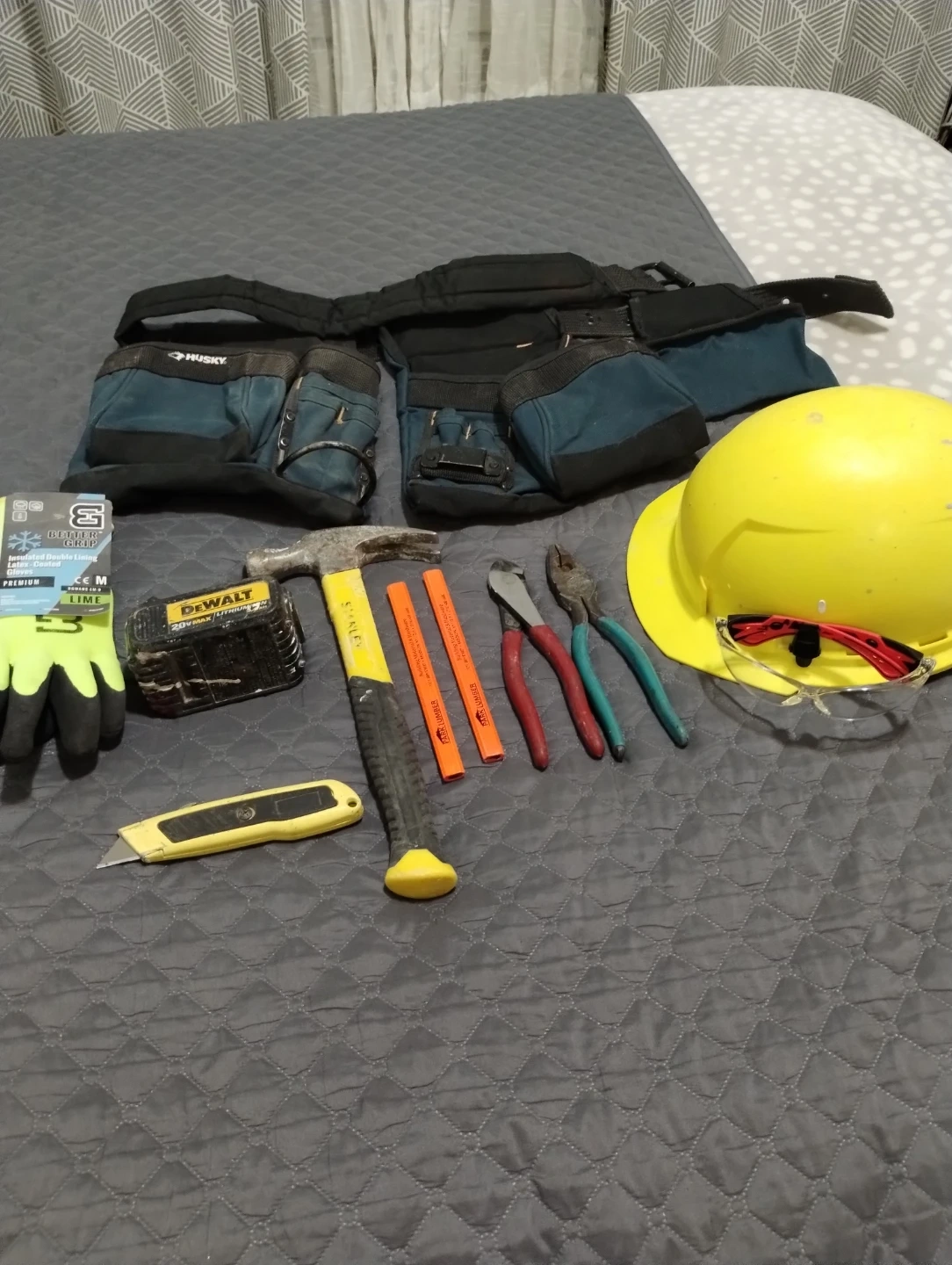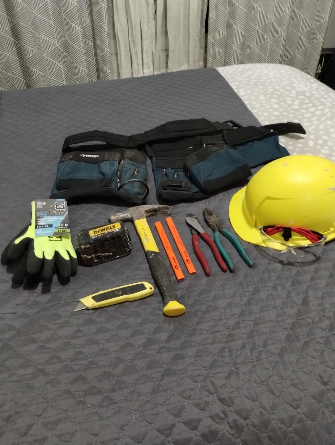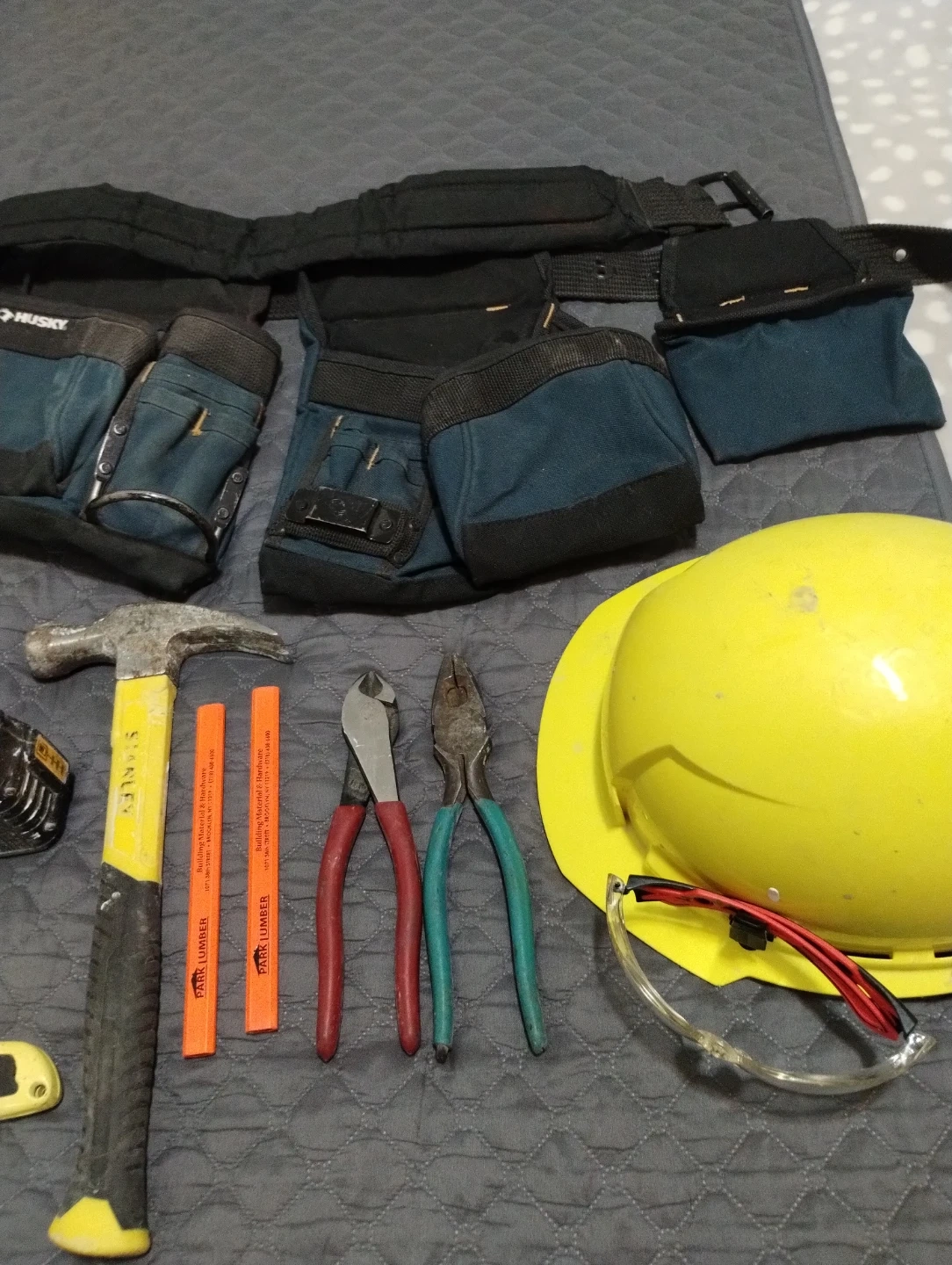 85Selling a construction tool set that includes a Husky tool belt, DeWalt battery, Stanley hammer, safety glasses, Better Grip gloves, utility knife, pliers, Park Lumber pencils, and a hard hat