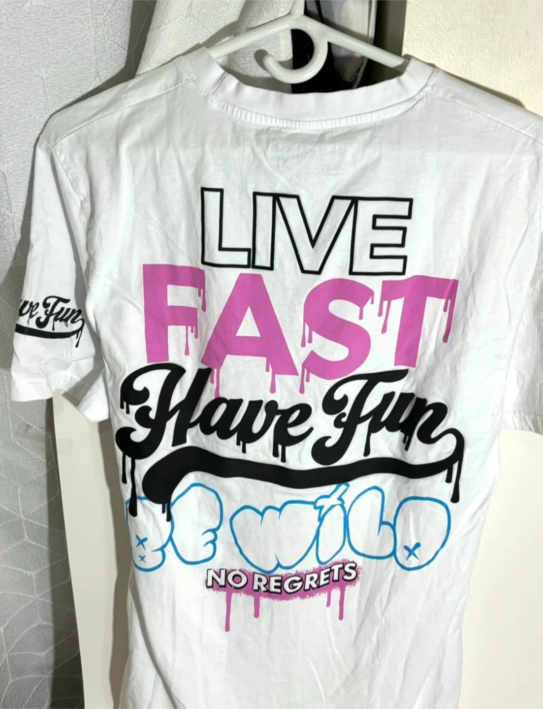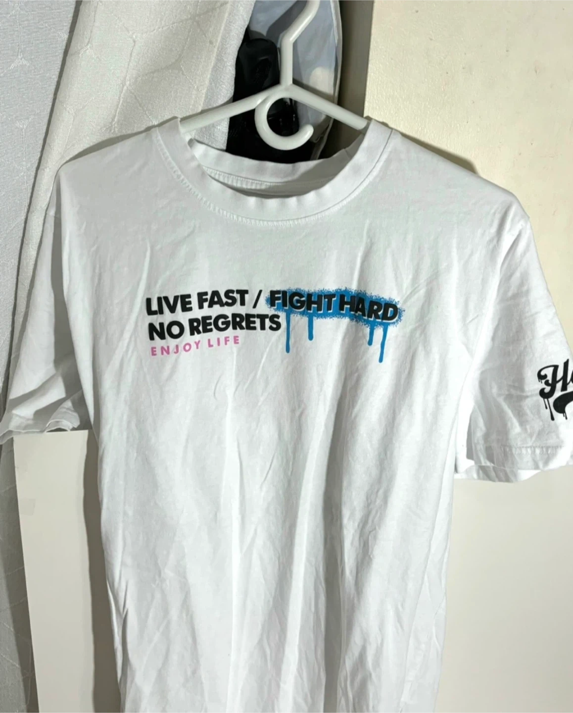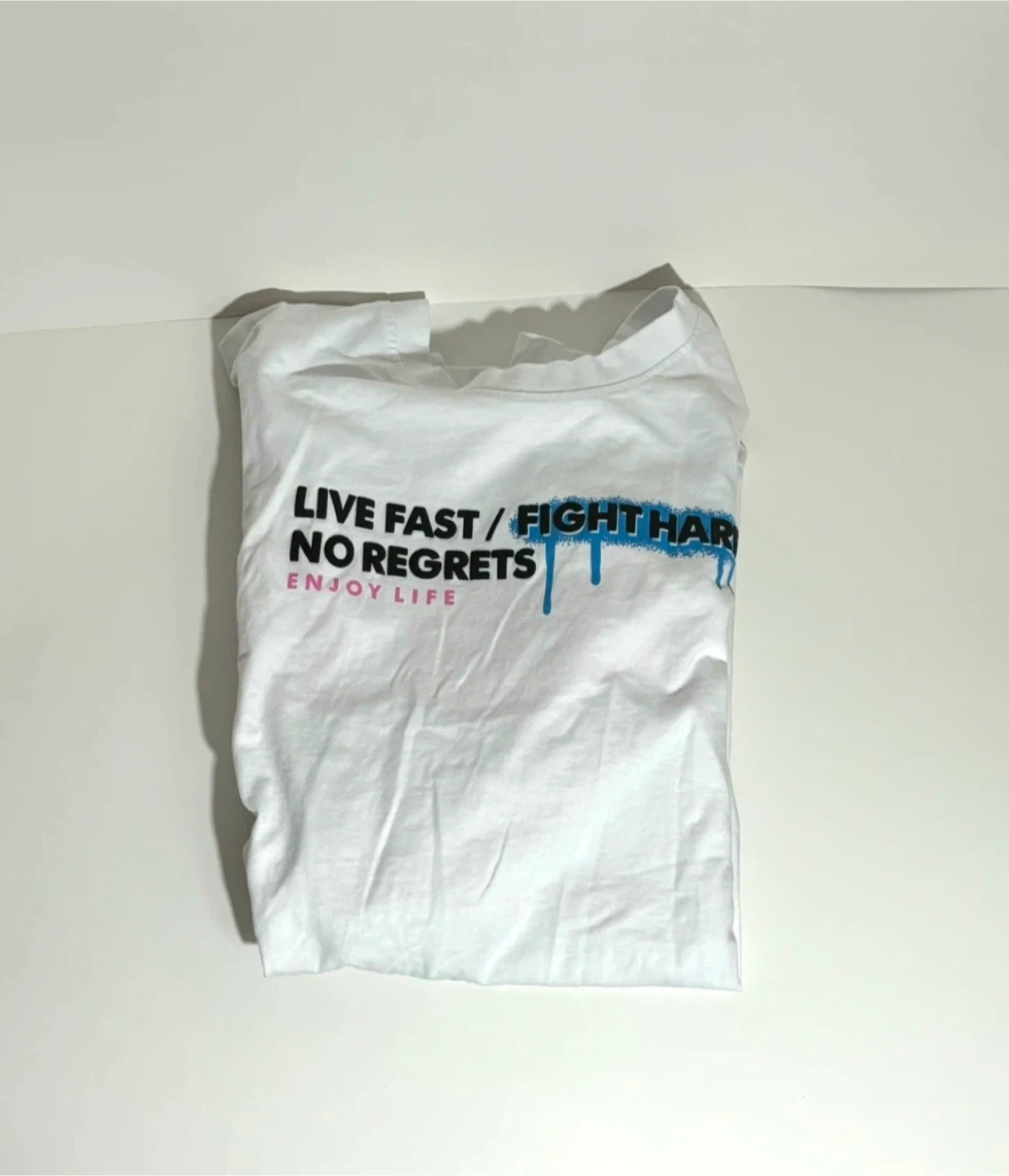 Selling a white graphic t-shirt with the print 'Live Fast/Fight Hard, No Regrets, Enjoy Life' on the front and 'Live Fast, Have Fun, No Regrets' on the back. It's in great condition and ready for a new home!