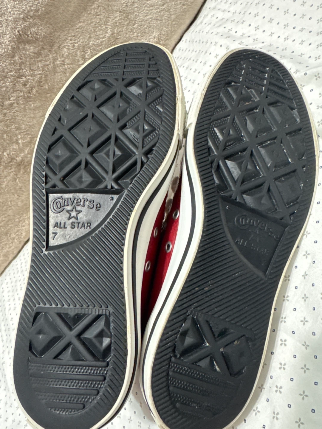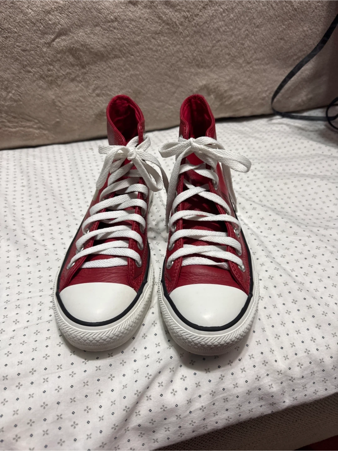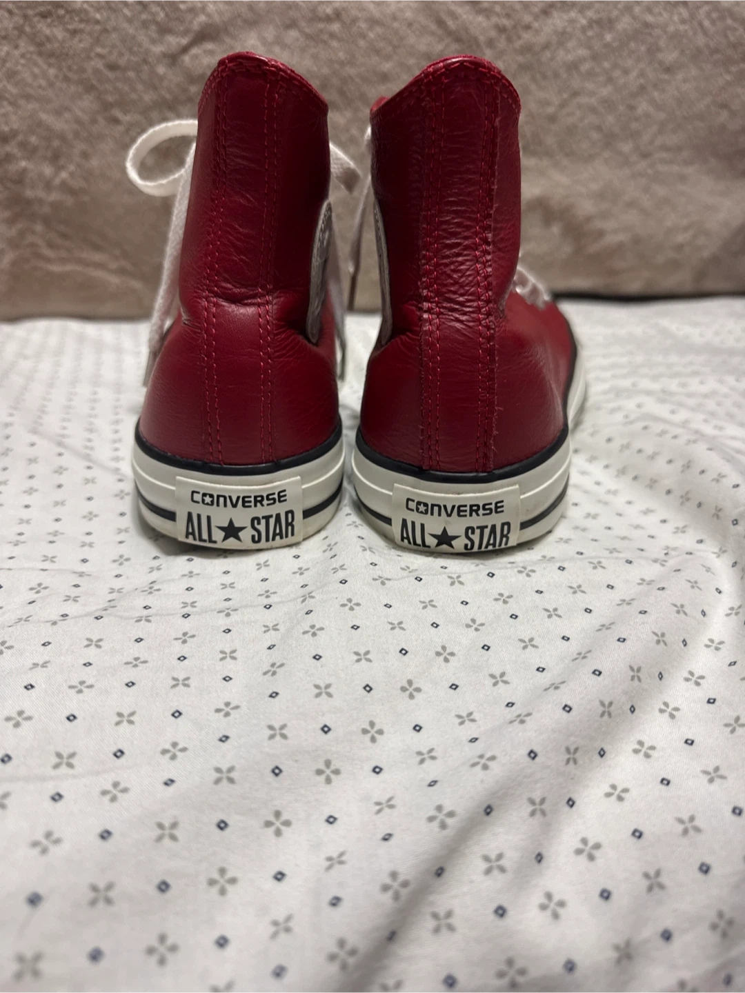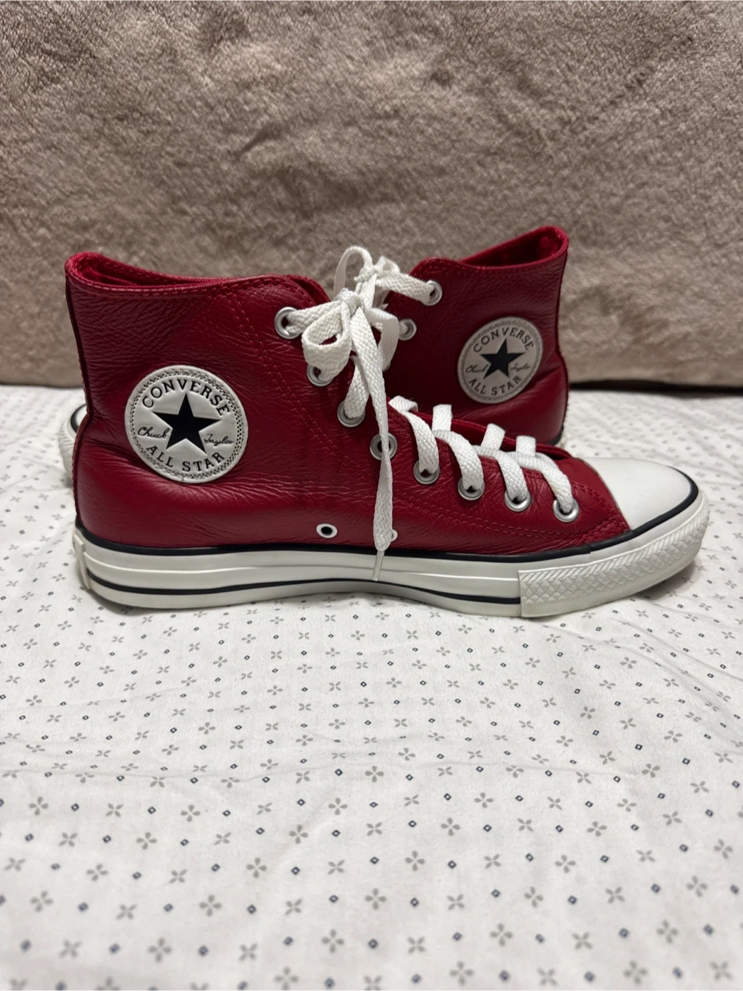 Selling a pair of red leather Converse All Star high tops! They're in great condition and ready for a new home. The size is a women's 7.