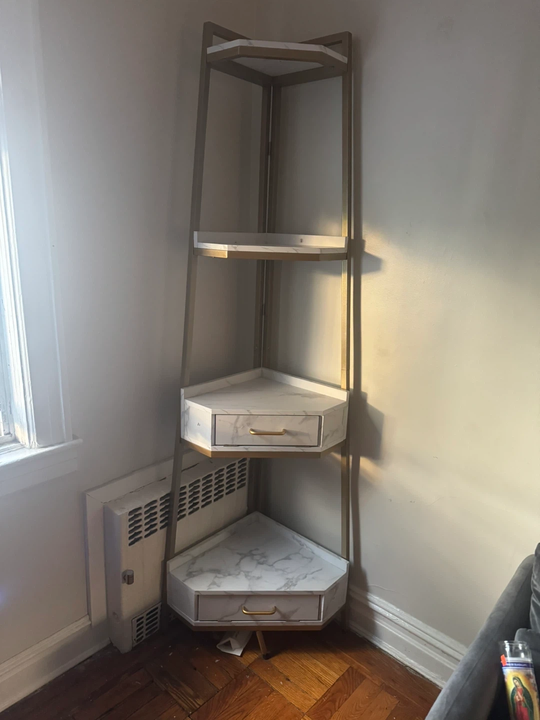 Selling a corner shelf with two drawers! The frame is gold and the shelves and drawers have a marble pattern. It's perfect for adding some extra storage and style to any corner of your home. It has a modern look and is in great condition