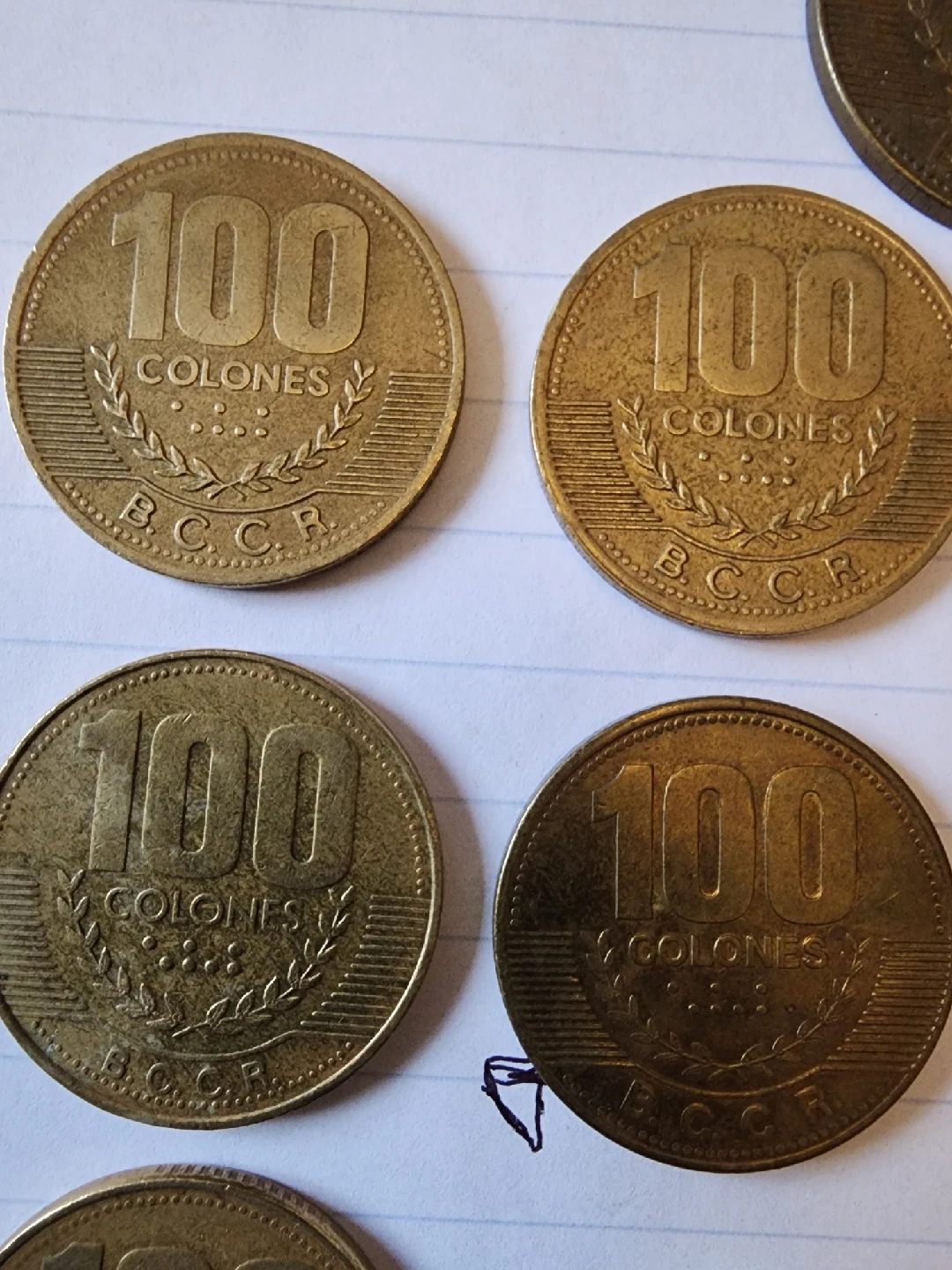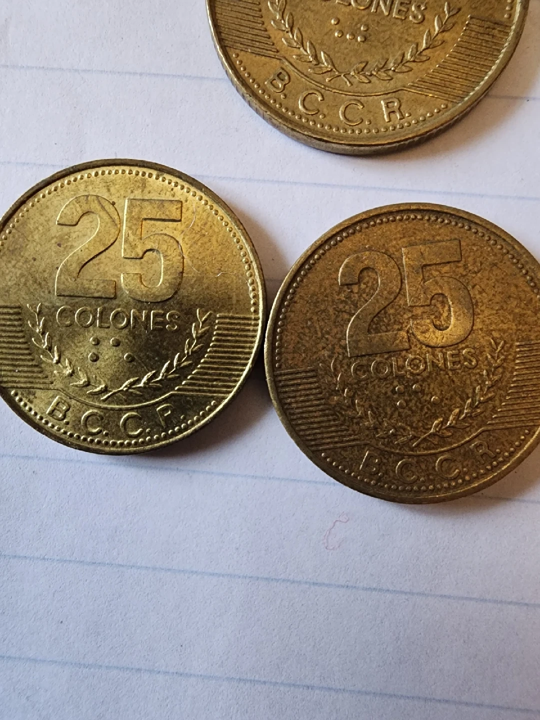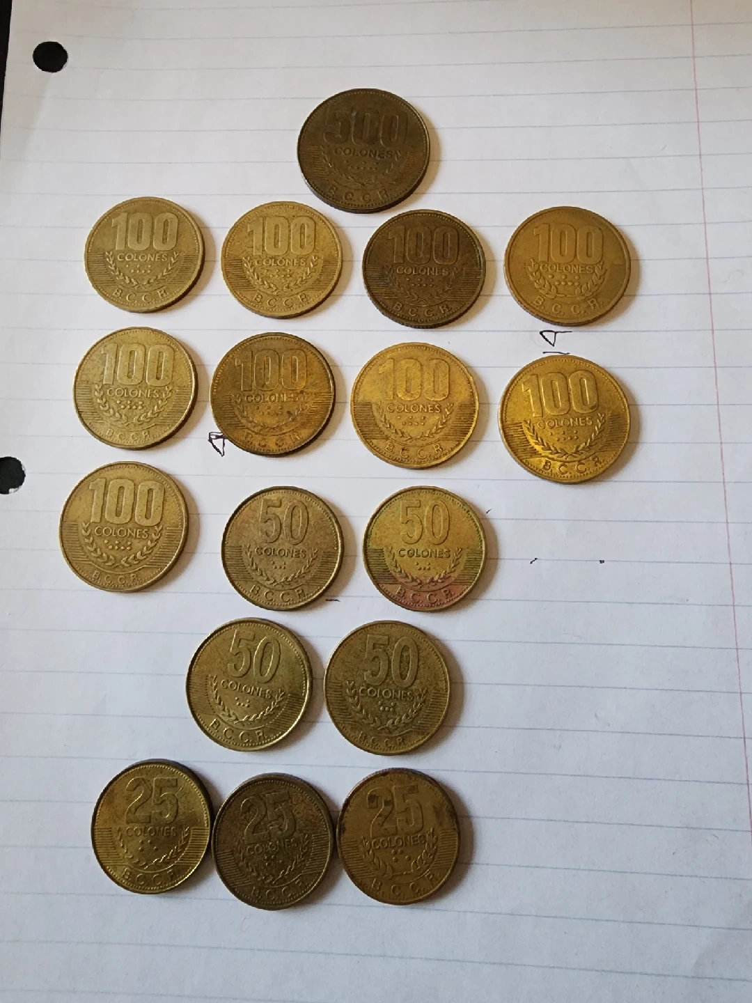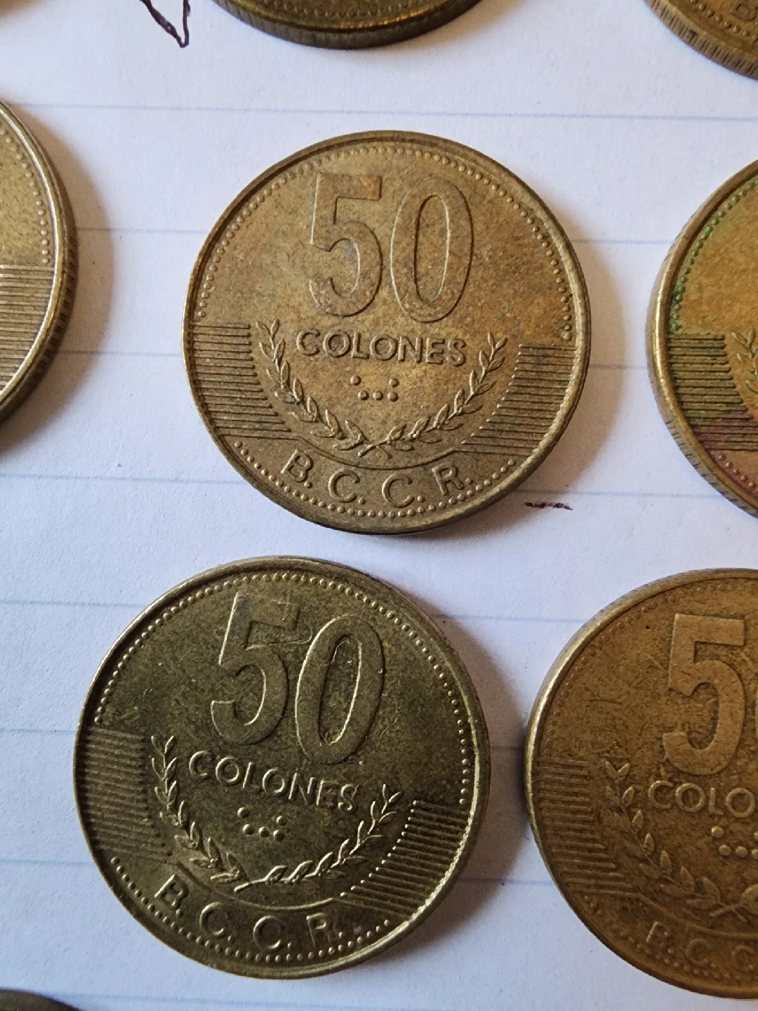 141Selling a collection of Costa Rican Colones coins. The denominations include 3 coins of 25,colones 4 coins of 50 colones , 9 coins of 100 colones , and 1. coin of 500 Colones. They are used but in decent condition for their age. Great for collectors or anyone interested in Costa Rican currency! please feel free to reach out