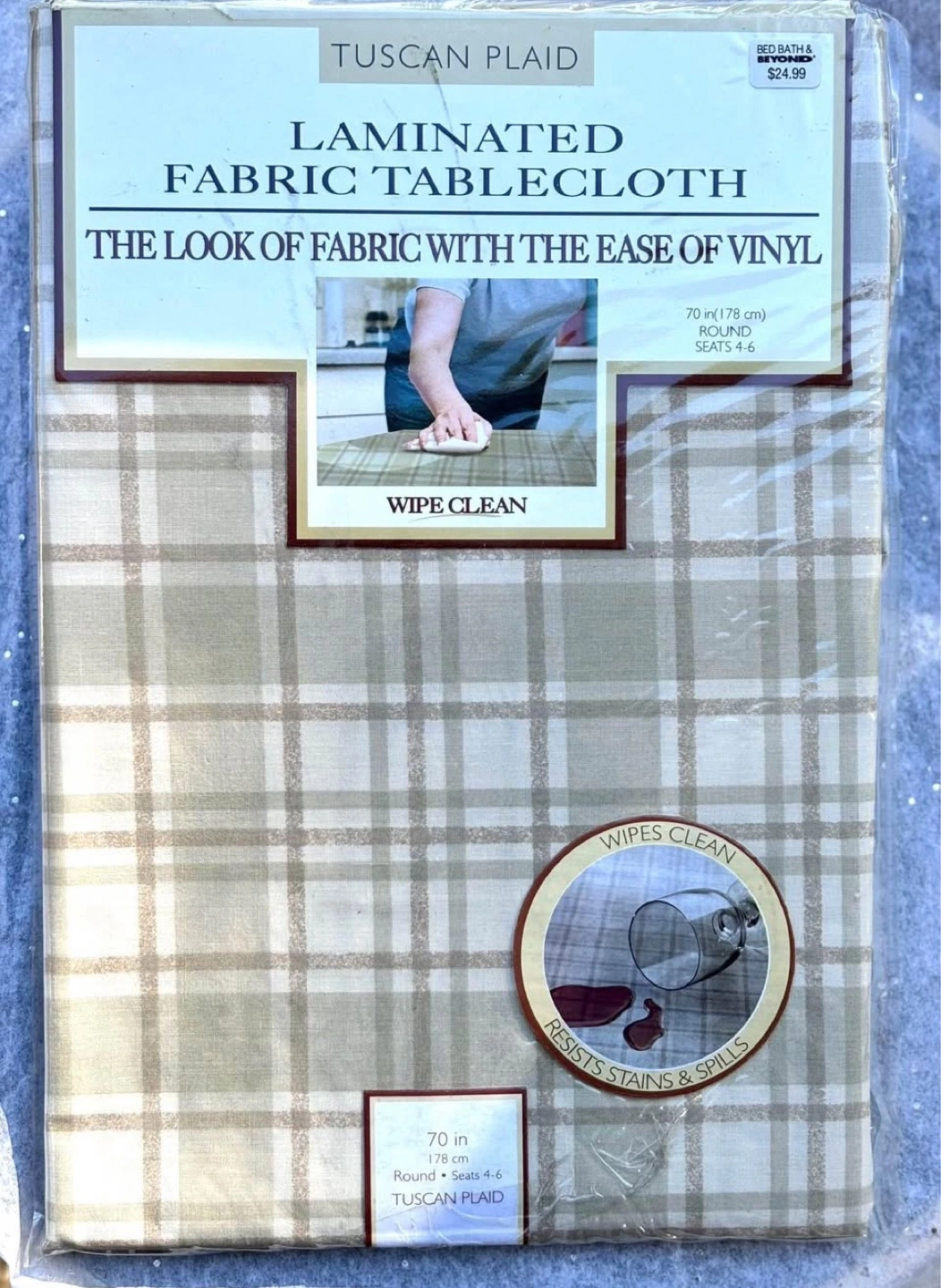 15Cotton-Blend Laminated Round Tablecloth 70” New in Package Beige & White Plaid Resists Stains & Spills (Retails at $24.99) * Features the look of fabric with the ease of vinyl * Stylish Tucson Plaid * Wipe clean or machine washable * 52% Polyester, 48% Cotton
