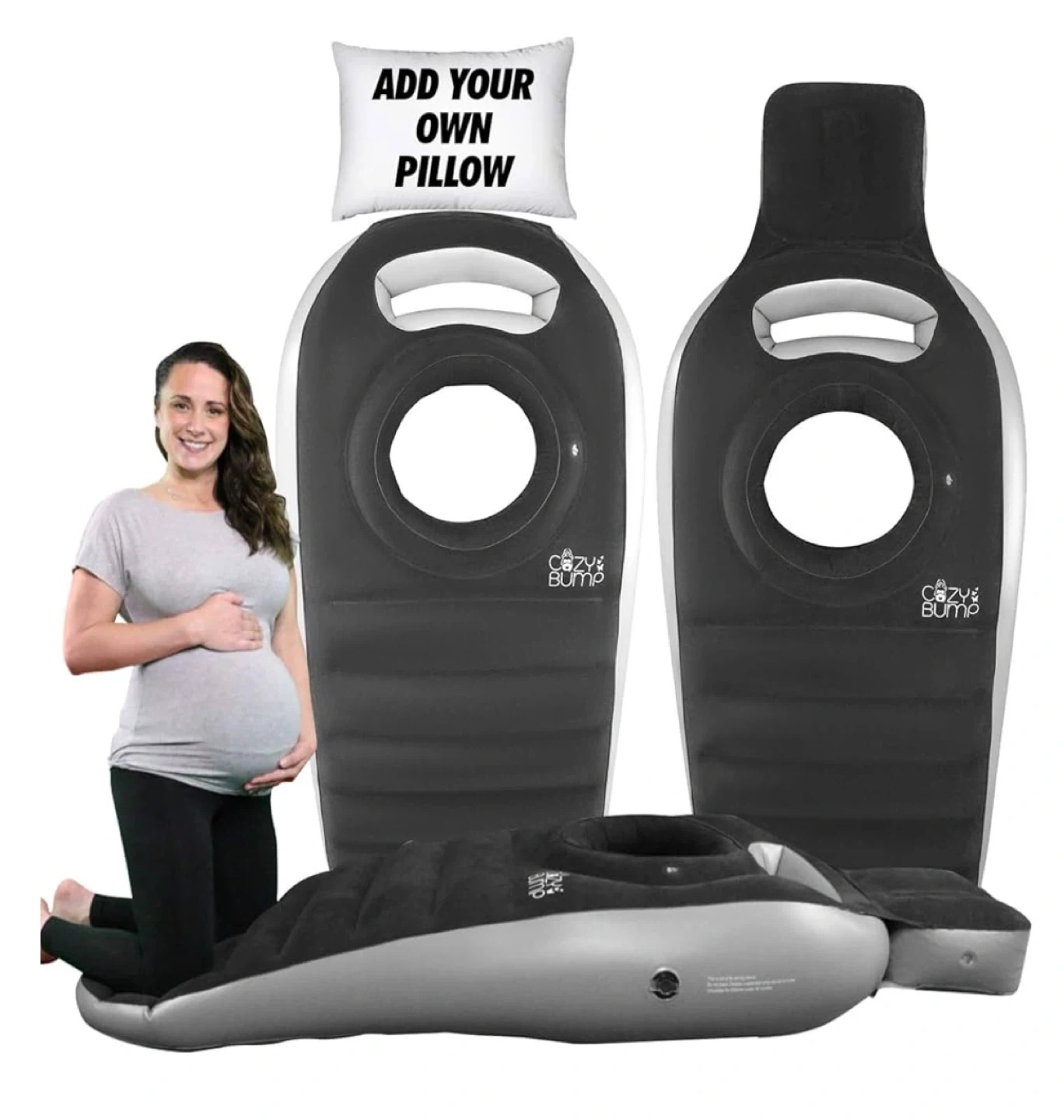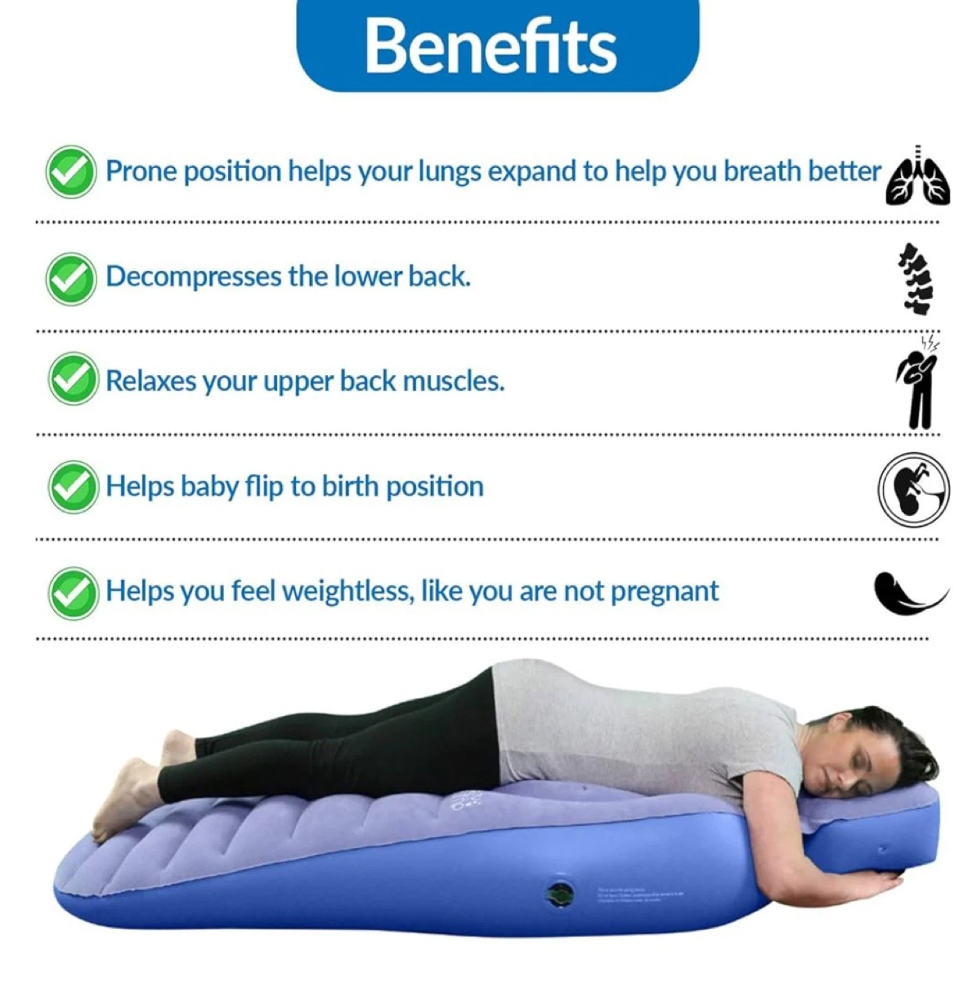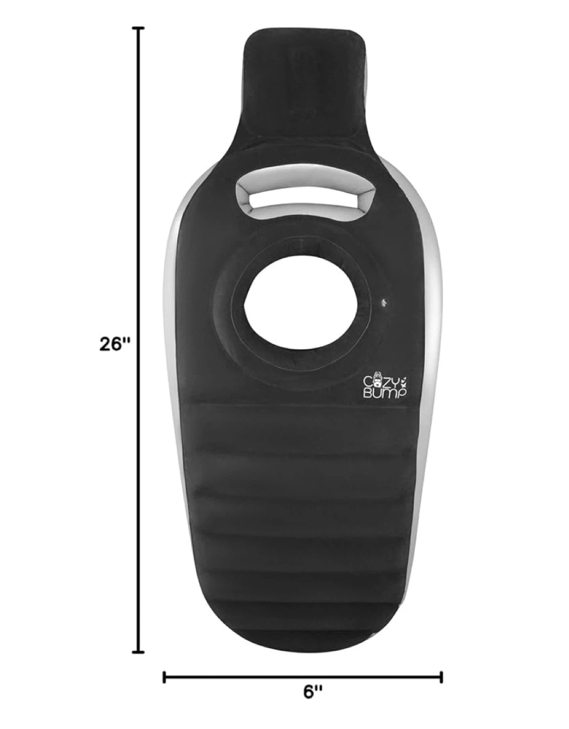 This Cozy Bump inflatable pillow helps decompress the lower back and relaxes your upper back muscles. It also helps baby flip to birth position and helps you feel weightless. Dimensions are 26" x 6". Add your own pillow! Good condition, I only used it during my pregnancy.