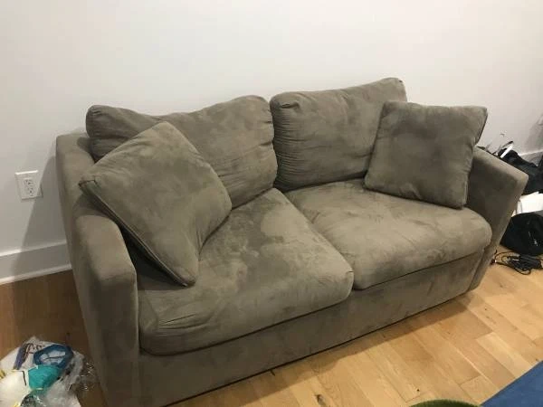 0Cozy gray sofa in good condition. 5'7" X 2'10" from arm to arm, and from front of cushions to the back Soft microfiber material Comes with little pillows in the pic Coming from nonsmoking pet free home. I can deliver this for free