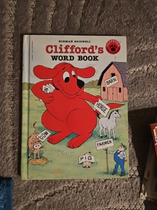 This is Clifford's Word Book by Norman Bridwell. It's a children's book designed to teach words. The book features Clifford the Big Red Dog and various farm-related words.