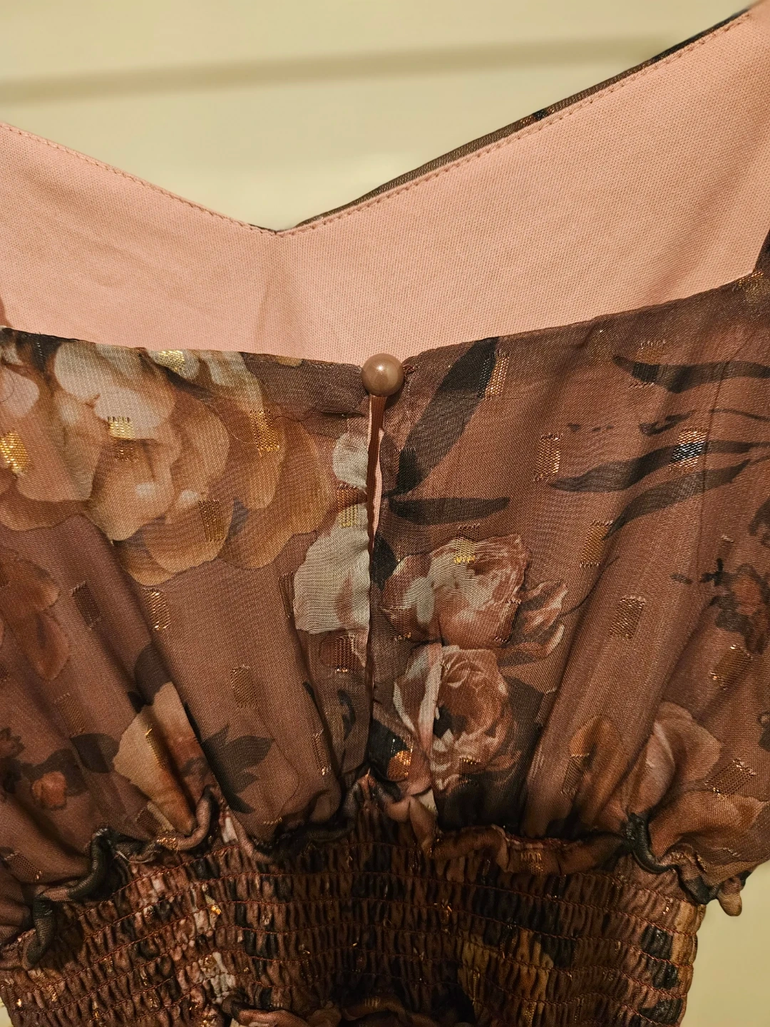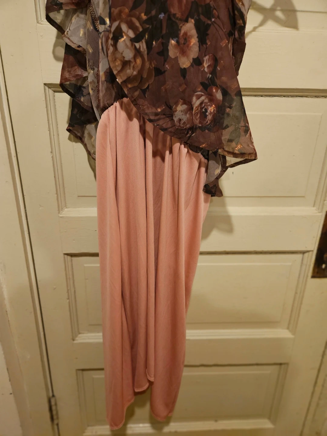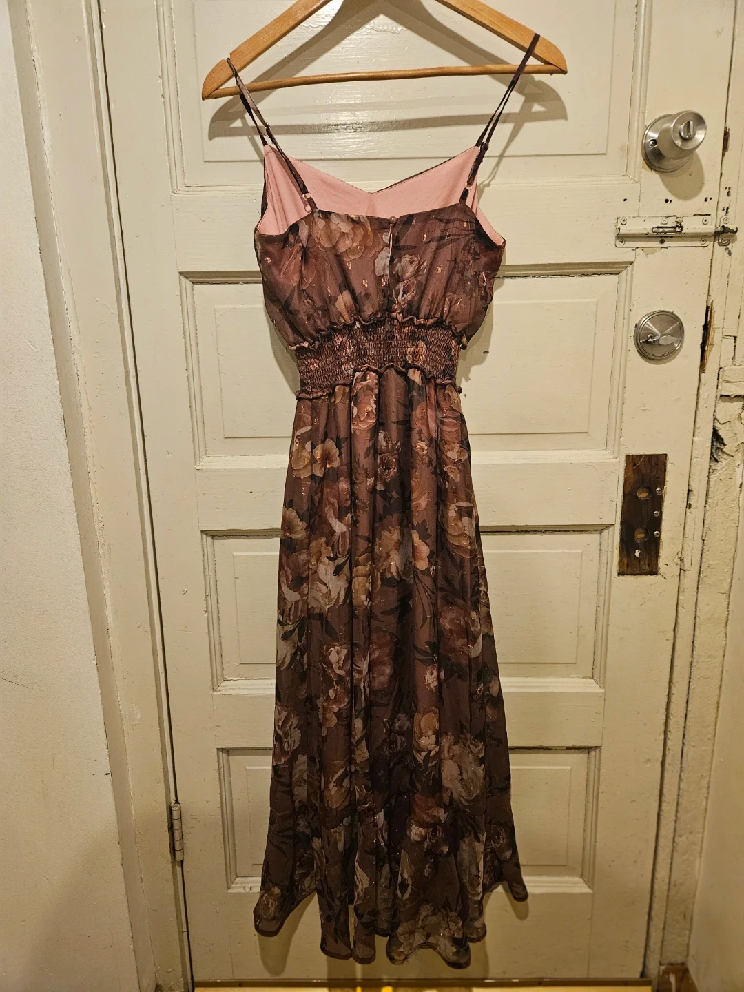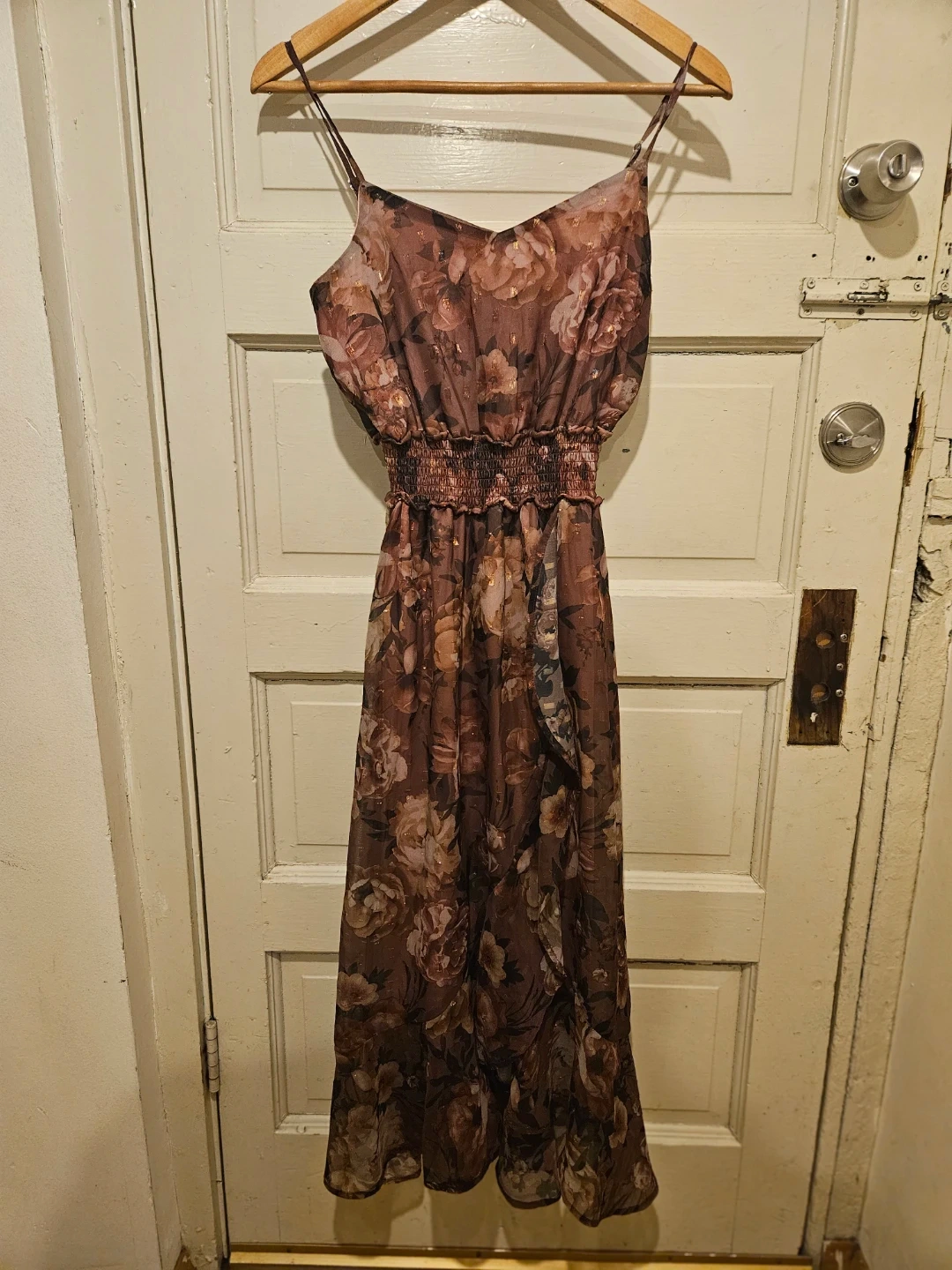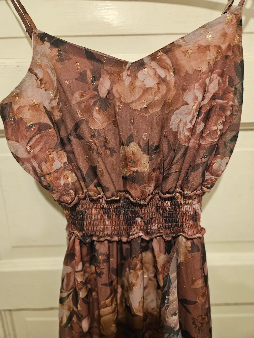 Sheer floral print maxi dress with a smocked waist and ruffled hem. Lined with a pink slip. Made in Vietnam.
