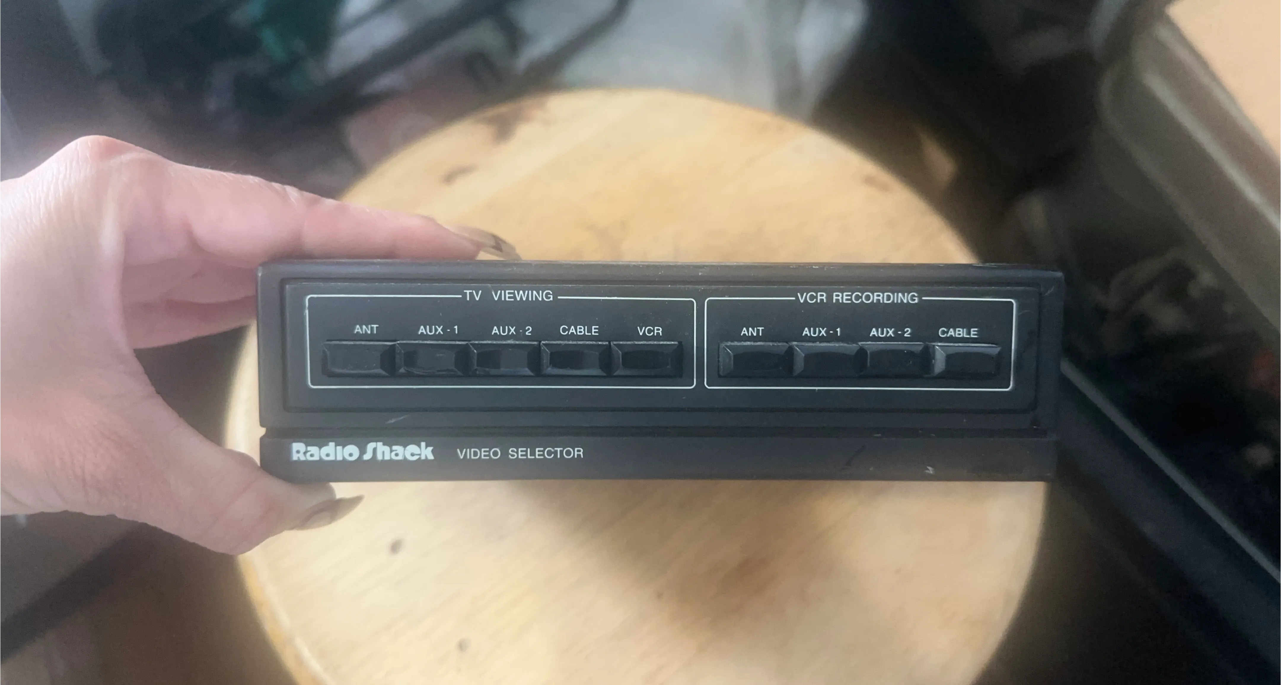 This is a Radio Shack video selector with buttons for TV viewing and VCR recording. It has inputs for ANT, AUX-1, AUX-2, CABLE, and VCR. This selector helps manage multiple audio/video sources.