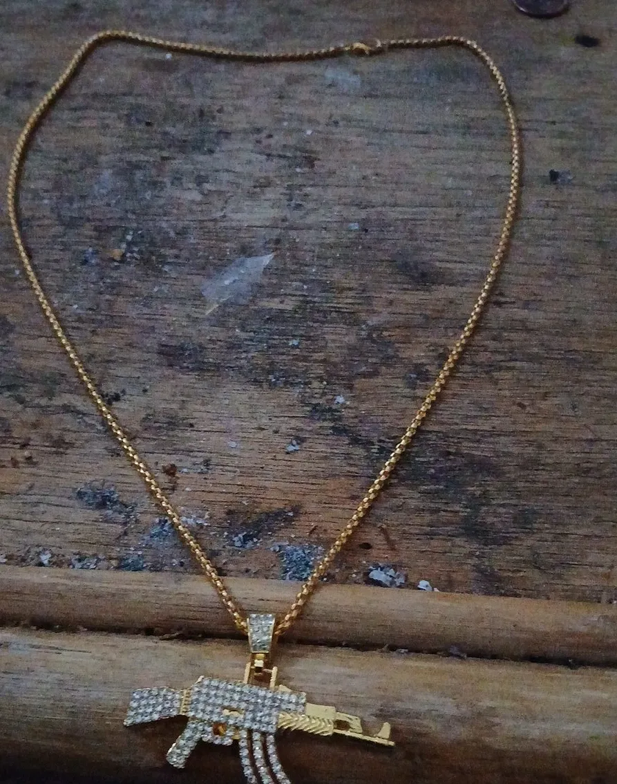 This pendant necklace features a gold-tone chain and a detailed AK-47 pendant. The pendant is encrusted with clear rhinestones for a sparkling finish. It's a statement piece that adds flair to any outfit.