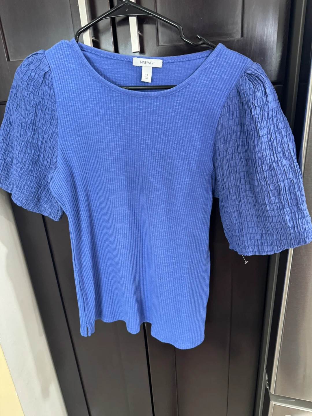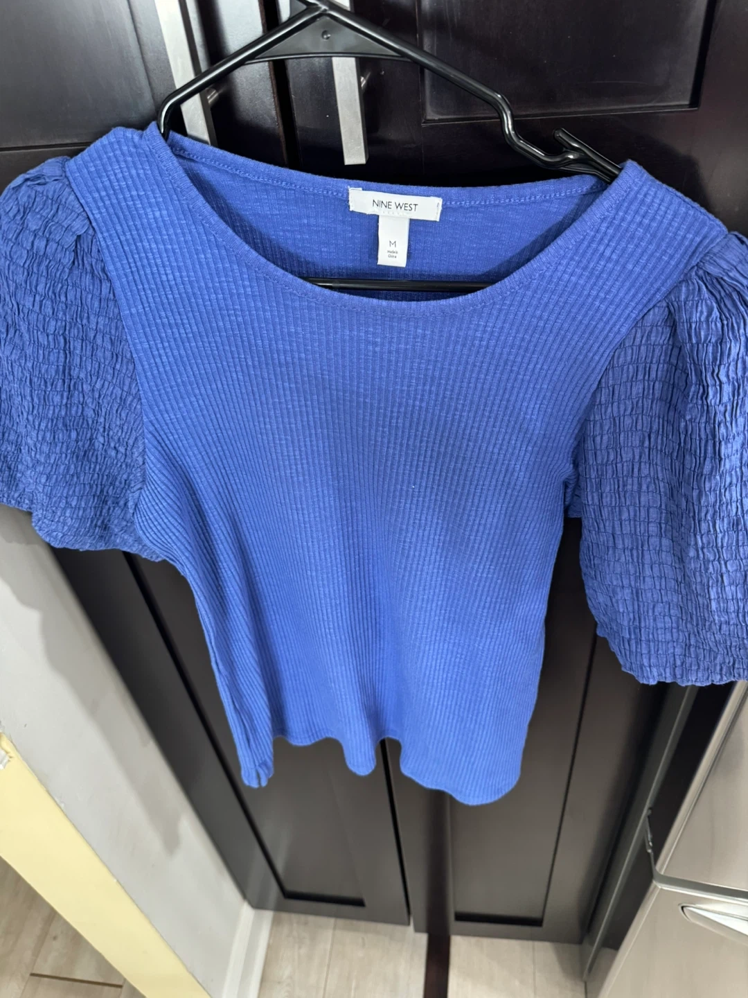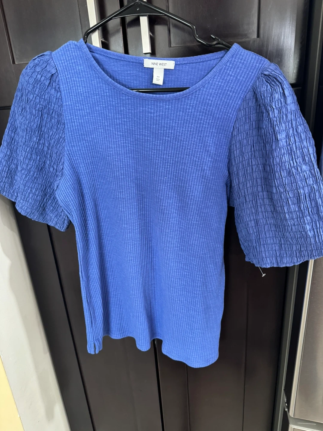 A Nine West women's top in blue. It's a size medium with short, textured puff sleeves. The main body of the shirt is a ribbed knit.