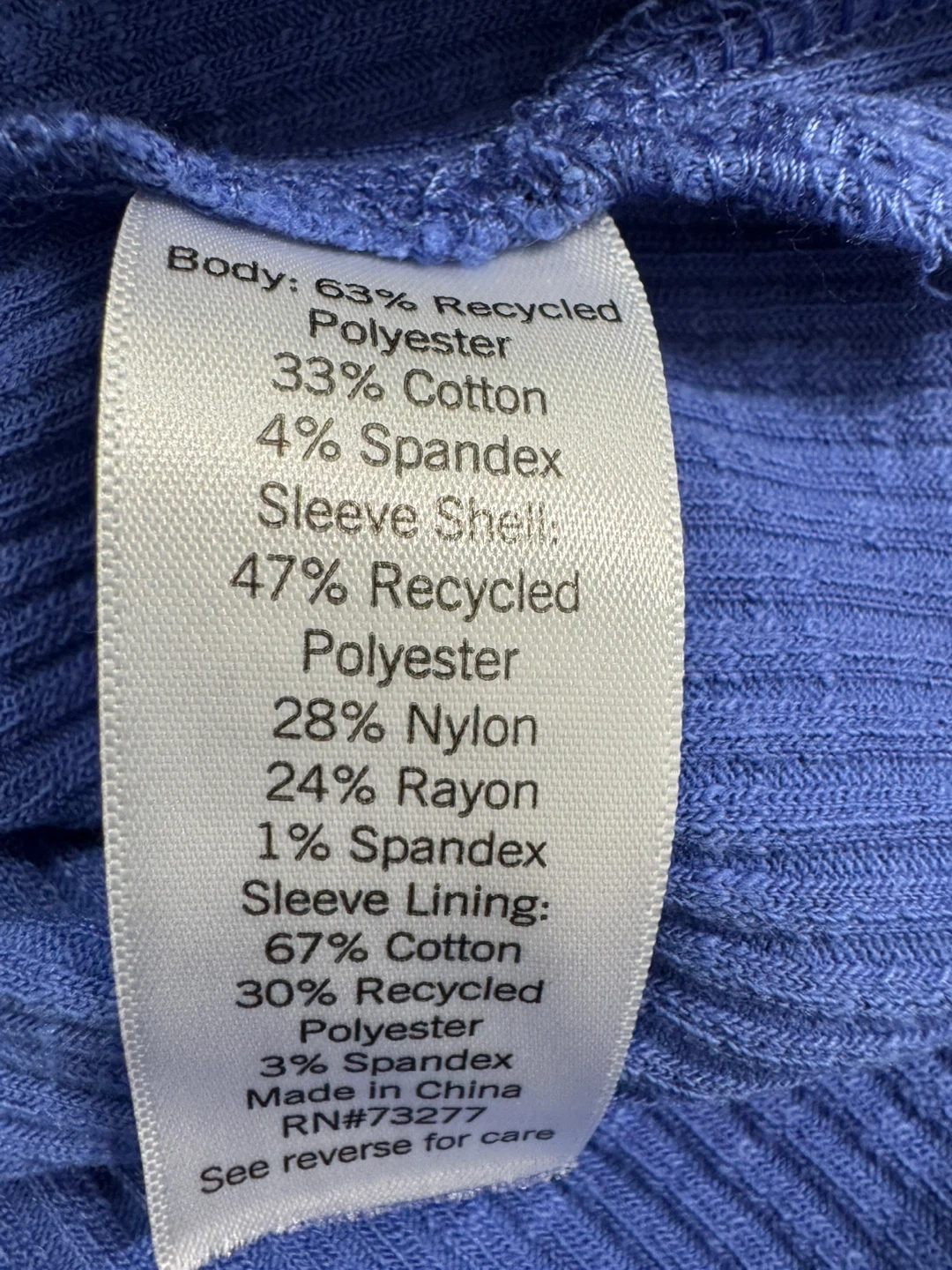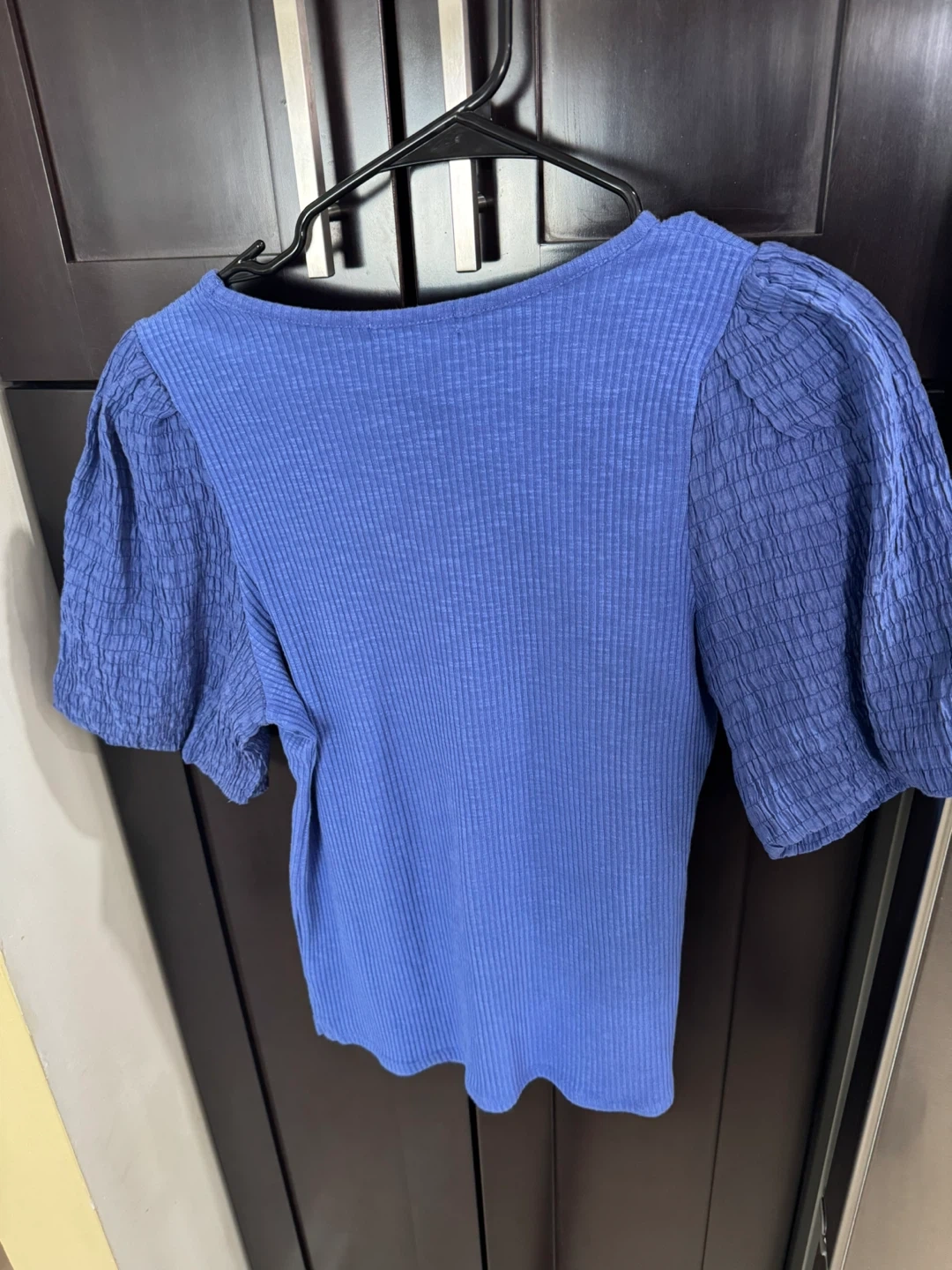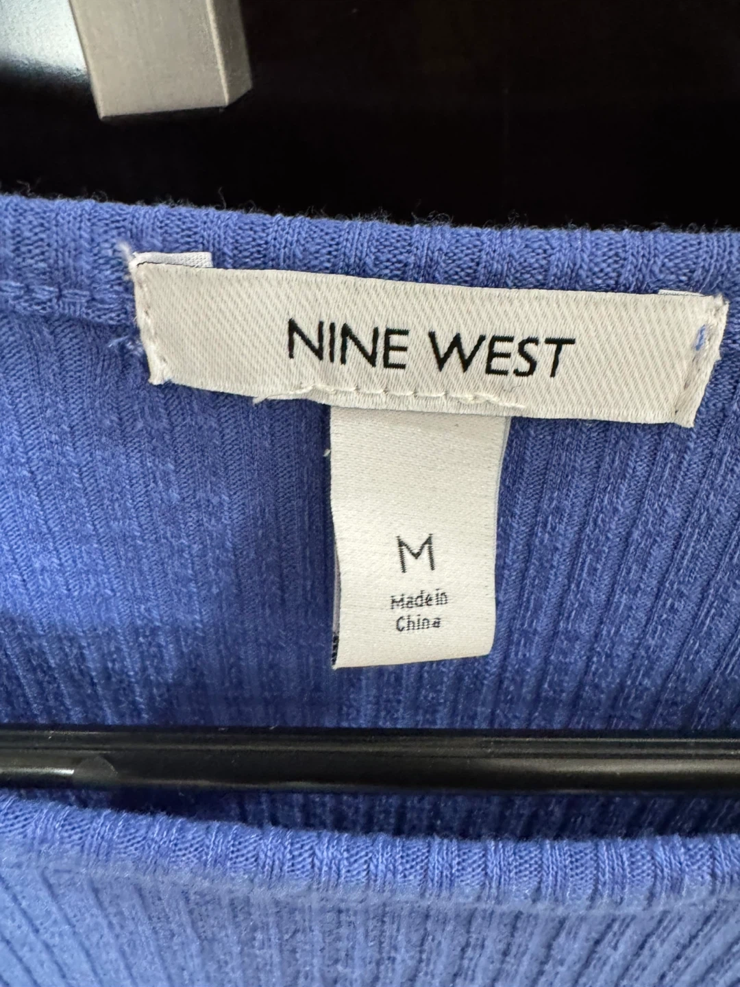 A Nine West women's top in blue. It's a size medium with short, textured puff sleeves. The main body of the shirt is a ribbed knit.