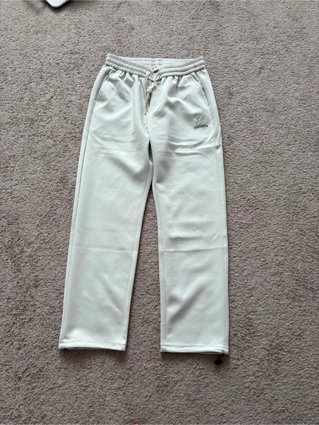 Light grey Louis Vuitton sweatpants. These pants feature a drawstring waist and a back pocket. Comfortable material for casual wear. 1:1