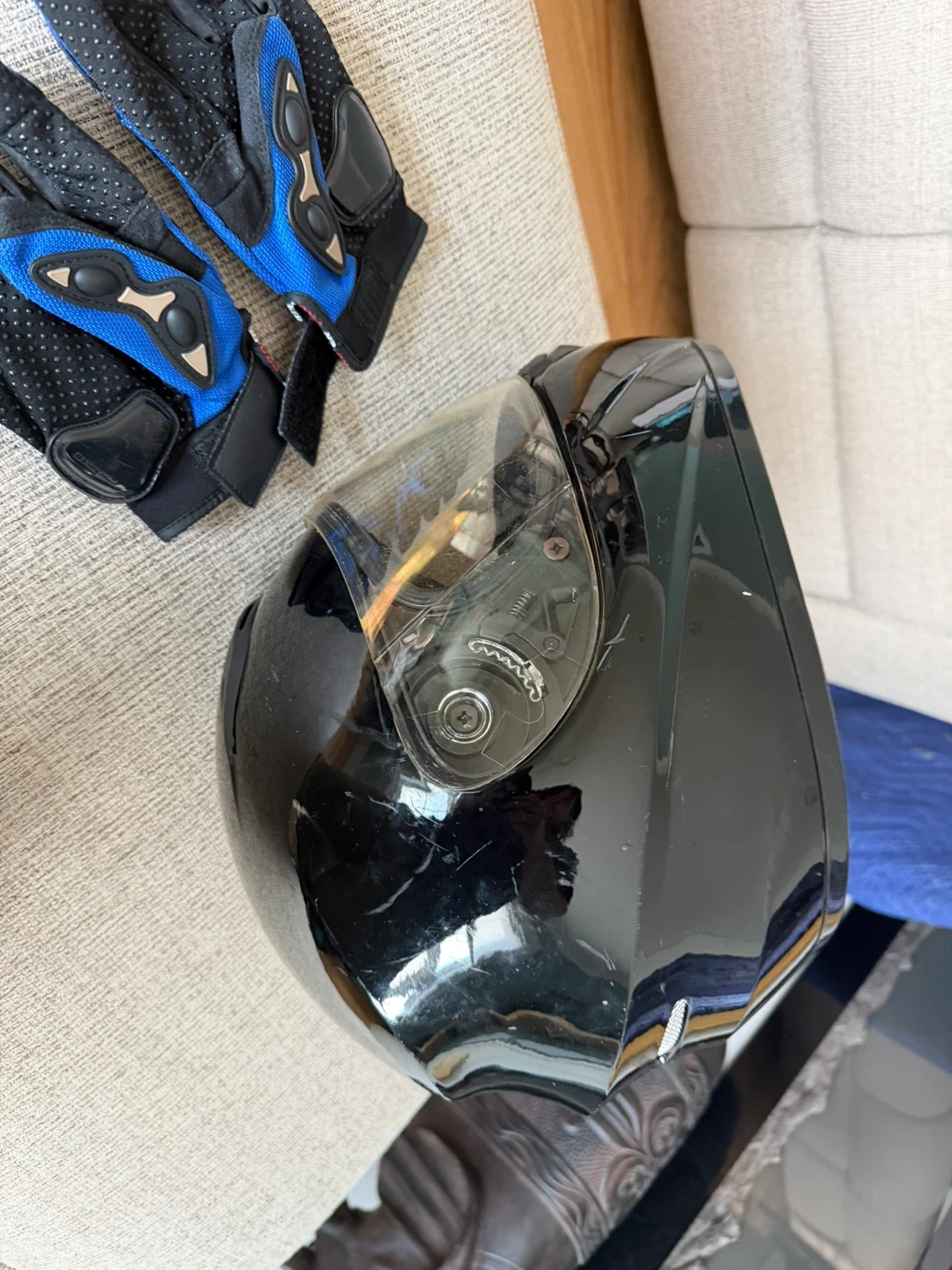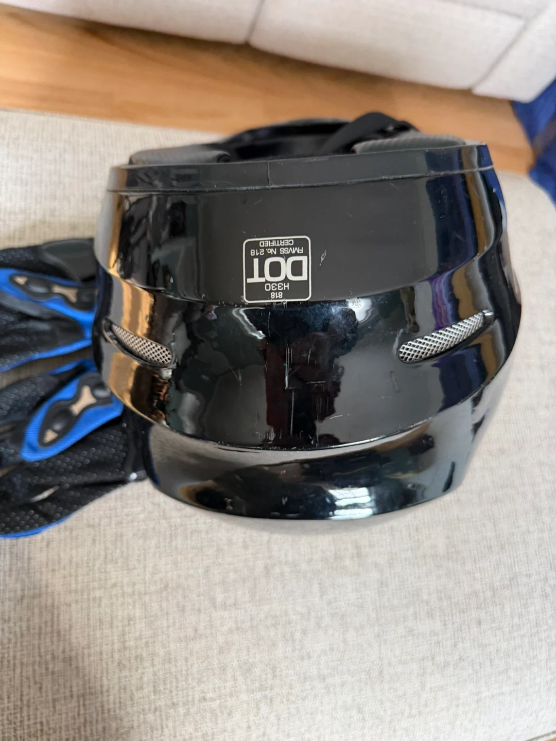 This is a black motorcycle helmet with a clear visor. It's DOT certified. Comes with a pair of blue and black motorcycle gloves. Ideal for riders looking for protective gear.
